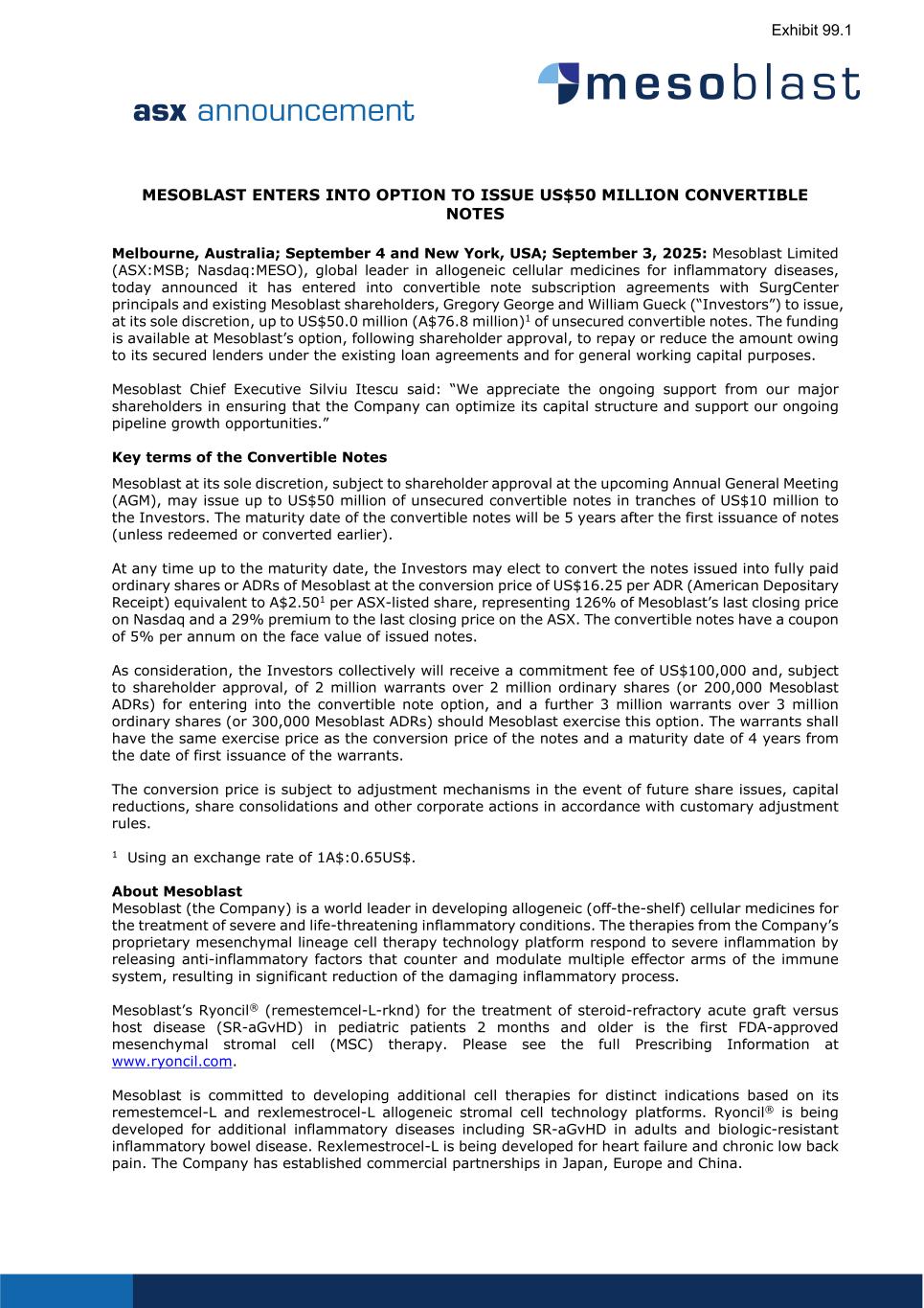 MESOBLAST ENTERS INTO OPTION TO ISSUE US$50 MILLION CONVERTIBLE NOTES Melbourne, Australia; September 4 and New York, USA; September 3, 2025: Mesoblast Limited (ASX:MSB; Nasdaq:MESO), global leader in allogeneic cellular medicines for inflammatory diseases, today announced it has entered into convertible note subscription agreements with SurgCenter principals and existing Mesoblast shareholders, Gregory George and William Gueck (“Investors”) to issue, at its sole discretion, up to US$50.0 million (A$76.8 million)1 of unsecured convertible notes. The funding is available at Mesoblast’s option, following shareholder approval, to repay or reduce the amount owing to its secured lenders under the existing loan agreements and for general working capital purposes. Mesoblast Chief Executive Silviu Itescu said: “We appreciate the ongoing support from our major shareholders in ensuring that the Company can optimize its capital structure and support our ongoing pipeline growth opportunities.” Key terms of the Convertible Notes Mesoblast at its sole discretion, subject to shareholder approval at the upcoming Annual General Meeting (AGM), may issue up to US$50 million of unsecured convertible notes in tranches of US$10 million to the Investors. The maturity date of the convertible notes will be 5 years after the first issuance of notes (unless redeemed or converted earlier). At any time up to the maturity date, the Investors may elect to convert the notes issued into fully paid ordinary shares or ADRs of Mesoblast at the conversion price of US$16.25 per ADR (American Depositary Receipt) equivalent to A$2.501 per ASX-listed share, representing 126% of Mesoblast’s last closing price on Nasdaq and a 29% premium to the last closing price on the ASX. The convertible notes have a coupon of 5% per annum on the face value of issued notes. As consideration, the Investors collectively will receive a commitment fee of US$100,000 and, subject to shareholder approval, of 2 million warrants over 2 million ordinary shares (or 200,000 Mesoblast ADRs) for entering into the convertible note option, and a further 3 million warrants over 3 million ordinary shares (or 300,000 Mesoblast ADRs) should Mesoblast exercise this option. The warrants shall have the same exercise price as the conversion price of the notes and a maturity date of 4 years from the date of first issuance of the warrants. The conversion price is subject to adjustment mechanisms in the event of future share issues, capital reductions, share consolidations and other corporate actions in accordance with customary adjustment rules. 1 Using an exchange rate of 1A$:0.65US$. About Mesoblast Mesoblast (the Company) is a world leader in developing allogeneic (off-the-shelf) cellular medicines for the treatment of severe and life-threatening inflammatory conditions. The therapies from the Company’s proprietary mesenchymal lineage cell therapy technology platform respond to severe inflammation by releasing anti-inflammatory factors that counter and modulate multiple effector arms of the immune system, resulting in significant reduction of the damaging inflammatory process. Mesoblast’s Ryoncil® (remestemcel-L-rknd) for the treatment of steroid-refractory acute graft versus host disease (SR-aGvHD) in pediatric patients 2 months and older is the first FDA-approved mesenchymal stromal cell (MSC) therapy. Please see the full Prescribing Information at www.ryoncil.com. Mesoblast is committed to developing additional cell therapies for distinct indications based on its remestemcel-L and rexlemestrocel-L allogeneic stromal cell technology platforms. Ryoncil® is being developed for additional inflammatory diseases including SR-aGvHD in adults and biologic-resistant inflammatory bowel disease. Rexlemestrocel-L is being developed for heart failure and chronic low back pain. The Company has established commercial partnerships in Japan, Europe and China.