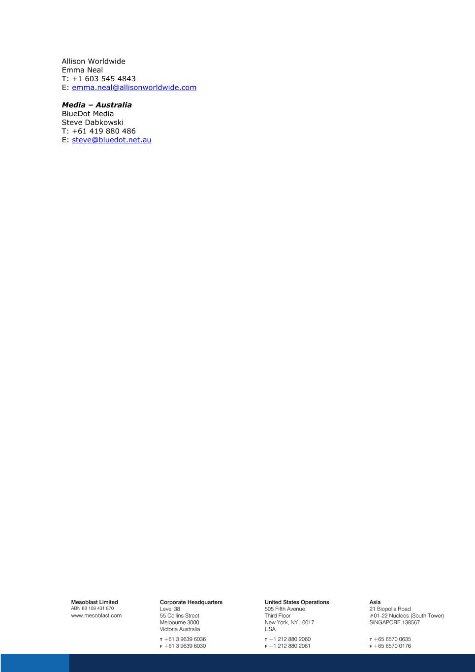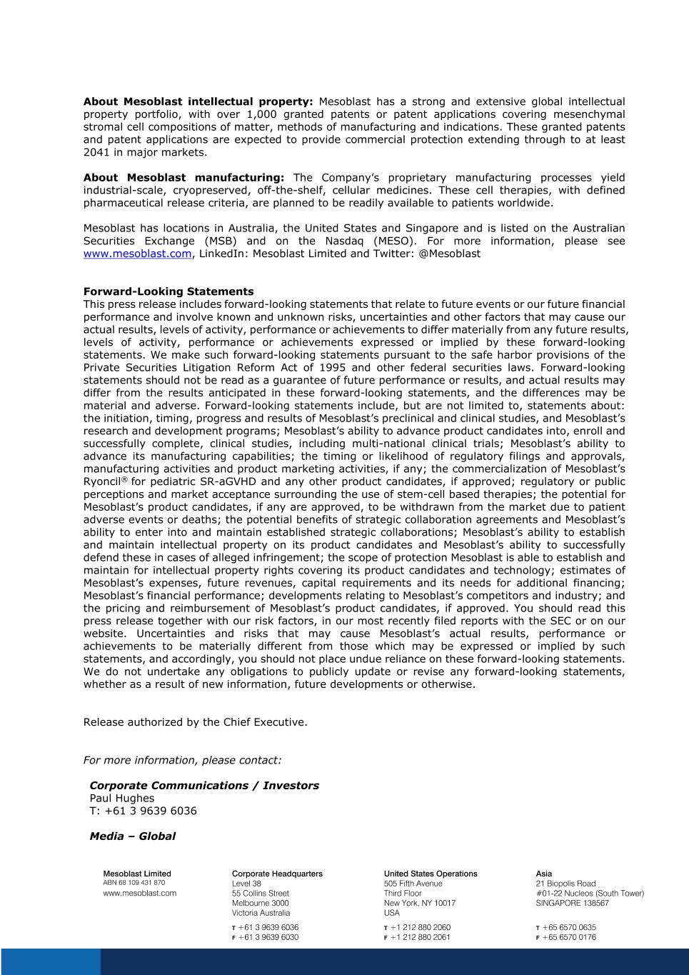 About Mesoblast intellectual property: Mesoblast has a strong and extensive global intellectual property portfolio, with over 1,000 granted patents or patent applications covering mesenchymal stromal cell compositions of matter, methods of manufacturing and indications. These granted patents and patent applications are expected to provide commercial protection extending through to at least 2041 in major markets. About Mesoblast manufacturing: The Company’s proprietary manufacturing processes yield industrial-scale, cryopreserved, off-the-shelf, cellular medicines. These cell therapies, with defined pharmaceutical release criteria, are planned to be readily available to patients worldwide. Mesoblast has locations in Australia, the United States and Singapore and is listed on the Australian Securities Exchange (MSB) and on the Nasdaq (MESO). For more information, please see www.mesoblast.com, LinkedIn: Mesoblast Limited and Twitter: @Mesoblast Forward-Looking Statements This press release includes forward-looking statements that relate to future events or our future financial performance and involve known and unknown risks, uncertainties and other factors that may cause our actual results, levels of activity, performance or achievements to differ materially from any future results, levels of activity, performance or achievements expressed or implied by these forward-looking statements. We make such forward-looking statements pursuant to the safe harbor provisions of the Private Securities Litigation Reform Act of 1995 and other federal securities laws. Forward-looking statements should not be read as a guarantee of future performance or results, and actual results may differ from the results anticipated in these forward-looking statements, and the differences may be material and adverse. Forward-looking statements include, but are not limited to, statements about: the initiation, timing, progress and results of Mesoblast’s preclinical and clinical studies, and Mesoblast’s research and development programs; Mesoblast’s ability to advance product candidates into, enroll and successfully complete, clinical studies, including multi-national clinical trials; Mesoblast’s ability to advance its manufacturing capabilities; the timing or likelihood of regulatory filings and approvals, manufacturing activities and product marketing activities, if any; the commercialization of Mesoblast’s Ryoncil® for pediatric SR-aGVHD and any other product candidates, if approved; regulatory or public perceptions and market acceptance surrounding the use of stem-cell based therapies; the potential for Mesoblast’s product candidates, if any are approved, to be withdrawn from the market due to patient adverse events or deaths; the potential benefits of strategic collaboration agreements and Mesoblast’s ability to enter into and maintain established strategic collaborations; Mesoblast’s ability to establish and maintain intellectual property on its product candidates and Mesoblast’s ability to successfully defend these in cases of alleged infringement; the scope of protection Mesoblast is able to establish and maintain for intellectual property rights covering its product candidates and technology; estimates of Mesoblast’s expenses, future revenues, capital requirements and its needs for additional financing; Mesoblast’s financial performance; developments relating to Mesoblast’s competitors and industry; and the pricing and reimbursement of Mesoblast’s product candidates, if approved. You should read this press release together with our risk factors, in our most recently filed reports with the SEC or on our website. Uncertainties and risks that may cause Mesoblast’s actual results, performance or achievements to be materially different from those which may be expressed or implied by such statements, and accordingly, you should not place undue reliance on these forward-looking statements. We do not undertake any obligations to publicly update or revise any forward-looking statements, whether as a result of new information, future developments or otherwise. Release authorized by the Chief Executive. For more information, please contact: Corporate Communications / Investors Paul Hughes T: +61 3 9639 6036 Media – Global