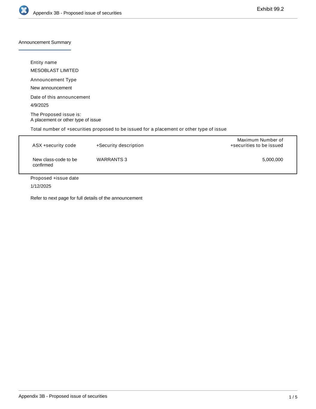 Appendix 3B - Proposed issue of securities Appendix 3B - Proposed issue of securities 1 / 5 Announcement Summary Entity name MESOBLAST LIMITED Announcement Type New announcement Date of this announcement 4/9/2025 The Proposed issue is: Total number of +securities proposed to be issued for a placement or other type of issue ASX +security code +Security description Maximum Number of +securities to be issued New class-code to be confirmed WARRANTS 3 5,000,000 Proposed +issue date 1/12/2025 Refer to next page for full details of the announcement A placement or other type of issue