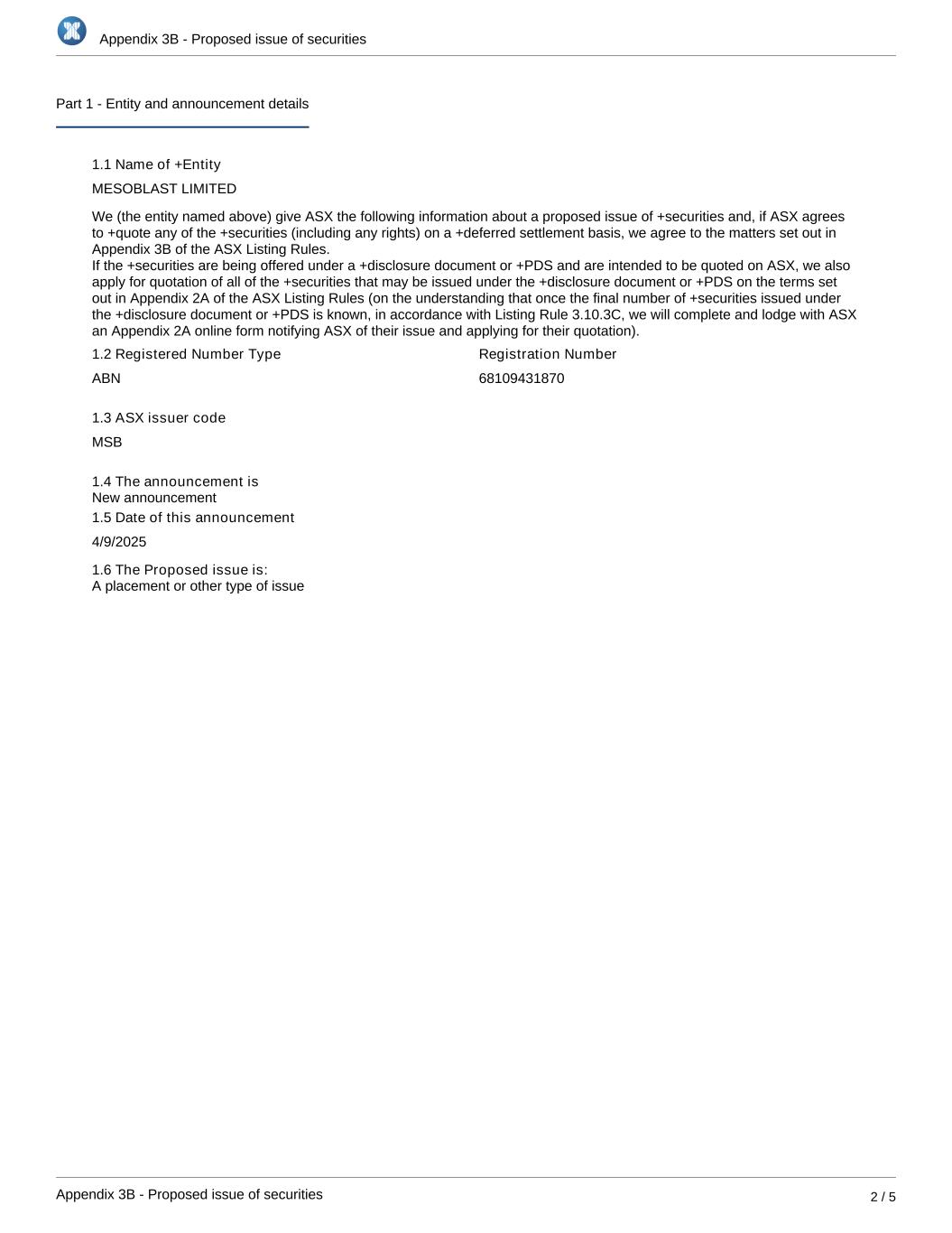 Appendix 3B - Proposed issue of securities Appendix 3B - Proposed issue of securities 2 / 5 Part 1 - Entity and announcement details 1.1 Name of +Entity MESOBLAST LIMITED We (the entity named above) give ASX the following information about a proposed issue of +securities and, if ASX agrees to +quote any of the +securities (including any rights) on a +deferred settlement basis, we agree to the matters set out in Appendix 3B of the ASX Listing Rules. If the +securities are being offered under a +disclosure document or +PDS and are intended to be quoted on ASX, we also apply for quotation of all of the +securities that may be issued under the +disclosure document or +PDS on the terms set out in Appendix 2A of the ASX Listing Rules (on the understanding that once the final number of +securities issued under the +disclosure document or +PDS is known, in accordance with Listing Rule 3.10.3C, we will complete and lodge with ASX an Appendix 2A online form notifying ASX of their issue and applying for their quotation). 1.2 Registered Number Type ABN Registration Number 68109431870 1.3 ASX issuer code MSB 1.4 The announcement is 1.5 Date of this announcement 4/9/2025 1.6 The Proposed issue is: A placement or other type of issue New announcement