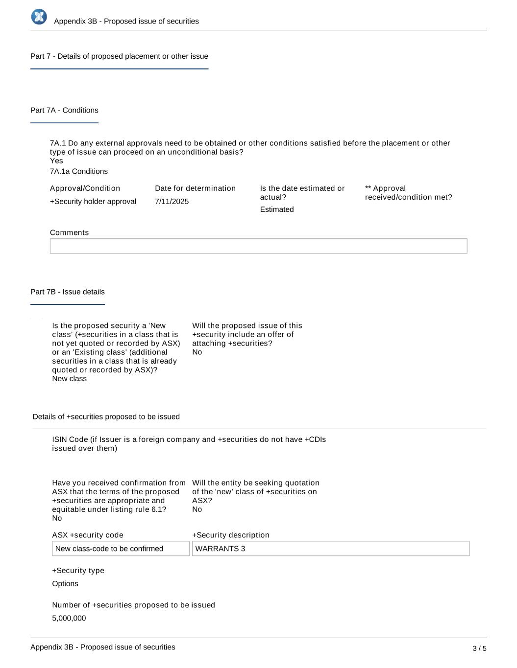 Appendix 3B - Proposed issue of securities Appendix 3B - Proposed issue of securities 3 / 5 Part 7 - Details of proposed placement or other issue Part 7A - Conditions 7A.1 Do any external approvals need to be obtained or other conditions satisfied before the placement or other type of issue can proceed on an unconditional basis? 7A.1a Conditions Approval/Condition +Security holder approval Date for determination 7/11/2025 Is the date estimated or actual? ** Approval received/condition met? Comments Part 7B - Issue details Is the proposed security a 'New class' (+securities in a class that is not yet quoted or recorded by ASX) or an 'Existing class' (additional securities in a class that is already quoted or recorded by ASX)? Will the proposed issue of this +security include an offer of attaching +securities? Details of +securities proposed to be issued ISIN Code (if Issuer is a foreign company and +securities do not have +CDIs issued over them) Have you received confirmation from ASX that the terms of the proposed +securities are appropriate and equitable under listing rule 6.1? Will the entity be seeking quotation of the 'new' class of +securities on ASX? ASX +security code New class-code to be confirmed +Security description WARRANTS 3 +Security type Options Number of +securities proposed to be issued 5,000,000 Offer price details No No No New class Estimated Yes