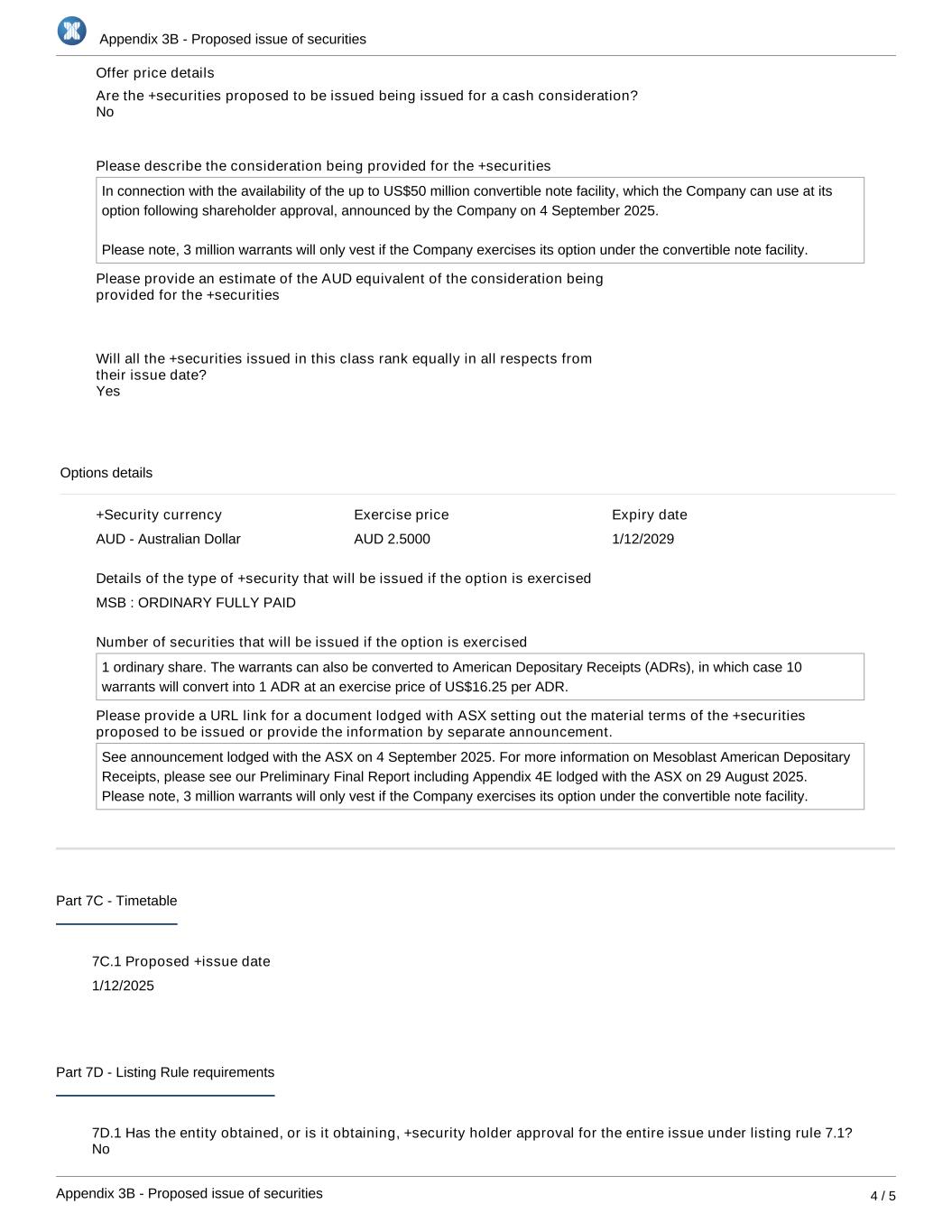 Appendix 3B - Proposed issue of securities Appendix 3B - Proposed issue of securities 4 / 5 Offer price details Are the +securities proposed to be issued being issued for a cash consideration? Please describe the consideration being provided for the +securities In connection with the availability of the up to US$50 million convertible note facility, which the Company can use at its option following shareholder approval, announced by the Company on 4 September 2025. Please note, 3 million warrants will only vest if the Company exercises its option under the convertible note facility. Please provide an estimate of the AUD equivalent of the consideration being provided for the +securities Will all the +securities issued in this class rank equally in all respects from their issue date? Options details +Security currency AUD - Australian Dollar Exercise price AUD 2.5000 Expiry date 1/12/2029 Details of the type of +security that will be issued if the option is exercised MSB : ORDINARY FULLY PAID Number of securities that will be issued if the option is exercised 1 ordinary share. The warrants can also be converted to American Depositary Receipts (ADRs), in which case 10 warrants will convert into 1 ADR at an exercise price of US$16.25 per ADR. Please provide a URL link for a document lodged with ASX setting out the material terms of the +securities proposed to be issued or provide the information by separate announcement. See announcement lodged with the ASX on 4 September 2025. For more information on Mesoblast American Depositary Receipts, please see our Preliminary Final Report including Appendix 4E lodged with the ASX on 29 August 2025. Please note, 3 million warrants will only vest if the Company exercises its option under the convertible note facility. Part 7C - Timetable 7C.1 Proposed +issue date 1/12/2025 Part 7D - Listing Rule requirements 7D.1 Has the entity obtained, or is it obtaining, +security holder approval for the entire issue under listing rule 7.1? 7D.1b Are any of the +securities proposed to be issued without +security holder approval using the entity's 15% No Yes No