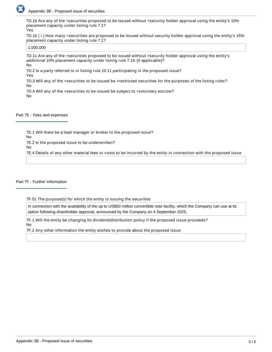 Appendix 3B - Proposed issue of securities Appendix 3B - Proposed issue of securities 5 / 5 7D.1b Are any of the +securities proposed to be issued without +security holder approval using the entity's 15% placement capacity under listing rule 7.1? 7D.1b ( i ) How many +securities are proposed to be issued without security holder approval using the entity's 15% placement capacity under listing rule 7.1? 1,000,000 7D.1c Are any of the +securities proposed to be issued without +security holder approval using the entity's additional 10% placement capacity under listing rule 7.1A (if applicable)? 7D.2 Is a party referred to in listing rule 10.11 participating in the proposed issue? 7D.3 Will any of the +securities to be issued be +restricted securities for the purposes of the listing rules? 7D.4 Will any of the +securities to be issued be subject to +voluntary escrow? Part 7E - Fees and expenses 7E.1 Will there be a lead manager or broker to the proposed issue? 7E.2 Is the proposed issue to be underwritten? 7E.4 Details of any other material fees or costs to be incurred by the entity in connection with the proposed issue Part 7F - Further Information 7F.01 The purpose(s) for which the entity is issuing the securities In connection with the availability of the up to US$50 million convertible note facility, which the Company can use at its option following shareholder approval, announced by the Company on 4 September 2025. 7F.1 Will the entity be changing its dividend/distribution policy if the proposed issue proceeds? 7F.2 Any other information the entity wishes to provide about the proposed issue No No No No No Yes No Yes