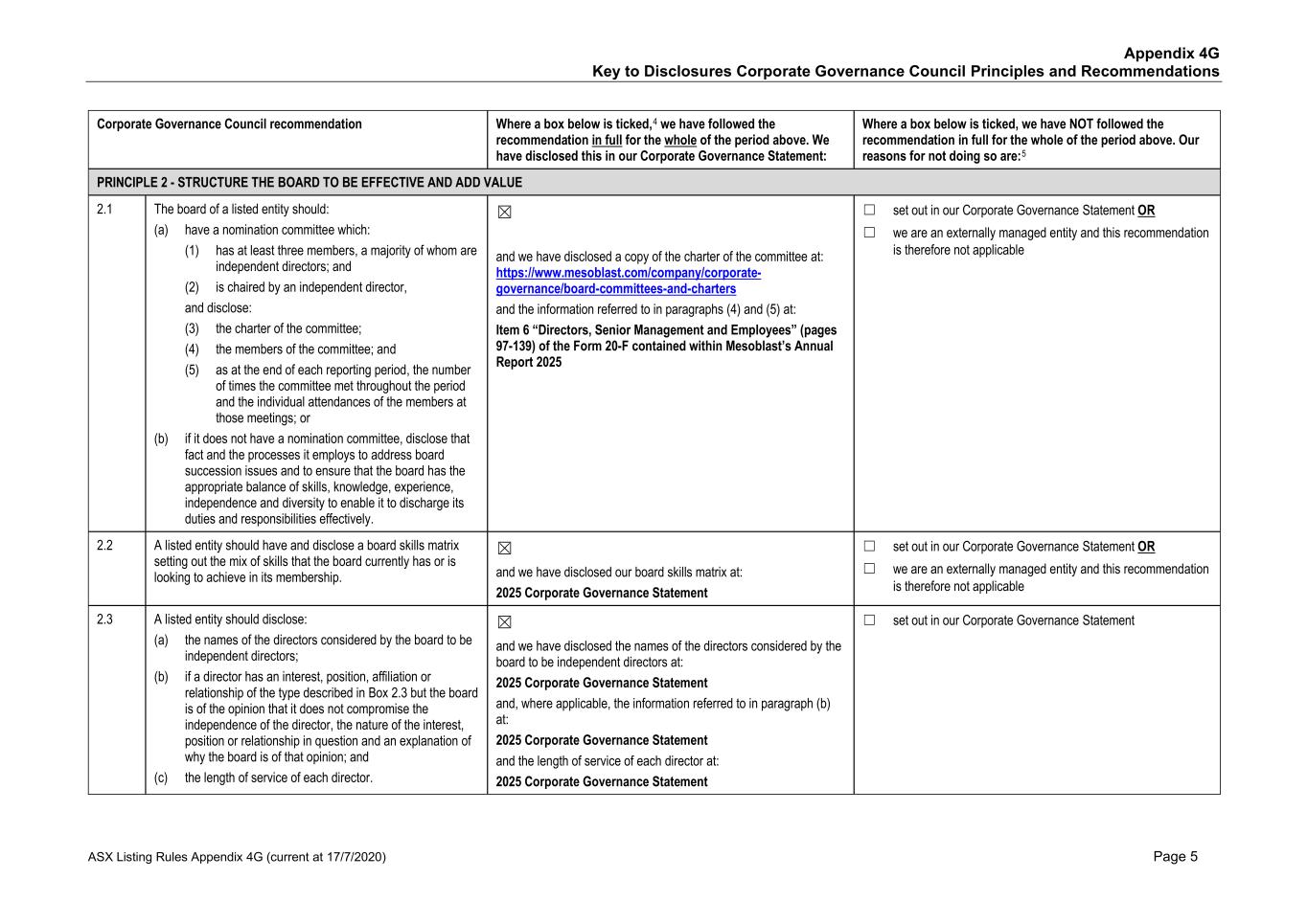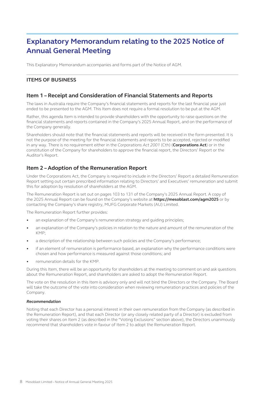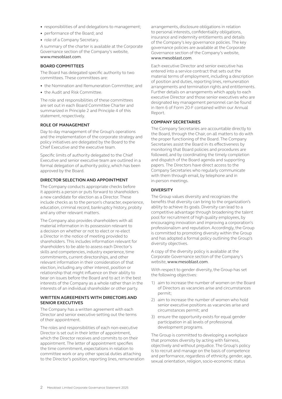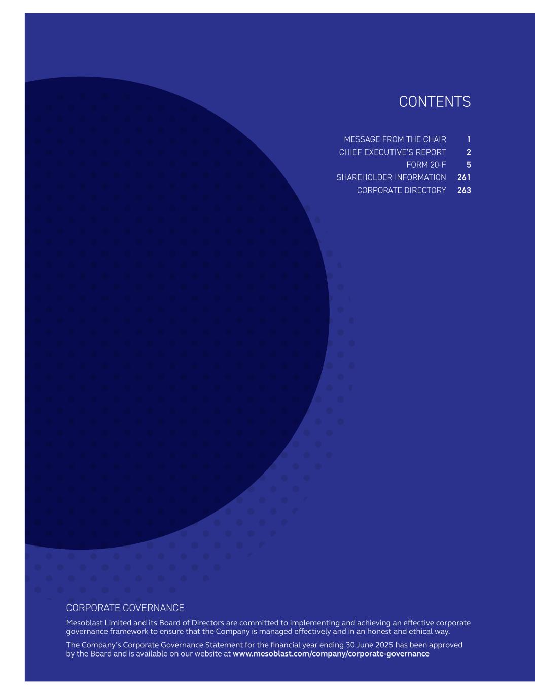 CORPORATE GOVERNANCE Mesoblast Limited and its Board of Directors are committed to implementing and achieving an effective corporate governance framework to ensure that the Company is managed effectively and in an honest and ethical way. The Company’s Corporate Governance Statement for the financial year ending 30 June 2025 has been approved by the Board and is available on our website at www.mesoblast.com/company/corporate-governance CONTENTS MESSAGE FROM THE CHAIR 1 CHIEF EXECUTIVE’S REPORT 2 FORM 20-F 5 SHAREHOLDER INFORMATION 261 CORPORATE DIRECTORY 263