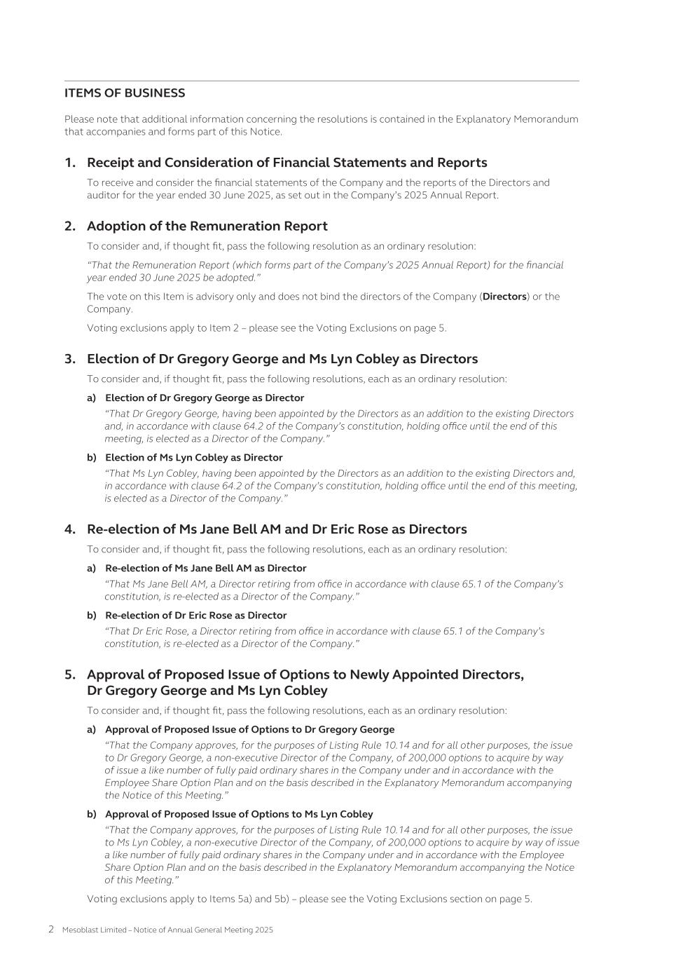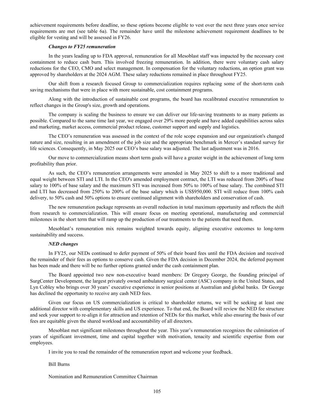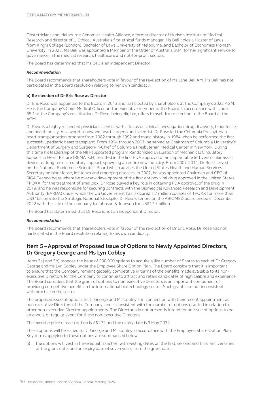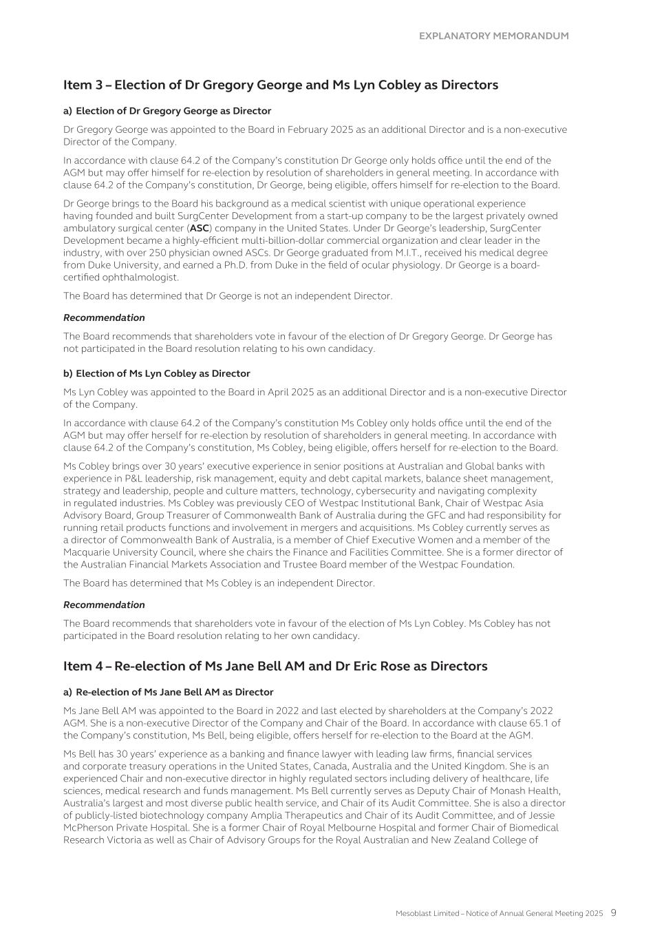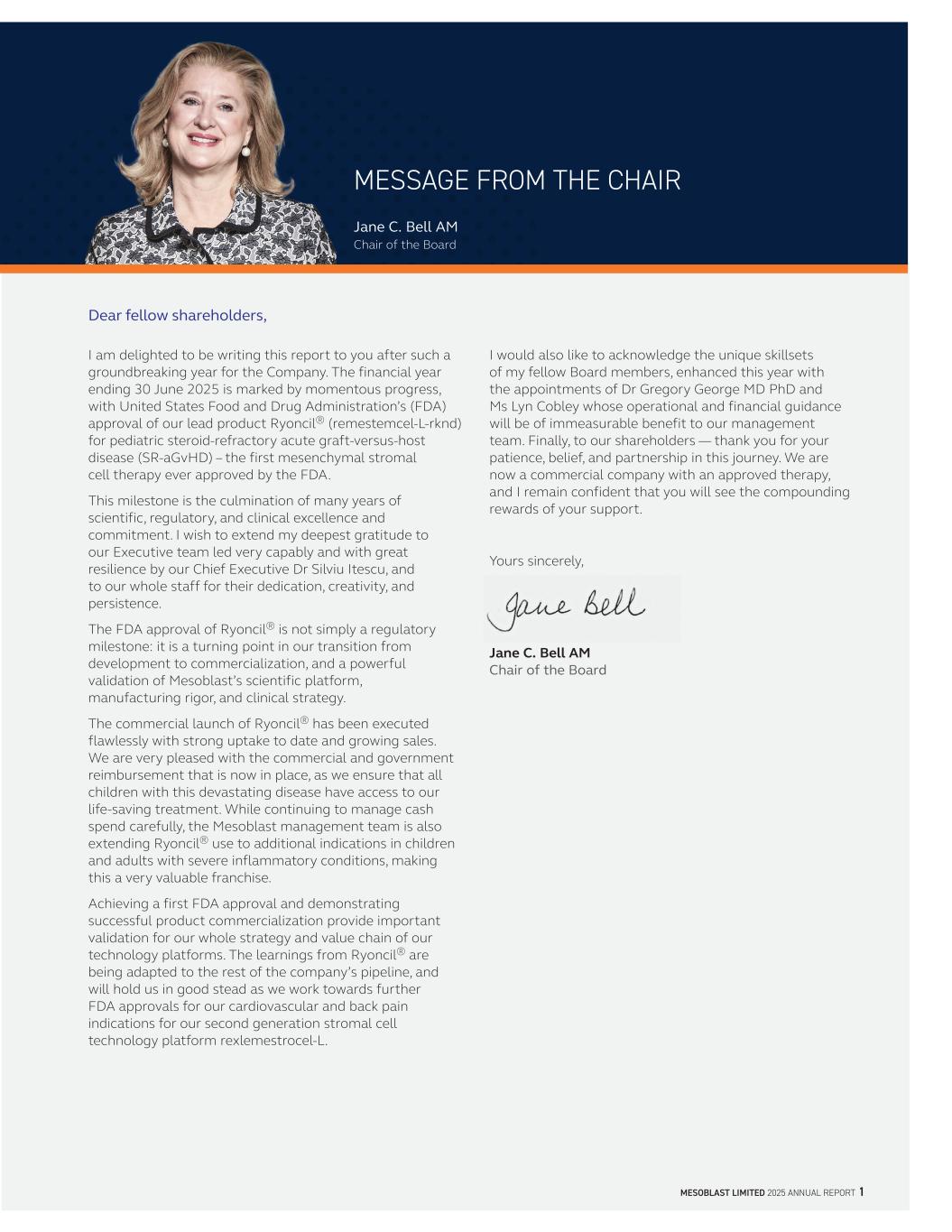 MESOBLAST LIMITED 2025 ANNUAL REPORT 1 MESSAGE FROM THE CHAIR Dear fellow shareholders, I am delighted to be writing this report to you after such a groundbreaking year for the Company. The financial year ending 30 June 2025 is marked by momentous progress, with United States Food and Drug Administration’s (FDA) approval of our lead product Ryoncil® (remestemcel-L-rknd) for pediatric steroid-refractory acute graft-versus-host disease (SR-aGvHD) – the first mesenchymal stromal cell therapy ever approved by the FDA. This milestone is the culmination of many years of scientific, regulatory, and clinical excellence and commitment. I wish to extend my deepest gratitude to our Executive team led very capably and with great resilience by our Chief Executive Dr Silviu Itescu, and to our whole staff for their dedication, creativity, and persistence. The FDA approval of Ryoncil® is not simply a regulatory milestone: it is a turning point in our transition from development to commercialization, and a powerful validation of Mesoblast’s scientific platform, manufacturing rigor, and clinical strategy. The commercial launch of Ryoncil® has been executed flawlessly with strong uptake to date and growing sales. We are very pleased with the commercial and government reimbursement that is now in place, as we ensure that all children with this devastating disease have access to our life-saving treatment. While continuing to manage cash spend carefully, the Mesoblast management team is also extending Ryoncil® use to additional indications in children and adults with severe inflammatory conditions, making this a very valuable franchise. Achieving a first FDA approval and demonstrating successful product commercialization provide important validation for our whole strategy and value chain of our technology platforms. The learnings from Ryoncil® are being adapted to the rest of the company’s pipeline, and will hold us in good stead as we work towards further FDA approvals for our cardiovascular and back pain indications for our second generation stromal cell technology platform rexlemestrocel-L. I would also like to acknowledge the unique skillsets of my fellow Board members, enhanced this year with the appointments of Dr Gregory George MD PhD and Ms Lyn Cobley whose operational and financial guidance will be of immeasurable benefit to our management team. Finally, to our shareholders — thank you for your patience, belief, and partnership in this journey. We are now a commercial company with an approved therapy, and I remain confident that you will see the compounding rewards of your support. Yours sincerely, Jane C. Bell AM Chair of the Board Jane C. Bell AM Chair of the Board