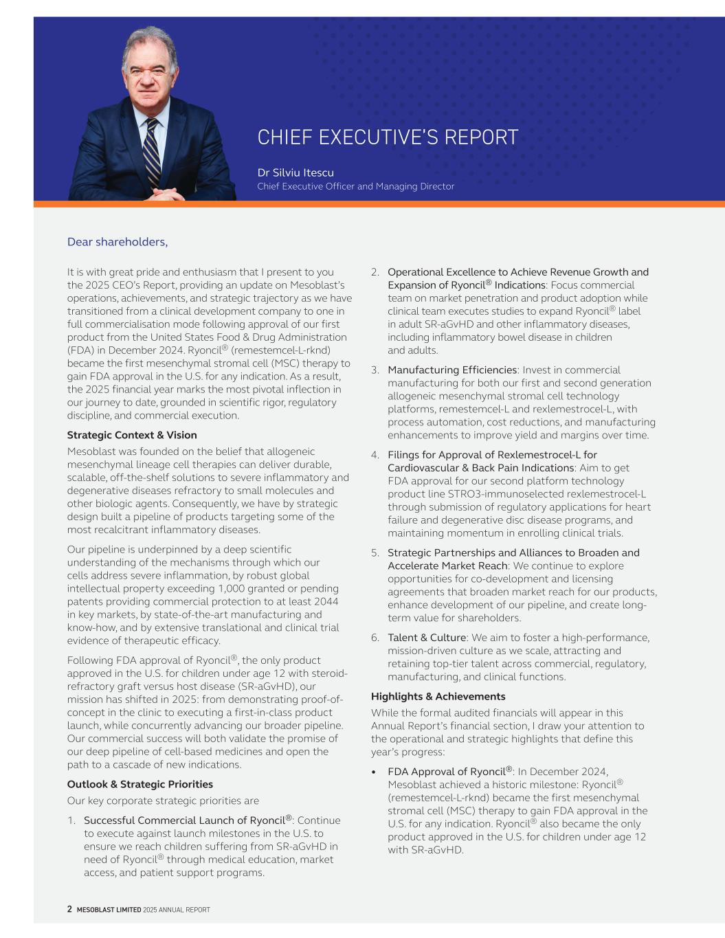 CHIEF EXECUTIVE’S REPORT Dr Silviu Itescu Chief Executive Officer and Managing Director 2 MESOBLAST LIMITED 2025 ANNUAL REPORT Dear shareholders, It is with great pride and enthusiasm that I present to you the 2025 CEO’s Report, providing an update on Mesoblast’s operations, achievements, and strategic trajectory as we have transitioned from a clinical development company to one in full commercialisation mode following approval of our first product from the United States Food & Drug Administration (FDA) in December 2024. Ryoncil® (remestemcel-L-rknd) became the first mesenchymal stromal cell (MSC) therapy to gain FDA approval in the U.S. for any indication. As a result, the 2025 financial year marks the most pivotal inflection in our journey to date, grounded in scientific rigor, regulatory discipline, and commercial execution. Strategic Context & Vision Mesoblast was founded on the belief that allogeneic mesenchymal lineage cell therapies can deliver durable, scalable, off-the-shelf solutions to severe inflammatory and degenerative diseases refractory to small molecules and other biologic agents. Consequently, we have by strategic design built a pipeline of products targeting some of the most recalcitrant inflammatory diseases. Our pipeline is underpinned by a deep scientific understanding of the mechanisms through which our cells address severe inflammation, by robust global intellectual property exceeding 1,000 granted or pending patents providing commercial protection to at least 2044 in key markets, by state-of-the-art manufacturing and know-how, and by extensive translational and clinical trial evidence of therapeutic efficacy. Following FDA approval of Ryoncil®, the only product approved in the U.S. for children under age 12 with steroid- refractory graft versus host disease (SR-aGvHD), our mission has shifted in 2025: from demonstrating proof-of- concept in the clinic to executing a first-in-class product launch, while concurrently advancing our broader pipeline. Our commercial success will both validate the promise of our deep pipeline of cell-based medicines and open the path to a cascade of new indications. Outlook & Strategic Priorities Our key corporate strategic priorities are 1. Successful Commercial Launch of Ryoncil®: Continue to execute against launch milestones in the U.S. to ensure we reach children suffering from SR-aGvHD in need of Ryoncil® through medical education, market access, and patient support programs. 2. Operational Excellence to Achieve Revenue Growth and Expansion of Ryoncil® Indications: Focus commercial team on market penetration and product adoption while clinical team executes studies to expand Ryoncil® label in adult SR-aGvHD and other inflammatory diseases, including inflammatory bowel disease in children and adults. 3. Manufacturing Efficiencies: Invest in commercial manufacturing for both our first and second generation allogeneic mesenchymal stromal cell technology platforms, remestemcel-L and rexlemestrocel-L, with process automation, cost reductions, and manufacturing enhancements to improve yield and margins over time. 4. Filings for Approval of Rexlemestrocel-L for Cardiovascular & Back Pain Indications: Aim to get FDA approval for our second platform technology product line STRO3-immunoselected rexlemestrocel-L through submission of regulatory applications for heart failure and degenerative disc disease programs, and maintaining momentum in enrolling clinical trials. 5. Strategic Partnerships and Alliances to Broaden and Accelerate Market Reach: We continue to explore opportunities for co-development and licensing agreements that broaden market reach for our products, enhance development of our pipeline, and create long- term value for shareholders. 6. Talent & Culture: We aim to foster a high-performance, mission-driven culture as we scale, attracting and retaining top-tier talent across commercial, regulatory, manufacturing, and clinical functions. Highlights & Achievements While the formal audited financials will appear in this Annual Report’s financial section, I draw your attention to the operational and strategic highlights that define this year’s progress: • FDA Approval of Ryoncil®: In December 2024, Mesoblast achieved a historic milestone: Ryoncil® (remestemcel-L-rknd) became the first mesenchymal stromal cell (MSC) therapy to gain FDA approval in the U.S. for any indication. Ryoncil® also became the only product approved in the U.S. for children under age 12 with SR-aGvHD.