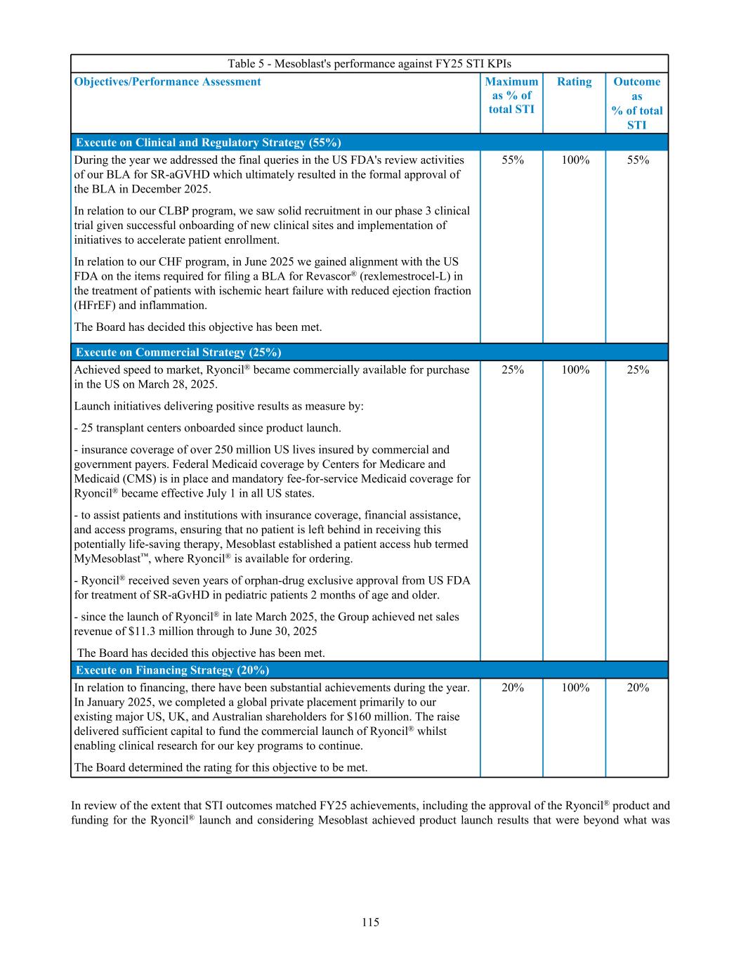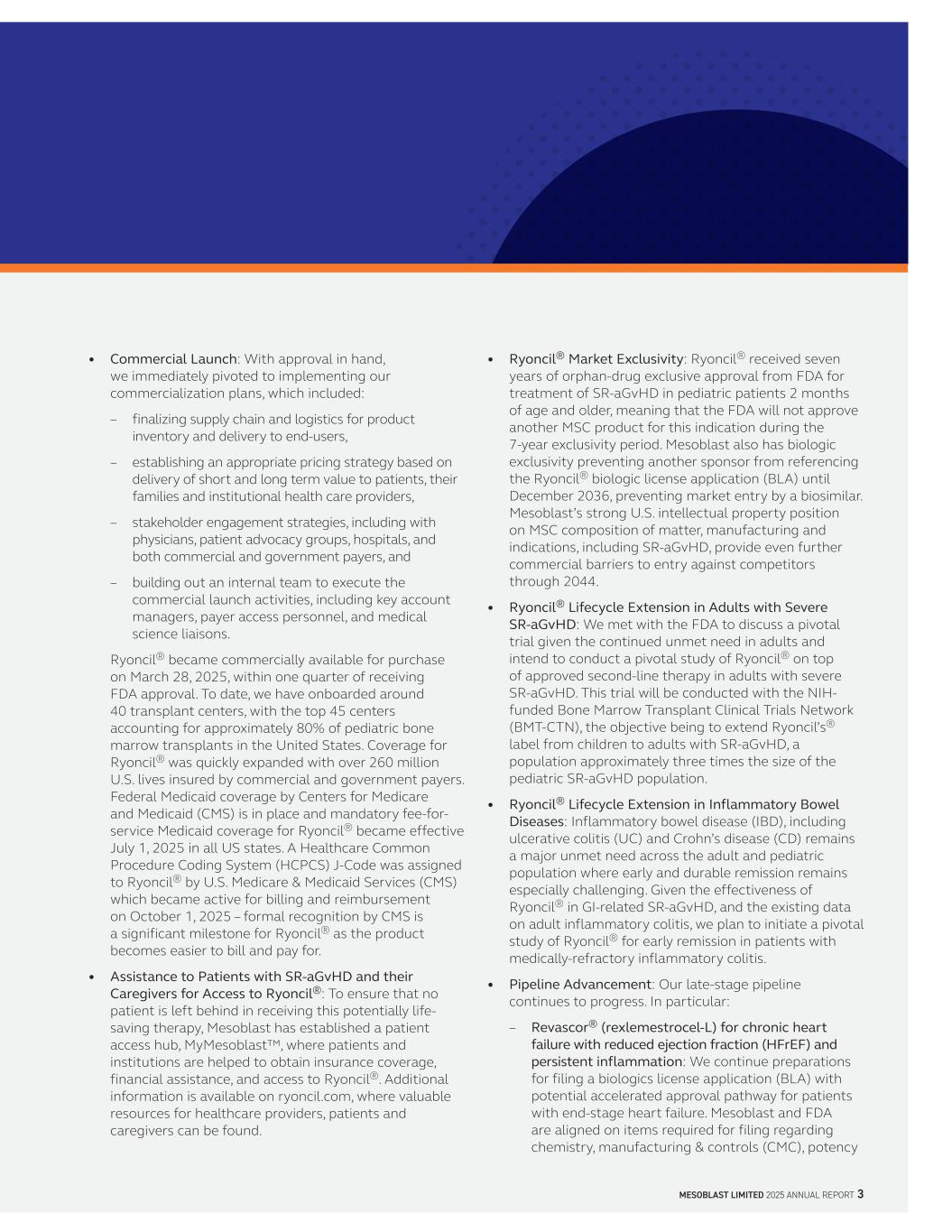 MESOBLAST LIMITED 2025 ANNUAL REPORT 3 • Commercial Launch: With approval in hand, we immediately pivoted to implementing our commercialization plans, which included: – finalizing supply chain and logistics for product inventory and delivery to end-users, – establishing an appropriate pricing strategy based on delivery of short and long term value to patients, their families and institutional health care providers, – stakeholder engagement strategies, including with physicians, patient advocacy groups, hospitals, and both commercial and government payers, and – building out an internal team to execute the commercial launch activities, including key account managers, payer access personnel, and medical science liaisons. Ryoncil® became commercially available for purchase on March 28, 2025, within one quarter of receiving FDA approval. To date, we have onboarded around 40 transplant centers, with the top 45 centers accounting for approximately 80% of pediatric bone marrow transplants in the United States. Coverage for Ryoncil® was quickly expanded with over 260 million U.S. lives insured by commercial and government payers. Federal Medicaid coverage by Centers for Medicare and Medicaid (CMS) is in place and mandatory fee-for- service Medicaid coverage for Ryoncil® became effective July 1, 2025 in all US states. A Healthcare Common Procedure Coding System (HCPCS) J-Code was assigned to Ryoncil® by U.S. Medicare & Medicaid Services (CMS) which became active for billing and reimbursement on October 1, 2025 – formal recognition by CMS is a significant milestone for Ryoncil® as the product becomes easier to bill and pay for. • Assistance to Patients with SR-aGvHD and their Caregivers for Access to Ryoncil®: To ensure that no patient is left behind in receiving this potentially life- saving therapy, Mesoblast has established a patient access hub, MyMesoblast™, where patients and institutions are helped to obtain insurance coverage, financial assistance, and access to Ryoncil®. Additional information is available on ryoncil.com, where valuable resources for healthcare providers, patients and caregivers can be found. • Ryoncil® Market Exclusivity: Ryoncil® received seven years of orphan-drug exclusive approval from FDA for treatment of SR-aGvHD in pediatric patients 2 months of age and older, meaning that the FDA will not approve another MSC product for this indication during the 7-year exclusivity period. Mesoblast also has biologic exclusivity preventing another sponsor from referencing the Ryoncil® biologic license application (BLA) until December 2036, preventing market entry by a biosimilar. Mesoblast’s strong U.S. intellectual property position on MSC composition of matter, manufacturing and indications, including SR-aGvHD, provide even further commercial barriers to entry against competitors through 2044. • Ryoncil® Lifecycle Extension in Adults with Severe SR-aGvHD: We met with the FDA to discuss a pivotal trial given the continued unmet need in adults and intend to conduct a pivotal study of Ryoncil® on top of approved second-line therapy in adults with severe SR-aGvHD. This trial will be conducted with the NIH- funded Bone Marrow Transplant Clinical Trials Network (BMT-CTN), the objective being to extend Ryoncil’s® label from children to adults with SR-aGvHD, a population approximately three times the size of the pediatric SR-aGvHD population. • Ryoncil® Lifecycle Extension in Inflammatory Bowel Diseases: Inflammatory bowel disease (IBD), including ulcerative colitis (UC) and Crohn’s disease (CD) remains a major unmet need across the adult and pediatric population where early and durable remission remains especially challenging. Given the effectiveness of Ryoncil® in GI-related SR-aGvHD, and the existing data on adult inflammatory colitis, we plan to initiate a pivotal study of Ryoncil® for early remission in patients with medically-refractory inflammatory colitis. • Pipeline Advancement: Our late-stage pipeline continues to progress. In particular: – Revascor® (rexlemestrocel-L) for chronic heart failure with reduced ejection fraction (HFrEF) and persistent inflammation: We continue preparations for filing a biologics license application (BLA) with potential accelerated approval pathway for patients with end-stage heart failure. Mesoblast and FDA are aligned on items required for filing regarding chemistry, manufacturing & controls (CMC), potency
