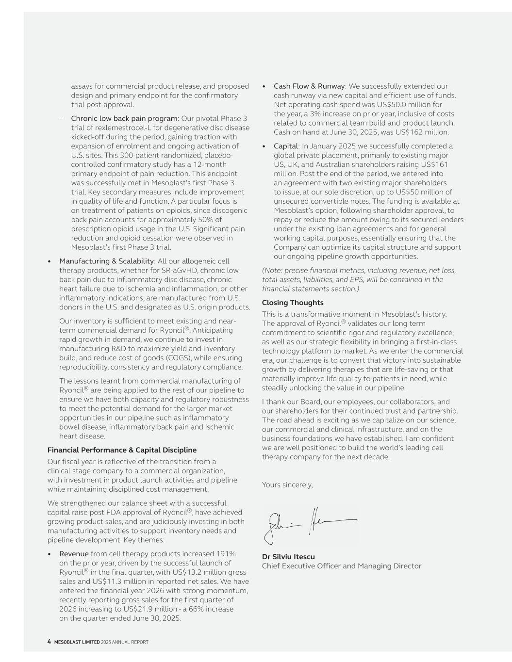 4 MESOBLAST LIMITED 2025 ANNUAL REPORT assays for commercial product release, and proposed design and primary endpoint for the confirmatory trial post-approval. – Chronic low back pain program: Our pivotal Phase 3 trial of rexlemestrocel-L for degenerative disc disease kicked-off during the period, gaining traction with expansion of enrolment and ongoing activation of U.S. sites. This 300-patient randomized, placebo- controlled confirmatory study has a 12-month primary endpoint of pain reduction. This endpoint was successfully met in Mesoblast’s first Phase 3 trial. Key secondary measures include improvement in quality of life and function. A particular focus is on treatment of patients on opioids, since discogenic back pain accounts for approximately 50% of prescription opioid usage in the U.S. Significant pain reduction and opioid cessation were observed in Mesoblast’s first Phase 3 trial. • Manufacturing & Scalability: All our allogeneic cell therapy products, whether for SR-aGvHD, chronic low back pain due to inflammatory disc disease, chronic heart failure due to ischemia and inflammation, or other inflammatory indications, are manufactured from U.S. donors in the U.S. and designated as U.S. origin products. Our inventory is sufficient to meet existing and near- term commercial demand for Ryoncil®. Anticipating rapid growth in demand, we continue to invest in manufacturing R&D to maximize yield and inventory build, and reduce cost of goods (COGS), while ensuring reproducibility, consistency and regulatory compliance. The lessons learnt from commercial manufacturing of Ryoncil® are being applied to the rest of our pipeline to ensure we have both capacity and regulatory robustness to meet the potential demand for the larger market opportunities in our pipeline such as inflammatory bowel disease, inflammatory back pain and ischemic heart disease. Financial Performance & Capital Discipline Our fiscal year is reflective of the transition from a clinical stage company to a commercial organization, with investment in product launch activities and pipeline while maintaining disciplined cost management. We strengthened our balance sheet with a successful capital raise post FDA approval of Ryoncil®, have achieved growing product sales, and are judiciously investing in both manufacturing activities to support inventory needs and pipeline development. Key themes: • Revenue from cell therapy products increased 191% on the prior year, driven by the successful launch of Ryoncil® in the final quarter, with US$13.2 million gross sales and US$11.3 million in reported net sales. We have entered the financial year 2026 with strong momentum, recently reporting gross sales for the first quarter of 2026 increasing to US$21.9 million - a 66% increase on the quarter ended June 30, 2025. • Cash Flow & Runway: We successfully extended our cash runway via new capital and efficient use of funds. Net operating cash spend was US$50.0 million for the year, a 3% increase on prior year, inclusive of costs related to commercial team build and product launch. Cash on hand at June 30, 2025, was US$162 million. • Capital: In January 2025 we successfully completed a global private placement, primarily to existing major US, UK, and Australian shareholders raising US$161 million. Post the end of the period, we entered into an agreement with two existing major shareholders to issue, at our sole discretion, up to US$50 million of unsecured convertible notes. The funding is available at Mesoblast’s option, following shareholder approval, to repay or reduce the amount owing to its secured lenders under the existing loan agreements and for general working capital purposes, essentially ensuring that the Company can optimize its capital structure and support our ongoing pipeline growth opportunities. (Note: precise financial metrics, including revenue, net loss, total assets, liabilities, and EPS, will be contained in the financial statements section.) Closing Thoughts This is a transformative moment in Mesoblast’s history. The approval of Ryoncil® validates our long term commitment to scientific rigor and regulatory excellence, as well as our strategic flexibility in bringing a first-in-class technology platform to market. As we enter the commercial era, our challenge is to convert that victory into sustainable growth by delivering therapies that are life-saving or that materially improve life quality to patients in need, while steadily unlocking the value in our pipeline. I thank our Board, our employees, our collaborators, and our shareholders for their continued trust and partnership. The road ahead is exciting as we capitalize on our science, our commercial and clinical infrastructure, and on the business foundations we have established. I am confident we are well positioned to build the world’s leading cell therapy company for the next decade. Yours sincerely, Dr Silviu Itescu Chief Executive Officer and Managing Director