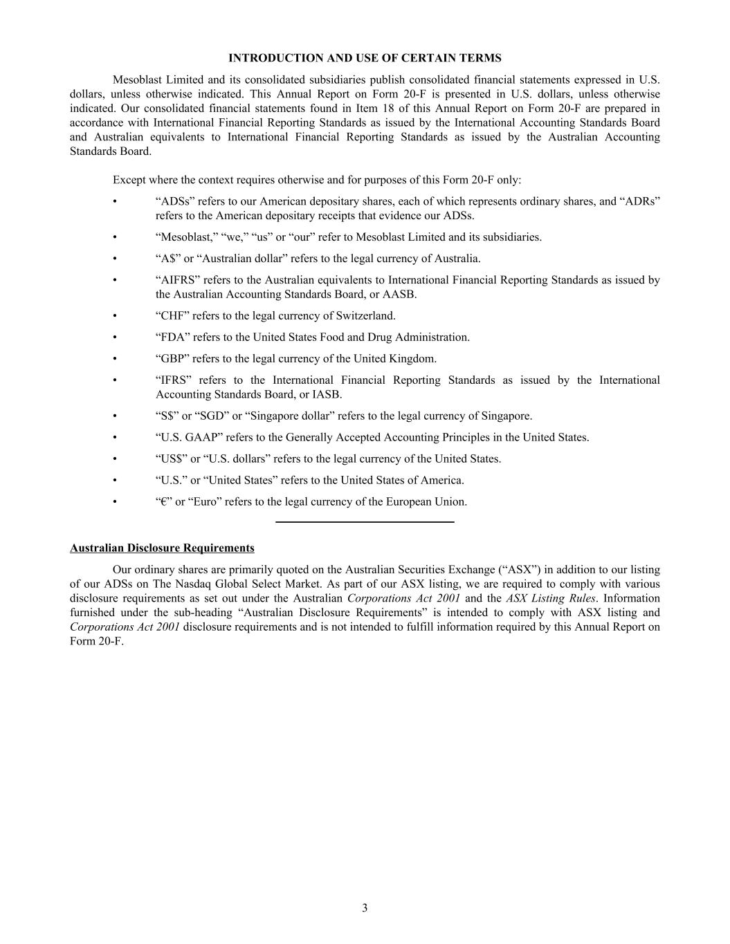 INTRODUCTION AND USE OF CERTAIN TERMS Mesoblast Limited and its consolidated subsidiaries publish consolidated financial statements expressed in U.S. dollars, unless otherwise indicated. This Annual Report on Form 20-F is presented in U.S. dollars, unless otherwise indicated. Our consolidated financial statements found in Item 18 of this Annual Report on Form 20-F are prepared in accordance with International Financial Reporting Standards as issued by the International Accounting Standards Board and Australian equivalents to International Financial Reporting Standards as issued by the Australian Accounting Standards Board. Except where the context requires otherwise and for purposes of this Form 20-F only: • “ADSs” refers to our American depositary shares, each of which represents ordinary shares, and “ADRs” refers to the American depositary receipts that evidence our ADSs. • “Mesoblast,” “we,” “us” or “our” refer to Mesoblast Limited and its subsidiaries. • “A$” or “Australian dollar” refers to the legal currency of Australia. • “AIFRS” refers to the Australian equivalents to International Financial Reporting Standards as issued by the Australian Accounting Standards Board, or AASB. • “CHF” refers to the legal currency of Switzerland. • “FDA” refers to the United States Food and Drug Administration. • “GBP” refers to the legal currency of the United Kingdom. • “IFRS” refers to the International Financial Reporting Standards as issued by the International Accounting Standards Board, or IASB. • “S$” or “SGD” or “Singapore dollar” refers to the legal currency of Singapore. • “U.S. GAAP” refers to the Generally Accepted Accounting Principles in the United States. • “US$” or “U.S. dollars” refers to the legal currency of the United States. • “U.S.” or “United States” refers to the United States of America. • “€” or “Euro” refers to the legal currency of the European Union. Australian Disclosure Requirements Our ordinary shares are primarily quoted on the Australian Securities Exchange (“ASX”) in addition to our listing of our ADSs on The Nasdaq Global Select Market. As part of our ASX listing, we are required to comply with various disclosure requirements as set out under the Australian Corporations Act 2001 and the ASX Listing Rules. Information furnished under the sub-heading “Australian Disclosure Requirements” is intended to comply with ASX listing and Corporations Act 2001 disclosure requirements and is not intended to fulfill information required by this Annual Report on Form 20-F. 3
