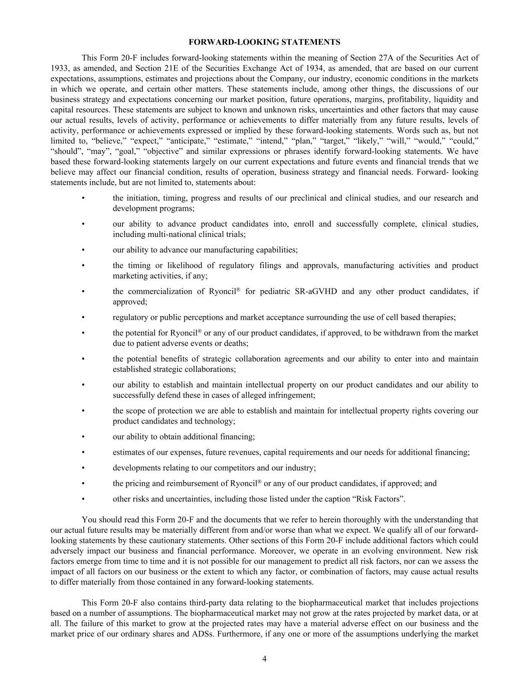 FORWARD-LOOKING STATEMENTS This Form 20-F includes forward-looking statements within the meaning of Section 27A of the Securities Act of 1933, as amended, and Section 21E of the Securities Exchange Act of 1934, as amended, that are based on our current expectations, assumptions, estimates and projections about the Company, our industry, economic conditions in the markets in which we operate, and certain other matters. These statements include, among other things, the discussions of our business strategy and expectations concerning our market position, future operations, margins, profitability, liquidity and capital resources. These statements are subject to known and unknown risks, uncertainties and other factors that may cause our actual results, levels of activity, performance or achievements to differ materially from any future results, levels of activity, performance or achievements expressed or implied by these forward-looking statements. Words such as, but not limited to, “believe,” “expect,” “anticipate,” “estimate,” “intend,” “plan,” “target,” “likely,” “will,” “would,” “could,” “should”, “may”, “goal,” “objective” and similar expressions or phrases identify forward-looking statements. We have based these forward-looking statements largely on our current expectations and future events and financial trends that we believe may affect our financial condition, results of operation, business strategy and financial needs. Forward- looking statements include, but are not limited to, statements about: • the initiation, timing, progress and results of our preclinical and clinical studies, and our research and development programs; • our ability to advance product candidates into, enroll and successfully complete, clinical studies, including multi-national clinical trials; • our ability to advance our manufacturing capabilities; • the timing or likelihood of regulatory filings and approvals, manufacturing activities and product marketing activities, if any; • the commercialization of Ryoncil® for pediatric SR-aGVHD and any other product candidates, if approved; • regulatory or public perceptions and market acceptance surrounding the use of cell based therapies; • the potential for Ryoncil® or any of our product candidates, if approved, to be withdrawn from the market due to patient adverse events or deaths; • the potential benefits of strategic collaboration agreements and our ability to enter into and maintain established strategic collaborations; • our ability to establish and maintain intellectual property on our product candidates and our ability to successfully defend these in cases of alleged infringement; • the scope of protection we are able to establish and maintain for intellectual property rights covering our product candidates and technology; • our ability to obtain additional financing; • estimates of our expenses, future revenues, capital requirements and our needs for additional financing; • developments relating to our competitors and our industry; • the pricing and reimbursement of Ryoncil® or any of our product candidates, if approved; and • other risks and uncertainties, including those listed under the caption “Risk Factors”. You should read this Form 20-F and the documents that we refer to herein thoroughly with the understanding that our actual future results may be materially different from and/or worse than what we expect. We qualify all of our forward- looking statements by these cautionary statements. Other sections of this Form 20-F include additional factors which could adversely impact our business and financial performance. Moreover, we operate in an evolving environment. New risk factors emerge from time to time and it is not possible for our management to predict all risk factors, nor can we assess the impact of all factors on our business or the extent to which any factor, or combination of factors, may cause actual results to differ materially from those contained in any forward-looking statements. This Form 20-F also contains third-party data relating to the biopharmaceutical market that includes projections based on a number of assumptions. The biopharmaceutical market may not grow at the rates projected by market data, or at all. The failure of this market to grow at the projected rates may have a material adverse effect on our business and the market price of our ordinary shares and ADSs. Furthermore, if any one or more of the assumptions underlying the market 4