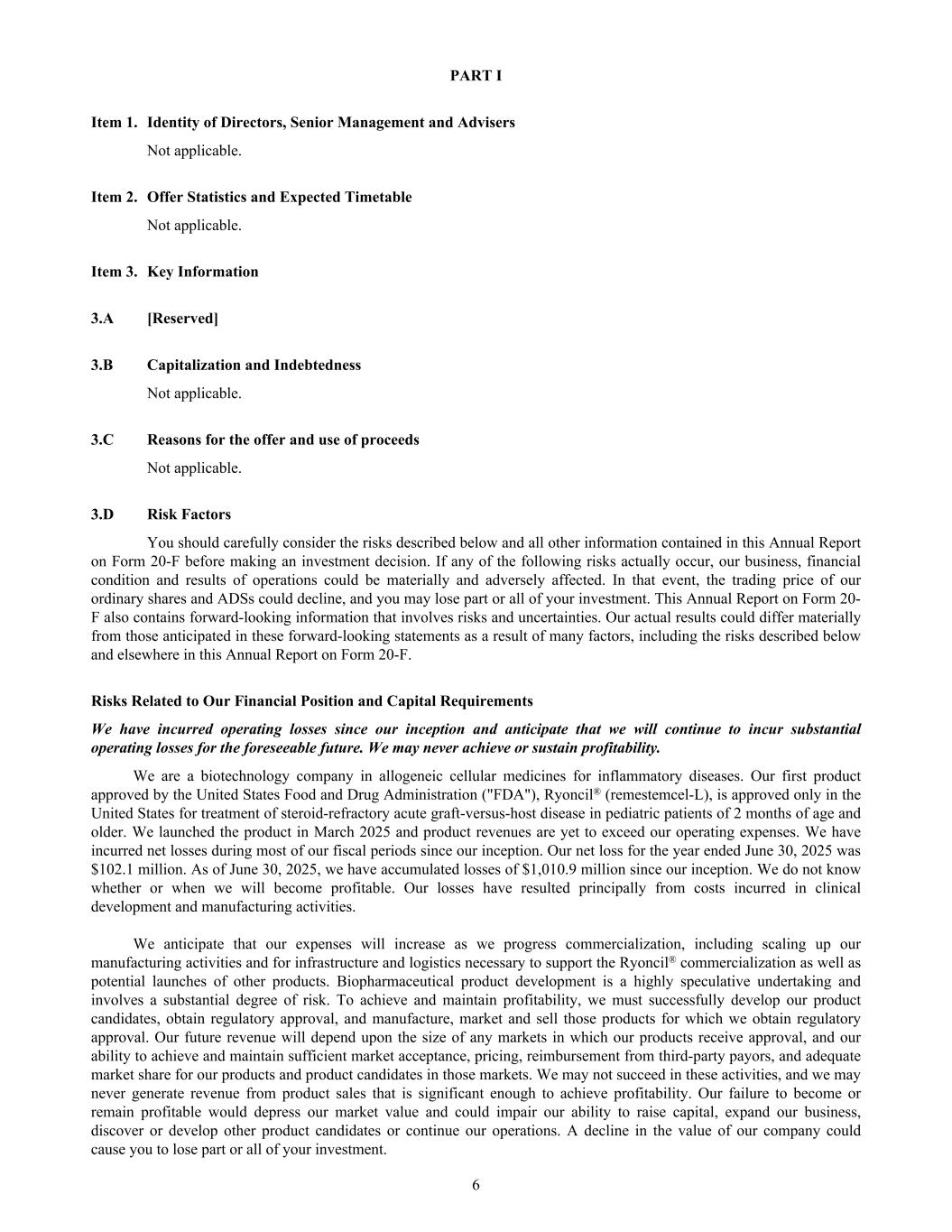 PART I Item 1. Identity of Directors, Senior Management and Advisers Not applicable. Item 2. Offer Statistics and Expected Timetable Not applicable. Item 3. Key Information 3.A [Reserved] 3.B Capitalization and Indebtedness Not applicable. 3.C Reasons for the offer and use of proceeds Not applicable. 3.D Risk Factors You should carefully consider the risks described below and all other information contained in this Annual Report on Form 20-F before making an investment decision. If any of the following risks actually occur, our business, financial condition and results of operations could be materially and adversely affected. In that event, the trading price of our ordinary shares and ADSs could decline, and you may lose part or all of your investment. This Annual Report on Form 20- F also contains forward-looking information that involves risks and uncertainties. Our actual results could differ materially from those anticipated in these forward-looking statements as a result of many factors, including the risks described below and elsewhere in this Annual Report on Form 20-F. Risks Related to Our Financial Position and Capital Requirements We have incurred operating losses since our inception and anticipate that we will continue to incur substantial operating losses for the foreseeable future. We may never achieve or sustain profitability. We are a biotechnology company in allogeneic cellular medicines for inflammatory diseases. Our first product approved by the United States Food and Drug Administration ("FDA"), Ryoncil® (remestemcel-L), is approved only in the United States for treatment of steroid-refractory acute graft-versus-host disease in pediatric patients of 2 months of age and older. We launched the product in March 2025 and product revenues are yet to exceed our operating expenses. We have incurred net losses during most of our fiscal periods since our inception. Our net loss for the year ended June 30, 2025 was $102.1 million. As of June 30, 2025, we have accumulated losses of $1,010.9 million since our inception. We do not know whether or when we will become profitable. Our losses have resulted principally from costs incurred in clinical development and manufacturing activities. We anticipate that our expenses will increase as we progress commercialization, including scaling up our manufacturing activities and for infrastructure and logistics necessary to support the Ryoncil® commercialization as well as potential launches of other products. Biopharmaceutical product development is a highly speculative undertaking and involves a substantial degree of risk. To achieve and maintain profitability, we must successfully develop our product candidates, obtain regulatory approval, and manufacture, market and sell those products for which we obtain regulatory approval. Our future revenue will depend upon the size of any markets in which our products receive approval, and our ability to achieve and maintain sufficient market acceptance, pricing, reimbursement from third-party payors, and adequate market share for our products and product candidates in those markets. We may not succeed in these activities, and we may never generate revenue from product sales that is significant enough to achieve profitability. Our failure to become or remain profitable would depress our market value and could impair our ability to raise capital, expand our business, discover or develop other product candidates or continue our operations. A decline in the value of our company could cause you to lose part or all of your investment. 6
