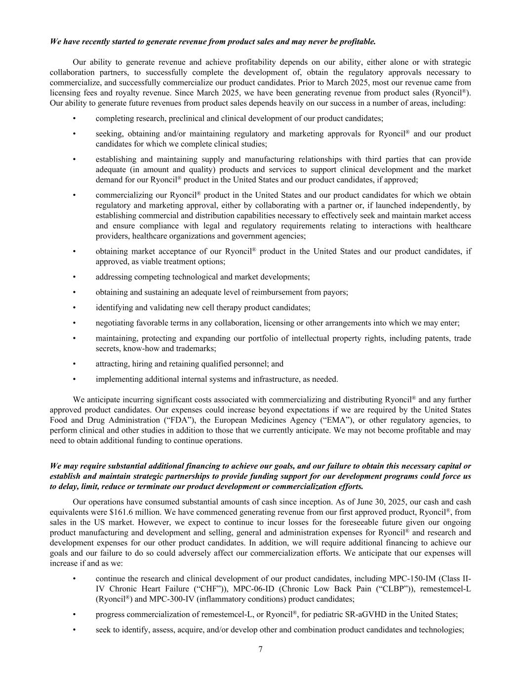 We have recently started to generate revenue from product sales and may never be profitable. Our ability to generate revenue and achieve profitability depends on our ability, either alone or with strategic collaboration partners, to successfully complete the development of, obtain the regulatory approvals necessary to commercialize, and successfully commercialize our product candidates. Prior to March 2025, most our revenue came from licensing fees and royalty revenue. Since March 2025, we have been generating revenue from product sales (Ryoncil®). Our ability to generate future revenues from product sales depends heavily on our success in a number of areas, including: • completing research, preclinical and clinical development of our product candidates; • seeking, obtaining and/or maintaining regulatory and marketing approvals for Ryoncil® and our product candidates for which we complete clinical studies; • establishing and maintaining supply and manufacturing relationships with third parties that can provide adequate (in amount and quality) products and services to support clinical development and the market demand for our Ryoncil® product in the United States and our product candidates, if approved; • commercializing our Ryoncil® product in the United States and our product candidates for which we obtain regulatory and marketing approval, either by collaborating with a partner or, if launched independently, by establishing commercial and distribution capabilities necessary to effectively seek and maintain market access and ensure compliance with legal and regulatory requirements relating to interactions with healthcare providers, healthcare organizations and government agencies; • obtaining market acceptance of our Ryoncil® product in the United States and our product candidates, if approved, as viable treatment options; • addressing competing technological and market developments; • obtaining and sustaining an adequate level of reimbursement from payors; • identifying and validating new cell therapy product candidates; • negotiating favorable terms in any collaboration, licensing or other arrangements into which we may enter; • maintaining, protecting and expanding our portfolio of intellectual property rights, including patents, trade secrets, know-how and trademarks; • attracting, hiring and retaining qualified personnel; and • implementing additional internal systems and infrastructure, as needed. We anticipate incurring significant costs associated with commercializing and distributing Ryoncil® and any further approved product candidates. Our expenses could increase beyond expectations if we are required by the United States Food and Drug Administration (“FDA”), the European Medicines Agency (“EMA”), or other regulatory agencies, to perform clinical and other studies in addition to those that we currently anticipate. We may not become profitable and may need to obtain additional funding to continue operations. We may require substantial additional financing to achieve our goals, and our failure to obtain this necessary capital or establish and maintain strategic partnerships to provide funding support for our development programs could force us to delay, limit, reduce or terminate our product development or commercialization efforts. Our operations have consumed substantial amounts of cash since inception. As of June 30, 2025, our cash and cash equivalents were $161.6 million. We have commenced generating revenue from our first approved product, Ryoncil®, from sales in the US market. However, we expect to continue to incur losses for the foreseeable future given our ongoing product manufacturing and development and selling, general and administration expenses for Ryoncil® and research and development expenses for our other product candidates. In addition, we will require additional financing to achieve our goals and our failure to do so could adversely affect our commercialization efforts. We anticipate that our expenses will increase if and as we: • continue the research and clinical development of our product candidates, including MPC-150-IM (Class II- IV Chronic Heart Failure (“CHF”)), MPC-06-ID (Chronic Low Back Pain (“CLBP”)), remestemcel-L (Ryoncil®) and MPC-300-IV (inflammatory conditions) product candidates; • progress commercialization of remestemcel-L, or Ryoncil®, for pediatric SR-aGVHD in the United States; • seek to identify, assess, acquire, and/or develop other and combination product candidates and technologies; 7