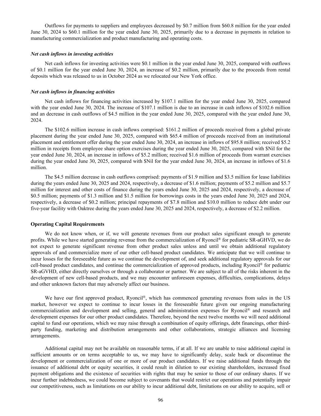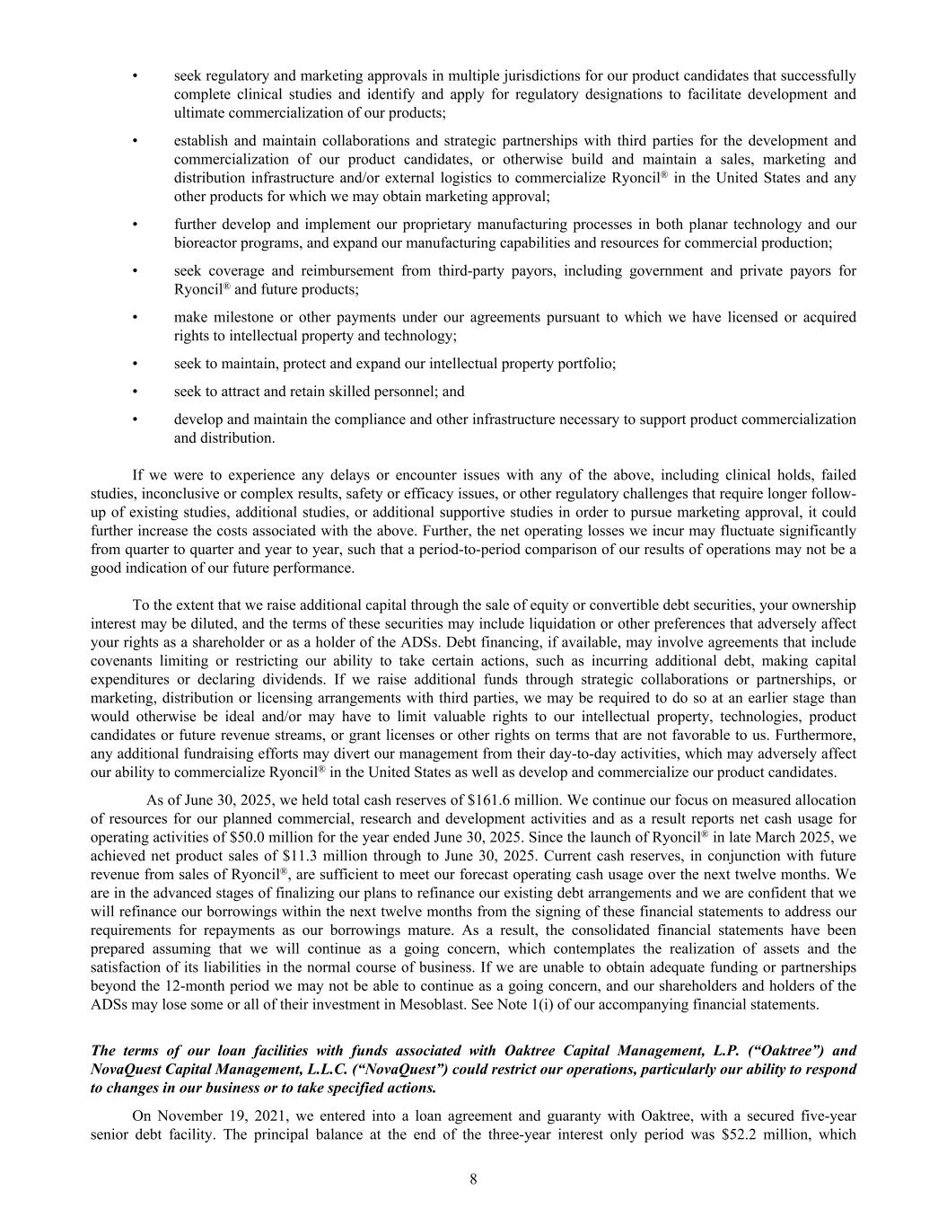 • seek regulatory and marketing approvals in multiple jurisdictions for our product candidates that successfully complete clinical studies and identify and apply for regulatory designations to facilitate development and ultimate commercialization of our products; • establish and maintain collaborations and strategic partnerships with third parties for the development and commercialization of our product candidates, or otherwise build and maintain a sales, marketing and distribution infrastructure and/or external logistics to commercialize Ryoncil® in the United States and any other products for which we may obtain marketing approval; • further develop and implement our proprietary manufacturing processes in both planar technology and our bioreactor programs, and expand our manufacturing capabilities and resources for commercial production; • seek coverage and reimbursement from third-party payors, including government and private payors for Ryoncil® and future products; • make milestone or other payments under our agreements pursuant to which we have licensed or acquired rights to intellectual property and technology; • seek to maintain, protect and expand our intellectual property portfolio; • seek to attract and retain skilled personnel; and • develop and maintain the compliance and other infrastructure necessary to support product commercialization and distribution. If we were to experience any delays or encounter issues with any of the above, including clinical holds, failed studies, inconclusive or complex results, safety or efficacy issues, or other regulatory challenges that require longer follow- up of existing studies, additional studies, or additional supportive studies in order to pursue marketing approval, it could further increase the costs associated with the above. Further, the net operating losses we incur may fluctuate significantly from quarter to quarter and year to year, such that a period-to-period comparison of our results of operations may not be a good indication of our future performance. To the extent that we raise additional capital through the sale of equity or convertible debt securities, your ownership interest may be diluted, and the terms of these securities may include liquidation or other preferences that adversely affect your rights as a shareholder or as a holder of the ADSs. Debt financing, if available, may involve agreements that include covenants limiting or restricting our ability to take certain actions, such as incurring additional debt, making capital expenditures or declaring dividends. If we raise additional funds through strategic collaborations or partnerships, or marketing, distribution or licensing arrangements with third parties, we may be required to do so at an earlier stage than would otherwise be ideal and/or may have to limit valuable rights to our intellectual property, technologies, product candidates or future revenue streams, or grant licenses or other rights on terms that are not favorable to us. Furthermore, any additional fundraising efforts may divert our management from their day-to-day activities, which may adversely affect our ability to commercialize Ryoncil® in the United States as well as develop and commercialize our product candidates. As of June 30, 2025, we held total cash reserves of $161.6 million. We continue our focus on measured allocation of resources for our planned commercial, research and development activities and as a result reports net cash usage for operating activities of $50.0 million for the year ended June 30, 2025. Since the launch of Ryoncil® in late March 2025, we achieved net product sales of $11.3 million through to June 30, 2025. Current cash reserves, in conjunction with future revenue from sales of Ryoncil®, are sufficient to meet our forecast operating cash usage over the next twelve months. We are in the advanced stages of finalizing our plans to refinance our existing debt arrangements and we are confident that we will refinance our borrowings within the next twelve months from the signing of these financial statements to address our requirements for repayments as our borrowings mature. As a result, the consolidated financial statements have been prepared assuming that we will continue as a going concern, which contemplates the realization of assets and the satisfaction of its liabilities in the normal course of business. If we are unable to obtain adequate funding or partnerships beyond the 12-month period we may not be able to continue as a going concern, and our shareholders and holders of the ADSs may lose some or all of their investment in Mesoblast. See Note 1(i) of our accompanying financial statements. The terms of our loan facilities with funds associated with Oaktree Capital Management, L.P. (“Oaktree”) and NovaQuest Capital Management, L.L.C. (“NovaQuest”) could restrict our operations, particularly our ability to respond to changes in our business or to take specified actions. On November 19, 2021, we entered into a loan agreement and guaranty with Oaktree, with a secured five-year senior debt facility. The principal balance at the end of the three-year interest only period was $52.2 million, which 8