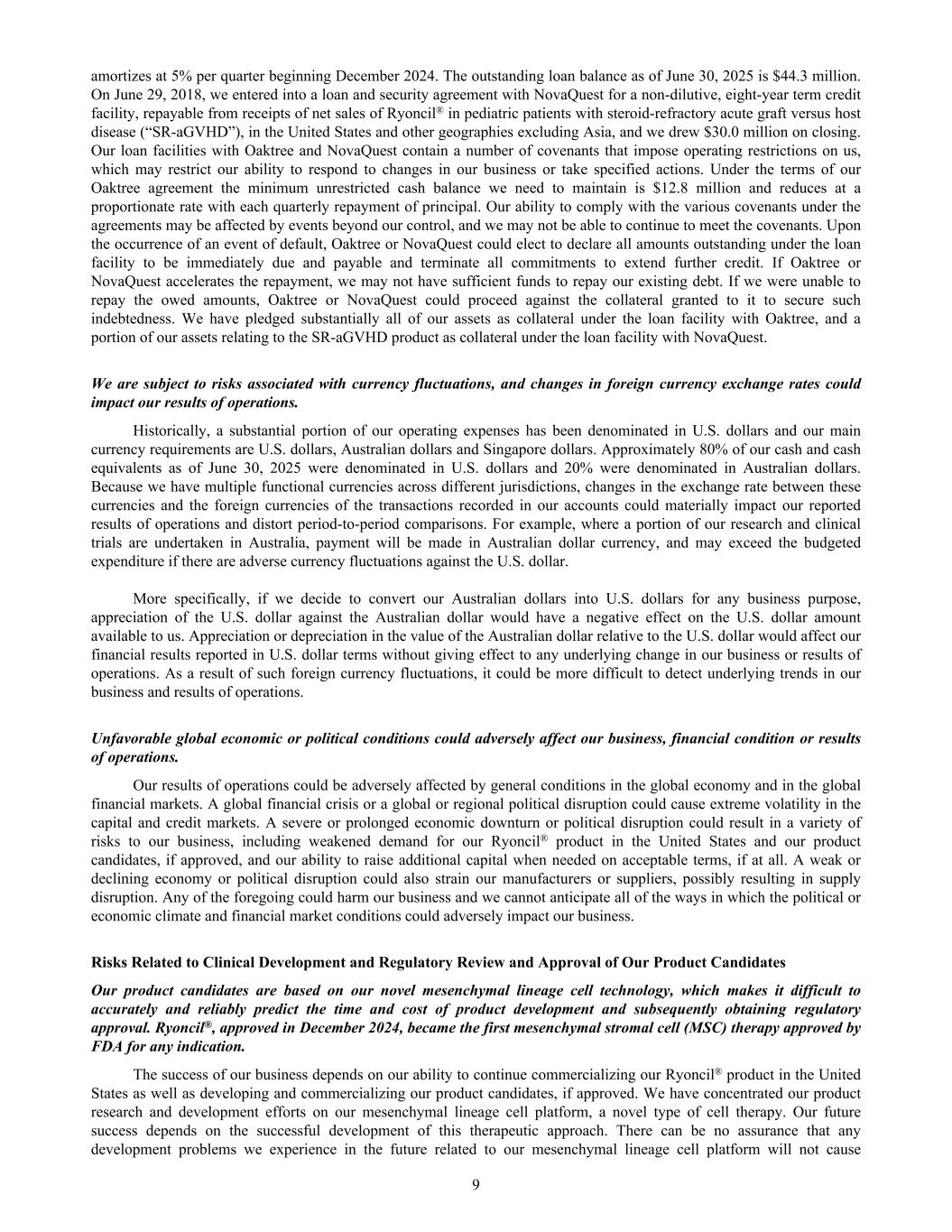 amortizes at 5% per quarter beginning December 2024. The outstanding loan balance as of June 30, 2025 is $44.3 million. On June 29, 2018, we entered into a loan and security agreement with NovaQuest for a non-dilutive, eight-year term credit facility, repayable from receipts of net sales of Ryoncil® in pediatric patients with steroid-refractory acute graft versus host disease (“SR-aGVHD”), in the United States and other geographies excluding Asia, and we drew $30.0 million on closing. Our loan facilities with Oaktree and NovaQuest contain a number of covenants that impose operating restrictions on us, which may restrict our ability to respond to changes in our business or take specified actions. Under the terms of our Oaktree agreement the minimum unrestricted cash balance we need to maintain is $12.8 million and reduces at a proportionate rate with each quarterly repayment of principal. Our ability to comply with the various covenants under the agreements may be affected by events beyond our control, and we may not be able to continue to meet the covenants. Upon the occurrence of an event of default, Oaktree or NovaQuest could elect to declare all amounts outstanding under the loan facility to be immediately due and payable and terminate all commitments to extend further credit. If Oaktree or NovaQuest accelerates the repayment, we may not have sufficient funds to repay our existing debt. If we were unable to repay the owed amounts, Oaktree or NovaQuest could proceed against the collateral granted to it to secure such indebtedness. We have pledged substantially all of our assets as collateral under the loan facility with Oaktree, and a portion of our assets relating to the SR-aGVHD product as collateral under the loan facility with NovaQuest. We are subject to risks associated with currency fluctuations, and changes in foreign currency exchange rates could impact our results of operations. Historically, a substantial portion of our operating expenses has been denominated in U.S. dollars and our main currency requirements are U.S. dollars, Australian dollars and Singapore dollars. Approximately 80% of our cash and cash equivalents as of June 30, 2025 were denominated in U.S. dollars and 20% were denominated in Australian dollars. Because we have multiple functional currencies across different jurisdictions, changes in the exchange rate between these currencies and the foreign currencies of the transactions recorded in our accounts could materially impact our reported results of operations and distort period-to-period comparisons. For example, where a portion of our research and clinical trials are undertaken in Australia, payment will be made in Australian dollar currency, and may exceed the budgeted expenditure if there are adverse currency fluctuations against the U.S. dollar. More specifically, if we decide to convert our Australian dollars into U.S. dollars for any business purpose, appreciation of the U.S. dollar against the Australian dollar would have a negative effect on the U.S. dollar amount available to us. Appreciation or depreciation in the value of the Australian dollar relative to the U.S. dollar would affect our financial results reported in U.S. dollar terms without giving effect to any underlying change in our business or results of operations. As a result of such foreign currency fluctuations, it could be more difficult to detect underlying trends in our business and results of operations. Unfavorable global economic or political conditions could adversely affect our business, financial condition or results of operations. Our results of operations could be adversely affected by general conditions in the global economy and in the global financial markets. A global financial crisis or a global or regional political disruption could cause extreme volatility in the capital and credit markets. A severe or prolonged economic downturn or political disruption could result in a variety of risks to our business, including weakened demand for our Ryoncil® product in the United States and our product candidates, if approved, and our ability to raise additional capital when needed on acceptable terms, if at all. A weak or declining economy or political disruption could also strain our manufacturers or suppliers, possibly resulting in supply disruption. Any of the foregoing could harm our business and we cannot anticipate all of the ways in which the political or economic climate and financial market conditions could adversely impact our business. Risks Related to Clinical Development and Regulatory Review and Approval of Our Product Candidates Our product candidates are based on our novel mesenchymal lineage cell technology, which makes it difficult to accurately and reliably predict the time and cost of product development and subsequently obtaining regulatory approval. Ryoncil®, approved in December 2024, became the first mesenchymal stromal cell (MSC) therapy approved by FDA for any indication. The success of our business depends on our ability to continue commercializing our Ryoncil® product in the United States as well as developing and commercializing our product candidates, if approved. We have concentrated our product research and development efforts on our mesenchymal lineage cell platform, a novel type of cell therapy. Our future success depends on the successful development of this therapeutic approach. There can be no assurance that any development problems we experience in the future related to our mesenchymal lineage cell platform will not cause 9