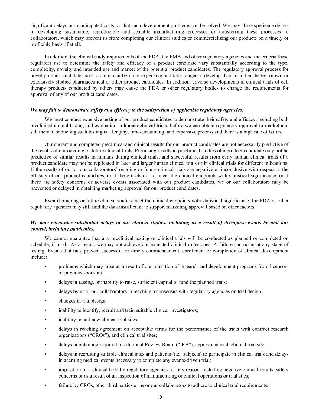 significant delays or unanticipated costs, or that such development problems can be solved. We may also experience delays in developing sustainable, reproducible and scalable manufacturing processes or transferring these processes to collaborators, which may prevent us from completing our clinical studies or commercializing our products on a timely or profitable basis, if at all. In addition, the clinical study requirements of the FDA, the EMA and other regulatory agencies and the criteria these regulators use to determine the safety and efficacy of a product candidate vary substantially according to the type, complexity, novelty and intended use and market of the potential product candidates. The regulatory approval process for novel product candidates such as ours can be more expensive and take longer to develop than for other, better known or extensively studied pharmaceutical or other product candidates. In addition, adverse developments in clinical trials of cell therapy products conducted by others may cause the FDA or other regulatory bodies to change the requirements for approval of any of our product candidates. We may fail to demonstrate safety and efficacy to the satisfaction of applicable regulatory agencies. We must conduct extensive testing of our product candidates to demonstrate their safety and efficacy, including both preclinical animal testing and evaluation in human clinical trials, before we can obtain regulatory approval to market and sell them. Conducting such testing is a lengthy, time-consuming, and expensive process and there is a high rate of failure. Our current and completed preclinical and clinical results for our product candidates are not necessarily predictive of the results of our ongoing or future clinical trials. Promising results in preclinical studies of a product candidate may not be predictive of similar results in humans during clinical trials, and successful results from early human clinical trials of a product candidate may not be replicated in later and larger human clinical trials or in clinical trials for different indications. If the results of our or our collaborators’ ongoing or future clinical trials are negative or inconclusive with respect to the efficacy of our product candidates, or if these trials do not meet the clinical endpoints with statistical significance, or if there are safety concerns or adverse events associated with our product candidates, we or our collaborators may be prevented or delayed in obtaining marketing approval for our product candidates. Even if ongoing or future clinical studies meet the clinical endpoints with statistical significance, the FDA or other regulatory agencies may still find the data insufficient to support marketing approval based on other factors. We may encounter substantial delays in our clinical studies, including as a result of disruptive events beyond our control, including pandemics. We cannot guarantee that any preclinical testing or clinical trials will be conducted as planned or completed on schedule, if at all. As a result, we may not achieve our expected clinical milestones. A failure can occur at any stage of testing. Events that may prevent successful or timely commencement, enrollment or completion of clinical development include: • problems which may arise as a result of our transition of research and development programs from licensors or previous sponsors; • delays in raising, or inability to raise, sufficient capital to fund the planned trials; • delays by us or our collaborators in reaching a consensus with regulatory agencies on trial design; • changes in trial design; • inability to identify, recruit and train suitable clinical investigators; • inability to add new clinical trial sites; • delays in reaching agreement on acceptable terms for the performance of the trials with contract research organizations (“CROs”), and clinical trial sites; • delays in obtaining required Institutional Review Board (“IRB”), approval at each clinical trial site; • delays in recruiting suitable clinical sites and patients (i.e., subjects) to participate in clinical trials and delays in accruing medical events necessary to complete any events-driven trial; • imposition of a clinical hold by regulatory agencies for any reason, including negative clinical results, safety concerns or as a result of an inspection of manufacturing or clinical operations or trial sites; • failure by CROs, other third parties or us or our collaborators to adhere to clinical trial requirements; 10