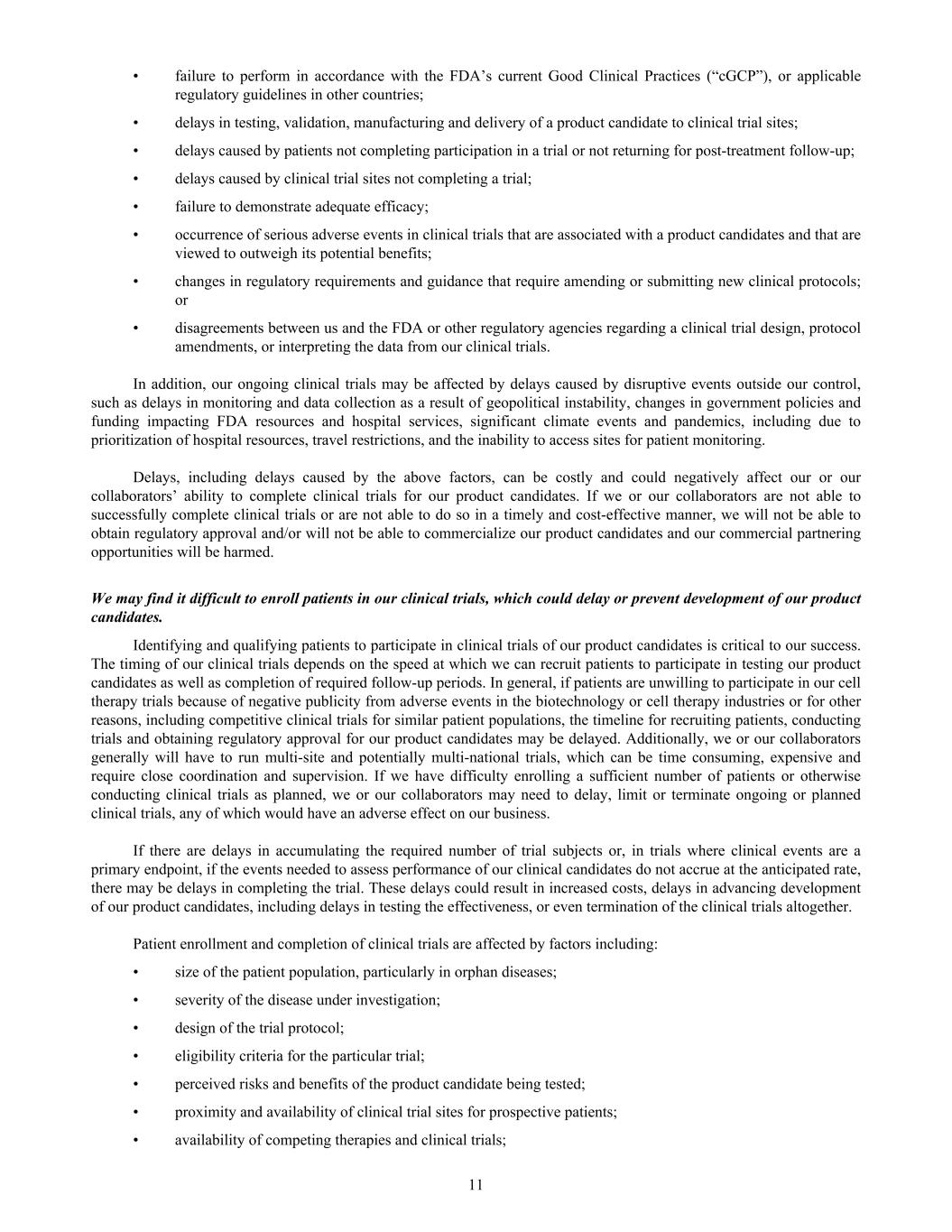 • failure to perform in accordance with the FDA’s current Good Clinical Practices (“cGCP”), or applicable regulatory guidelines in other countries; • delays in testing, validation, manufacturing and delivery of a product candidate to clinical trial sites; • delays caused by patients not completing participation in a trial or not returning for post-treatment follow-up; • delays caused by clinical trial sites not completing a trial; • failure to demonstrate adequate efficacy; • occurrence of serious adverse events in clinical trials that are associated with a product candidates and that are viewed to outweigh its potential benefits; • changes in regulatory requirements and guidance that require amending or submitting new clinical protocols; or • disagreements between us and the FDA or other regulatory agencies regarding a clinical trial design, protocol amendments, or interpreting the data from our clinical trials. In addition, our ongoing clinical trials may be affected by delays caused by disruptive events outside our control, such as delays in monitoring and data collection as a result of geopolitical instability, changes in government policies and funding impacting FDA resources and hospital services, significant climate events and pandemics, including due to prioritization of hospital resources, travel restrictions, and the inability to access sites for patient monitoring. Delays, including delays caused by the above factors, can be costly and could negatively affect our or our collaborators’ ability to complete clinical trials for our product candidates. If we or our collaborators are not able to successfully complete clinical trials or are not able to do so in a timely and cost-effective manner, we will not be able to obtain regulatory approval and/or will not be able to commercialize our product candidates and our commercial partnering opportunities will be harmed. We may find it difficult to enroll patients in our clinical trials, which could delay or prevent development of our product candidates. Identifying and qualifying patients to participate in clinical trials of our product candidates is critical to our success. The timing of our clinical trials depends on the speed at which we can recruit patients to participate in testing our product candidates as well as completion of required follow-up periods. In general, if patients are unwilling to participate in our cell therapy trials because of negative publicity from adverse events in the biotechnology or cell therapy industries or for other reasons, including competitive clinical trials for similar patient populations, the timeline for recruiting patients, conducting trials and obtaining regulatory approval for our product candidates may be delayed. Additionally, we or our collaborators generally will have to run multi-site and potentially multi-national trials, which can be time consuming, expensive and require close coordination and supervision. If we have difficulty enrolling a sufficient number of patients or otherwise conducting clinical trials as planned, we or our collaborators may need to delay, limit or terminate ongoing or planned clinical trials, any of which would have an adverse effect on our business. If there are delays in accumulating the required number of trial subjects or, in trials where clinical events are a primary endpoint, if the events needed to assess performance of our clinical candidates do not accrue at the anticipated rate, there may be delays in completing the trial. These delays could result in increased costs, delays in advancing development of our product candidates, including delays in testing the effectiveness, or even termination of the clinical trials altogether. Patient enrollment and completion of clinical trials are affected by factors including: • size of the patient population, particularly in orphan diseases; • severity of the disease under investigation; • design of the trial protocol; • eligibility criteria for the particular trial; • perceived risks and benefits of the product candidate being tested; • proximity and availability of clinical trial sites for prospective patients; • availability of competing therapies and clinical trials; 11