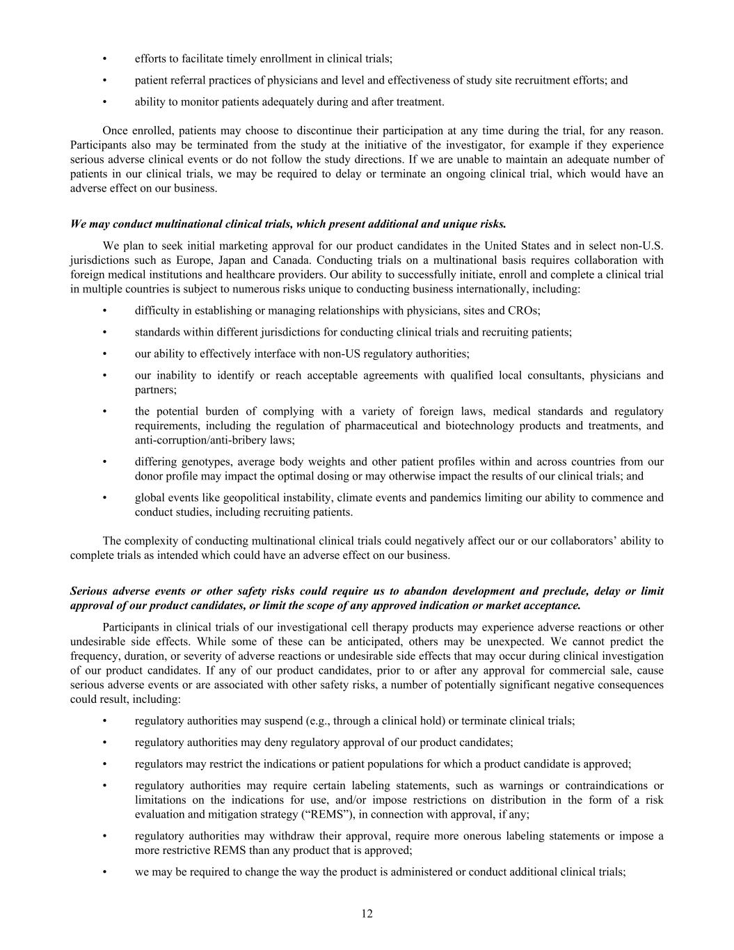 • efforts to facilitate timely enrollment in clinical trials; • patient referral practices of physicians and level and effectiveness of study site recruitment efforts; and • ability to monitor patients adequately during and after treatment. Once enrolled, patients may choose to discontinue their participation at any time during the trial, for any reason. Participants also may be terminated from the study at the initiative of the investigator, for example if they experience serious adverse clinical events or do not follow the study directions. If we are unable to maintain an adequate number of patients in our clinical trials, we may be required to delay or terminate an ongoing clinical trial, which would have an adverse effect on our business. We may conduct multinational clinical trials, which present additional and unique risks. We plan to seek initial marketing approval for our product candidates in the United States and in select non-U.S. jurisdictions such as Europe, Japan and Canada. Conducting trials on a multinational basis requires collaboration with foreign medical institutions and healthcare providers. Our ability to successfully initiate, enroll and complete a clinical trial in multiple countries is subject to numerous risks unique to conducting business internationally, including: • difficulty in establishing or managing relationships with physicians, sites and CROs; • standards within different jurisdictions for conducting clinical trials and recruiting patients; • our ability to effectively interface with non-US regulatory authorities; • our inability to identify or reach acceptable agreements with qualified local consultants, physicians and partners; • the potential burden of complying with a variety of foreign laws, medical standards and regulatory requirements, including the regulation of pharmaceutical and biotechnology products and treatments, and anti-corruption/anti-bribery laws; • differing genotypes, average body weights and other patient profiles within and across countries from our donor profile may impact the optimal dosing or may otherwise impact the results of our clinical trials; and • global events like geopolitical instability, climate events and pandemics limiting our ability to commence and conduct studies, including recruiting patients. The complexity of conducting multinational clinical trials could negatively affect our or our collaborators’ ability to complete trials as intended which could have an adverse effect on our business. Serious adverse events or other safety risks could require us to abandon development and preclude, delay or limit approval of our product candidates, or limit the scope of any approved indication or market acceptance. Participants in clinical trials of our investigational cell therapy products may experience adverse reactions or other undesirable side effects. While some of these can be anticipated, others may be unexpected. We cannot predict the frequency, duration, or severity of adverse reactions or undesirable side effects that may occur during clinical investigation of our product candidates. If any of our product candidates, prior to or after any approval for commercial sale, cause serious adverse events or are associated with other safety risks, a number of potentially significant negative consequences could result, including: • regulatory authorities may suspend (e.g., through a clinical hold) or terminate clinical trials; • regulatory authorities may deny regulatory approval of our product candidates; • regulators may restrict the indications or patient populations for which a product candidate is approved; • regulatory authorities may require certain labeling statements, such as warnings or contraindications or limitations on the indications for use, and/or impose restrictions on distribution in the form of a risk evaluation and mitigation strategy (“REMS”), in connection with approval, if any; • regulatory authorities may withdraw their approval, require more onerous labeling statements or impose a more restrictive REMS than any product that is approved; • we may be required to change the way the product is administered or conduct additional clinical trials; 12