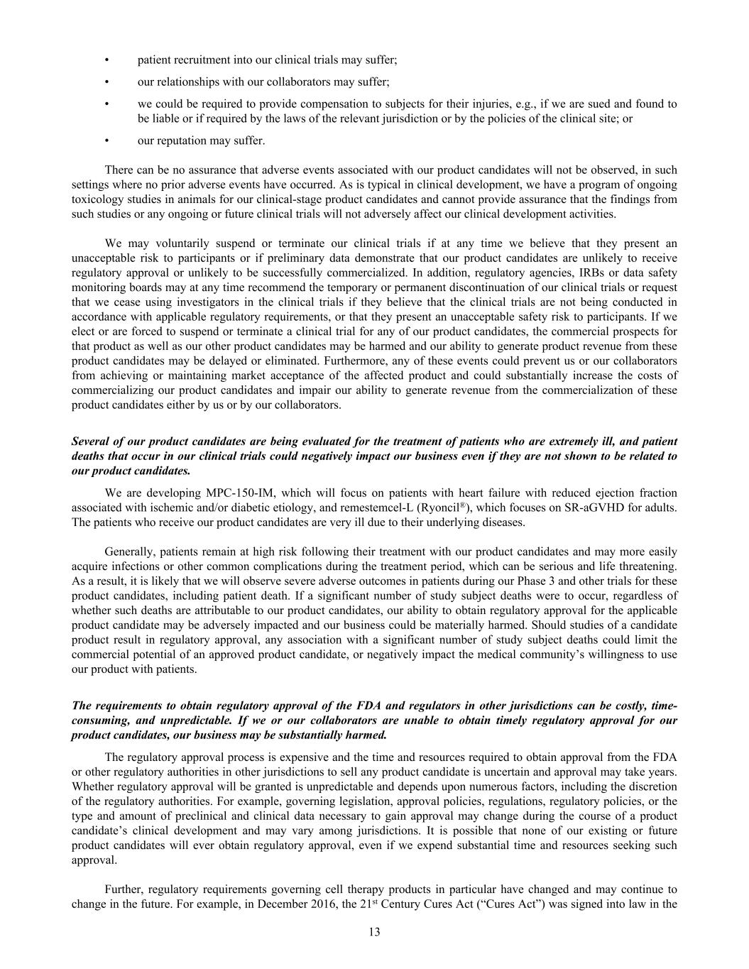 • patient recruitment into our clinical trials may suffer; • our relationships with our collaborators may suffer; • we could be required to provide compensation to subjects for their injuries, e.g., if we are sued and found to be liable or if required by the laws of the relevant jurisdiction or by the policies of the clinical site; or • our reputation may suffer. There can be no assurance that adverse events associated with our product candidates will not be observed, in such settings where no prior adverse events have occurred. As is typical in clinical development, we have a program of ongoing toxicology studies in animals for our clinical-stage product candidates and cannot provide assurance that the findings from such studies or any ongoing or future clinical trials will not adversely affect our clinical development activities. We may voluntarily suspend or terminate our clinical trials if at any time we believe that they present an unacceptable risk to participants or if preliminary data demonstrate that our product candidates are unlikely to receive regulatory approval or unlikely to be successfully commercialized. In addition, regulatory agencies, IRBs or data safety monitoring boards may at any time recommend the temporary or permanent discontinuation of our clinical trials or request that we cease using investigators in the clinical trials if they believe that the clinical trials are not being conducted in accordance with applicable regulatory requirements, or that they present an unacceptable safety risk to participants. If we elect or are forced to suspend or terminate a clinical trial for any of our product candidates, the commercial prospects for that product as well as our other product candidates may be harmed and our ability to generate product revenue from these product candidates may be delayed or eliminated. Furthermore, any of these events could prevent us or our collaborators from achieving or maintaining market acceptance of the affected product and could substantially increase the costs of commercializing our product candidates and impair our ability to generate revenue from the commercialization of these product candidates either by us or by our collaborators. Several of our product candidates are being evaluated for the treatment of patients who are extremely ill, and patient deaths that occur in our clinical trials could negatively impact our business even if they are not shown to be related to our product candidates. We are developing MPC-150-IM, which will focus on patients with heart failure with reduced ejection fraction associated with ischemic and/or diabetic etiology, and remestemcel-L (Ryoncil®), which focuses on SR-aGVHD for adults. The patients who receive our product candidates are very ill due to their underlying diseases. Generally, patients remain at high risk following their treatment with our product candidates and may more easily acquire infections or other common complications during the treatment period, which can be serious and life threatening. As a result, it is likely that we will observe severe adverse outcomes in patients during our Phase 3 and other trials for these product candidates, including patient death. If a significant number of study subject deaths were to occur, regardless of whether such deaths are attributable to our product candidates, our ability to obtain regulatory approval for the applicable product candidate may be adversely impacted and our business could be materially harmed. Should studies of a candidate product result in regulatory approval, any association with a significant number of study subject deaths could limit the commercial potential of an approved product candidate, or negatively impact the medical community’s willingness to use our product with patients. The requirements to obtain regulatory approval of the FDA and regulators in other jurisdictions can be costly, time- consuming, and unpredictable. If we or our collaborators are unable to obtain timely regulatory approval for our product candidates, our business may be substantially harmed. The regulatory approval process is expensive and the time and resources required to obtain approval from the FDA or other regulatory authorities in other jurisdictions to sell any product candidate is uncertain and approval may take years. Whether regulatory approval will be granted is unpredictable and depends upon numerous factors, including the discretion of the regulatory authorities. For example, governing legislation, approval policies, regulations, regulatory policies, or the type and amount of preclinical and clinical data necessary to gain approval may change during the course of a product candidate’s clinical development and may vary among jurisdictions. It is possible that none of our existing or future product candidates will ever obtain regulatory approval, even if we expend substantial time and resources seeking such approval. Further, regulatory requirements governing cell therapy products in particular have changed and may continue to change in the future. For example, in December 2016, the 21st Century Cures Act (“Cures Act”) was signed into law in the 13