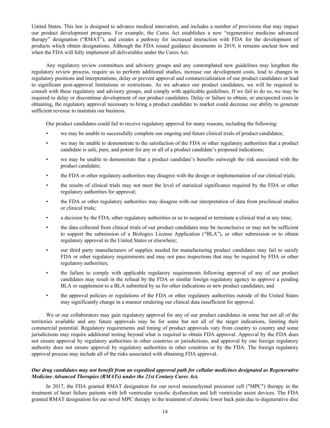 United States. This law is designed to advance medical innovation, and includes a number of provisions that may impact our product development programs. For example, the Cures Act establishes a new “regenerative medicine advanced therapy” designation (“RMAT”), and creates a pathway for increased interaction with FDA for the development of products which obtain designations. Although the FDA issued guidance documents in 2019, it remains unclear how and when the FDA will fully implement all deliverables under the Cures Act. Any regulatory review committees and advisory groups and any contemplated new guidelines may lengthen the regulatory review process, require us to perform additional studies, increase our development costs, lead to changes in regulatory positions and interpretations, delay or prevent approval and commercialization of our product candidates or lead to significant post-approval limitations or restrictions. As we advance our product candidates, we will be required to consult with these regulatory and advisory groups, and comply with applicable guidelines. If we fail to do so, we may be required to delay or discontinue development of our product candidates. Delay or failure to obtain, or unexpected costs in obtaining, the regulatory approval necessary to bring a product candidate to market could decrease our ability to generate sufficient revenue to maintain our business. Our product candidates could fail to receive regulatory approval for many reasons, including the following: • we may be unable to successfully complete our ongoing and future clinical trials of product candidates; • we may be unable to demonstrate to the satisfaction of the FDA or other regulatory authorities that a product candidate is safe, pure, and potent for any or all of a product candidate’s proposed indications; • we may be unable to demonstrate that a product candidate’s benefits outweigh the risk associated with the product candidate; • the FDA or other regulatory authorities may disagree with the design or implementation of our clinical trials; • the results of clinical trials may not meet the level of statistical significance required by the FDA or other regulatory authorities for approval; • the FDA or other regulatory authorities may disagree with our interpretation of data from preclinical studies or clinical trials; • a decision by the FDA, other regulatory authorities or us to suspend or terminate a clinical trial at any time; • the data collected from clinical trials of our product candidates may be inconclusive or may not be sufficient to support the submission of a Biologics License Application (“BLA”), or other submission or to obtain regulatory approval in the United States or elsewhere; • our third party manufacturers of supplies needed for manufacturing product candidates may fail to satisfy FDA or other regulatory requirements and may not pass inspections that may be required by FDA or other regulatory authorities; • the failure to comply with applicable regulatory requirements following approval of any of our product candidates may result in the refusal by the FDA or similar foreign regulatory agency to approve a pending BLA or supplement to a BLA submitted by us for other indications or new product candidates; and • the approval policies or regulations of the FDA or other regulatory authorities outside of the United States may significantly change in a manner rendering our clinical data insufficient for approval. We or our collaborators may gain regulatory approval for any of our product candidates in some but not all of the territories available and any future approvals may be for some but not all of the target indications, limiting their commercial potential. Regulatory requirements and timing of product approvals vary from country to country and some jurisdictions may require additional testing beyond what is required to obtain FDA approval. Approval by the FDA does not ensure approval by regulatory authorities in other countries or jurisdictions, and approval by one foreign regulatory authority does not ensure approval by regulatory authorities in other countries or by the FDA. The foreign regulatory approval process may include all of the risks associated with obtaining FDA approval. Our drug candidates may not benefit from an expedited approval path for cellular medicines designated as Regenerative Medicine Advanced Therapies (RMATs) under the 21st Century Cures Act. In 2017, the FDA granted RMAT designation for our novel mesenchymal precursor cell ("MPC") therapy in the treatment of heart failure patients with left ventricular systolic dysfunction and left ventricular assist devices. The FDA granted RMAT designation for our novel MPC therapy in the treatment of chronic lower back pain due to degenerative disc 14
