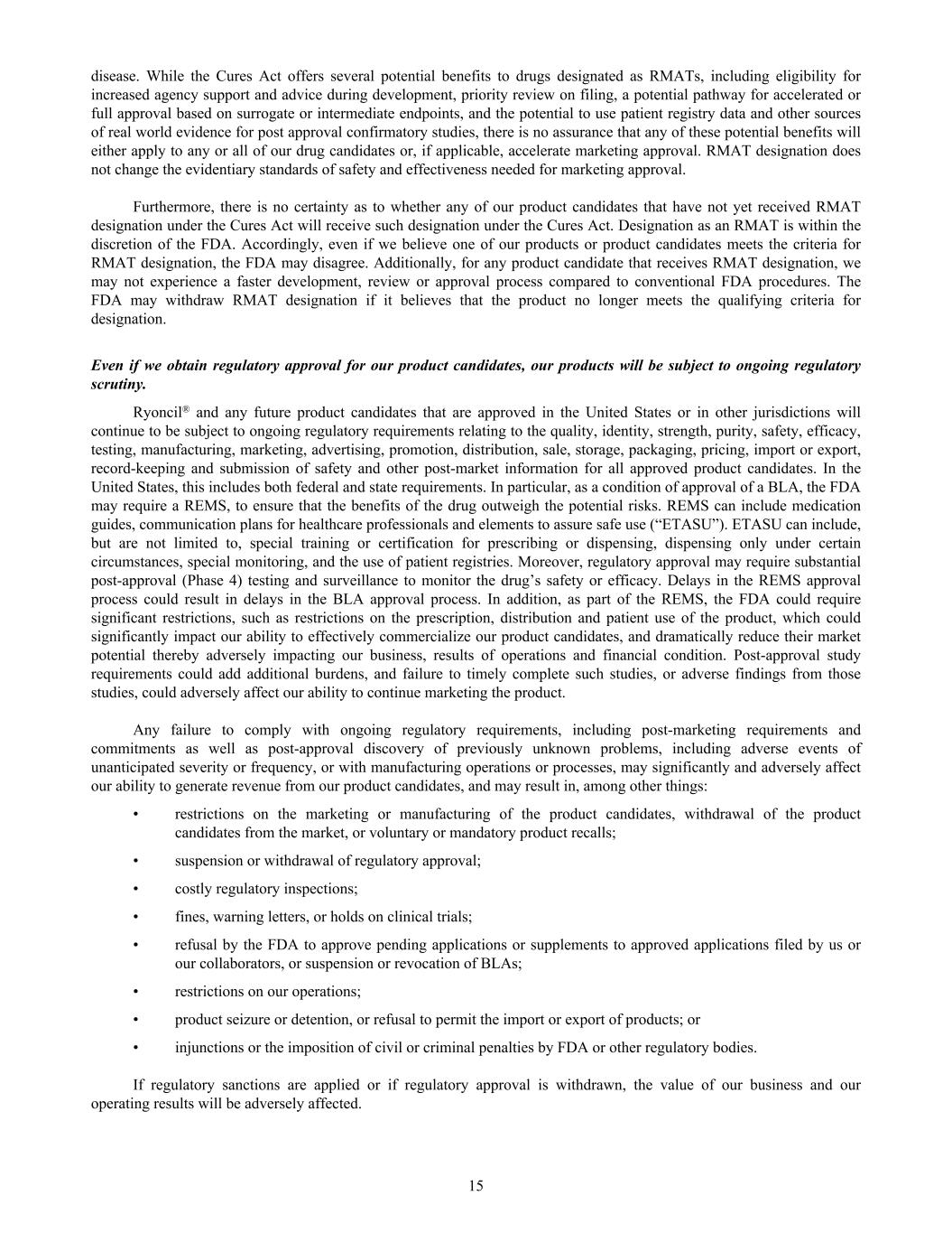 disease. While the Cures Act offers several potential benefits to drugs designated as RMATs, including eligibility for increased agency support and advice during development, priority review on filing, a potential pathway for accelerated or full approval based on surrogate or intermediate endpoints, and the potential to use patient registry data and other sources of real world evidence for post approval confirmatory studies, there is no assurance that any of these potential benefits will either apply to any or all of our drug candidates or, if applicable, accelerate marketing approval. RMAT designation does not change the evidentiary standards of safety and effectiveness needed for marketing approval. Furthermore, there is no certainty as to whether any of our product candidates that have not yet received RMAT designation under the Cures Act will receive such designation under the Cures Act. Designation as an RMAT is within the discretion of the FDA. Accordingly, even if we believe one of our products or product candidates meets the criteria for RMAT designation, the FDA may disagree. Additionally, for any product candidate that receives RMAT designation, we may not experience a faster development, review or approval process compared to conventional FDA procedures. The FDA may withdraw RMAT designation if it believes that the product no longer meets the qualifying criteria for designation. Even if we obtain regulatory approval for our product candidates, our products will be subject to ongoing regulatory scrutiny. Ryoncil® and any future product candidates that are approved in the United States or in other jurisdictions will continue to be subject to ongoing regulatory requirements relating to the quality, identity, strength, purity, safety, efficacy, testing, manufacturing, marketing, advertising, promotion, distribution, sale, storage, packaging, pricing, import or export, record-keeping and submission of safety and other post-market information for all approved product candidates. In the United States, this includes both federal and state requirements. In particular, as a condition of approval of a BLA, the FDA may require a REMS, to ensure that the benefits of the drug outweigh the potential risks. REMS can include medication guides, communication plans for healthcare professionals and elements to assure safe use (“ETASU”). ETASU can include, but are not limited to, special training or certification for prescribing or dispensing, dispensing only under certain circumstances, special monitoring, and the use of patient registries. Moreover, regulatory approval may require substantial post-approval (Phase 4) testing and surveillance to monitor the drug’s safety or efficacy. Delays in the REMS approval process could result in delays in the BLA approval process. In addition, as part of the REMS, the FDA could require significant restrictions, such as restrictions on the prescription, distribution and patient use of the product, which could significantly impact our ability to effectively commercialize our product candidates, and dramatically reduce their market potential thereby adversely impacting our business, results of operations and financial condition. Post-approval study requirements could add additional burdens, and failure to timely complete such studies, or adverse findings from those studies, could adversely affect our ability to continue marketing the product. Any failure to comply with ongoing regulatory requirements, including post-marketing requirements and commitments as well as post-approval discovery of previously unknown problems, including adverse events of unanticipated severity or frequency, or with manufacturing operations or processes, may significantly and adversely affect our ability to generate revenue from our product candidates, and may result in, among other things: • restrictions on the marketing or manufacturing of the product candidates, withdrawal of the product candidates from the market, or voluntary or mandatory product recalls; • suspension or withdrawal of regulatory approval; • costly regulatory inspections; • fines, warning letters, or holds on clinical trials; • refusal by the FDA to approve pending applications or supplements to approved applications filed by us or our collaborators, or suspension or revocation of BLAs; • restrictions on our operations; • product seizure or detention, or refusal to permit the import or export of products; or • injunctions or the imposition of civil or criminal penalties by FDA or other regulatory bodies. If regulatory sanctions are applied or if regulatory approval is withdrawn, the value of our business and our operating results will be adversely affected. 15