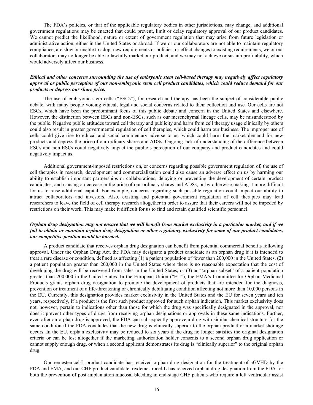 The FDA’s policies, or that of the applicable regulatory bodies in other jurisdictions, may change, and additional government regulations may be enacted that could prevent, limit or delay regulatory approval of our product candidates. We cannot predict the likelihood, nature or extent of government regulation that may arise from future legislation or administrative action, either in the United States or abroad. If we or our collaborators are not able to maintain regulatory compliance, are slow or unable to adopt new requirements or policies, or effect changes to existing requirements, we or our collaborators may no longer be able to lawfully market our product, and we may not achieve or sustain profitability, which would adversely affect our business. Ethical and other concerns surrounding the use of embryonic stem cell-based therapy may negatively affect regulatory approval or public perception of our non-embryonic stem cell product candidates, which could reduce demand for our products or depress our share price. The use of embryonic stem cells (“ESCs”), for research and therapy has been the subject of considerable public debate, with many people voicing ethical, legal and social concerns related to their collection and use. Our cells are not ESCs, which have been the predominant focus of this public debate and concern in the United States and elsewhere. However, the distinction between ESCs and non-ESCs, such as our mesenchymal lineage cells, may be misunderstood by the public. Negative public attitudes toward cell therapy and publicity and harm from cell therapy usage clinically by others could also result in greater governmental regulation of cell therapies, which could harm our business. The improper use of cells could give rise to ethical and social commentary adverse to us, which could harm the market demand for new products and depress the price of our ordinary shares and ADSs. Ongoing lack of understanding of the difference between ESCs and non-ESCs could negatively impact the public’s perception of our company and product candidates and could negatively impact us. Additional government-imposed restrictions on, or concerns regarding possible government regulation of, the use of cell therapies in research, development and commercialization could also cause an adverse effect on us by harming our ability to establish important partnerships or collaborations, delaying or preventing the development of certain product candidates, and causing a decrease in the price of our ordinary shares and ADSs, or by otherwise making it more difficult for us to raise additional capital. For example, concerns regarding such possible regulation could impact our ability to attract collaborators and investors. Also, existing and potential government regulation of cell therapies may lead researchers to leave the field of cell therapy research altogether in order to assure that their careers will not be impeded by restrictions on their work. This may make it difficult for us to find and retain qualified scientific personnel. Orphan drug designation may not ensure that we will benefit from market exclusivity in a particular market, and if we fail to obtain or maintain orphan drug designation or other regulatory exclusivity for some of our product candidates, our competitive position would be harmed. A product candidate that receives orphan drug designation can benefit from potential commercial benefits following approval. Under the Orphan Drug Act, the FDA may designate a product candidate as an orphan drug if it is intended to treat a rare disease or condition, defined as affecting (1) a patient population of fewer than 200,000 in the United States, (2) a patient population greater than 200,000 in the United States where there is no reasonable expectation that the cost of developing the drug will be recovered from sales in the United States, or (3) an “orphan subset” of a patient population greater than 200,000 in the United States. In the European Union (“EU”), the EMA’s Committee for Orphan Medicinal Products grants orphan drug designation to promote the development of products that are intended for the diagnosis, prevention or treatment of a life-threatening or chronically debilitating condition affecting not more than 10,000 persons in the EU. Currently, this designation provides market exclusivity in the United States and the EU for seven years and ten years, respectively, if a product is the first such product approved for such orphan indication. This market exclusivity does not, however, pertain to indications other than those for which the drug was specifically designated in the approval, nor does it prevent other types of drugs from receiving orphan designations or approvals in these same indications. Further, even after an orphan drug is approved, the FDA can subsequently approve a drug with similar chemical structure for the same condition if the FDA concludes that the new drug is clinically superior to the orphan product or a market shortage occurs. In the EU, orphan exclusivity may be reduced to six years if the drug no longer satisfies the original designation criteria or can be lost altogether if the marketing authorization holder consents to a second orphan drug application or cannot supply enough drug, or when a second applicant demonstrates its drug is “clinically superior” to the original orphan drug. Our remestemcel-L product candidate has received orphan drug designation for the treatment of aGVHD by the FDA and EMA, and our CHF product candidate, rexlemestrocel-L has received orphan drug designation from the FDA for both the prevention of post-implantation mucosal bleeding in end-stage CHF patients who require a left ventricular assist 16