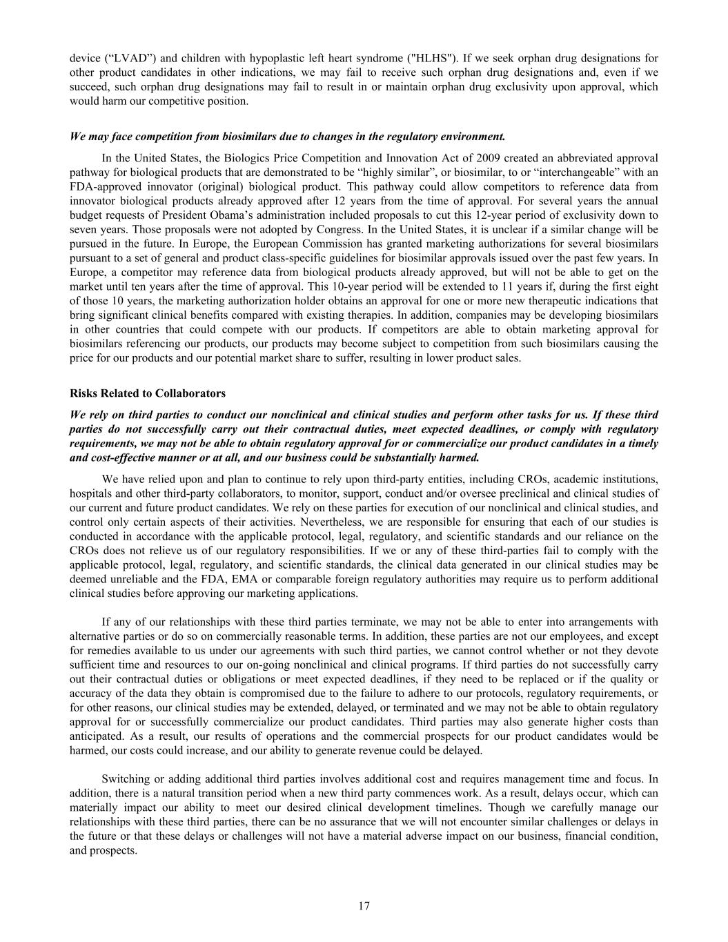 device (“LVAD”) and children with hypoplastic left heart syndrome ("HLHS"). If we seek orphan drug designations for other product candidates in other indications, we may fail to receive such orphan drug designations and, even if we succeed, such orphan drug designations may fail to result in or maintain orphan drug exclusivity upon approval, which would harm our competitive position. We may face competition from biosimilars due to changes in the regulatory environment. In the United States, the Biologics Price Competition and Innovation Act of 2009 created an abbreviated approval pathway for biological products that are demonstrated to be “highly similar”, or biosimilar, to or “interchangeable” with an FDA-approved innovator (original) biological product. This pathway could allow competitors to reference data from innovator biological products already approved after 12 years from the time of approval. For several years the annual budget requests of President Obama’s administration included proposals to cut this 12-year period of exclusivity down to seven years. Those proposals were not adopted by Congress. In the United States, it is unclear if a similar change will be pursued in the future. In Europe, the European Commission has granted marketing authorizations for several biosimilars pursuant to a set of general and product class-specific guidelines for biosimilar approvals issued over the past few years. In Europe, a competitor may reference data from biological products already approved, but will not be able to get on the market until ten years after the time of approval. This 10-year period will be extended to 11 years if, during the first eight of those 10 years, the marketing authorization holder obtains an approval for one or more new therapeutic indications that bring significant clinical benefits compared with existing therapies. In addition, companies may be developing biosimilars in other countries that could compete with our products. If competitors are able to obtain marketing approval for biosimilars referencing our products, our products may become subject to competition from such biosimilars causing the price for our products and our potential market share to suffer, resulting in lower product sales. Risks Related to Collaborators We rely on third parties to conduct our nonclinical and clinical studies and perform other tasks for us. If these third parties do not successfully carry out their contractual duties, meet expected deadlines, or comply with regulatory requirements, we may not be able to obtain regulatory approval for or commercialize our product candidates in a timely and cost-effective manner or at all, and our business could be substantially harmed. We have relied upon and plan to continue to rely upon third-party entities, including CROs, academic institutions, hospitals and other third-party collaborators, to monitor, support, conduct and/or oversee preclinical and clinical studies of our current and future product candidates. We rely on these parties for execution of our nonclinical and clinical studies, and control only certain aspects of their activities. Nevertheless, we are responsible for ensuring that each of our studies is conducted in accordance with the applicable protocol, legal, regulatory, and scientific standards and our reliance on the CROs does not relieve us of our regulatory responsibilities. If we or any of these third-parties fail to comply with the applicable protocol, legal, regulatory, and scientific standards, the clinical data generated in our clinical studies may be deemed unreliable and the FDA, EMA or comparable foreign regulatory authorities may require us to perform additional clinical studies before approving our marketing applications. If any of our relationships with these third parties terminate, we may not be able to enter into arrangements with alternative parties or do so on commercially reasonable terms. In addition, these parties are not our employees, and except for remedies available to us under our agreements with such third parties, we cannot control whether or not they devote sufficient time and resources to our on-going nonclinical and clinical programs. If third parties do not successfully carry out their contractual duties or obligations or meet expected deadlines, if they need to be replaced or if the quality or accuracy of the data they obtain is compromised due to the failure to adhere to our protocols, regulatory requirements, or for other reasons, our clinical studies may be extended, delayed, or terminated and we may not be able to obtain regulatory approval for or successfully commercialize our product candidates. Third parties may also generate higher costs than anticipated. As a result, our results of operations and the commercial prospects for our product candidates would be harmed, our costs could increase, and our ability to generate revenue could be delayed. Switching or adding additional third parties involves additional cost and requires management time and focus. In addition, there is a natural transition period when a new third party commences work. As a result, delays occur, which can materially impact our ability to meet our desired clinical development timelines. Though we carefully manage our relationships with these third parties, there can be no assurance that we will not encounter similar challenges or delays in the future or that these delays or challenges will not have a material adverse impact on our business, financial condition, and prospects. 17