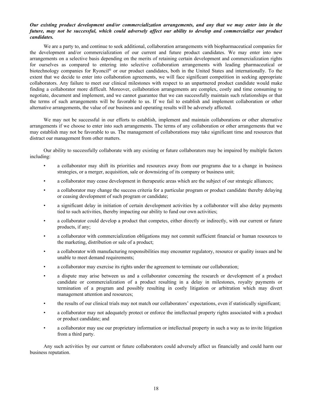 Our existing product development and/or commercialization arrangements, and any that we may enter into in the future, may not be successful, which could adversely affect our ability to develop and commercialize our product candidates. We are a party to, and continue to seek additional, collaboration arrangements with biopharmaceutical companies for the development and/or commercialization of our current and future product candidates. We may enter into new arrangements on a selective basis depending on the merits of retaining certain development and commercialization rights for ourselves as compared to entering into selective collaboration arrangements with leading pharmaceutical or biotechnology companies for Ryoncil® or our product candidates, both in the United States and internationally. To the extent that we decide to enter into collaboration agreements, we will face significant competition in seeking appropriate collaborators. Any failure to meet our clinical milestones with respect to an unpartnered product candidate would make finding a collaborator more difficult. Moreover, collaboration arrangements are complex, costly and time consuming to negotiate, document and implement, and we cannot guarantee that we can successfully maintain such relationships or that the terms of such arrangements will be favorable to us. If we fail to establish and implement collaboration or other alternative arrangements, the value of our business and operating results will be adversely affected. We may not be successful in our efforts to establish, implement and maintain collaborations or other alternative arrangements if we choose to enter into such arrangements. The terms of any collaboration or other arrangements that we may establish may not be favorable to us. The management of collaborations may take significant time and resources that distract our management from other matters. Our ability to successfully collaborate with any existing or future collaborators may be impaired by multiple factors including: • a collaborator may shift its priorities and resources away from our programs due to a change in business strategies, or a merger, acquisition, sale or downsizing of its company or business unit; • a collaborator may cease development in therapeutic areas which are the subject of our strategic alliances; • a collaborator may change the success criteria for a particular program or product candidate thereby delaying or ceasing development of such program or candidate; • a significant delay in initiation of certain development activities by a collaborator will also delay payments tied to such activities, thereby impacting our ability to fund our own activities; • a collaborator could develop a product that competes, either directly or indirectly, with our current or future products, if any; • a collaborator with commercialization obligations may not commit sufficient financial or human resources to the marketing, distribution or sale of a product; • a collaborator with manufacturing responsibilities may encounter regulatory, resource or quality issues and be unable to meet demand requirements; • a collaborator may exercise its rights under the agreement to terminate our collaboration; • a dispute may arise between us and a collaborator concerning the research or development of a product candidate or commercialization of a product resulting in a delay in milestones, royalty payments or termination of a program and possibly resulting in costly litigation or arbitration which may divert management attention and resources; • the results of our clinical trials may not match our collaborators’ expectations, even if statistically significant; • a collaborator may not adequately protect or enforce the intellectual property rights associated with a product or product candidate; and • a collaborator may use our proprietary information or intellectual property in such a way as to invite litigation from a third party. Any such activities by our current or future collaborators could adversely affect us financially and could harm our business reputation. 18