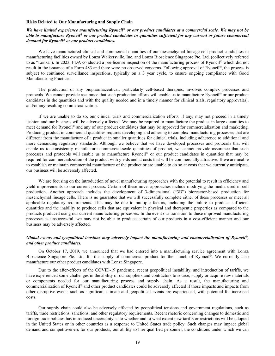 Risks Related to Our Manufacturing and Supply Chain We have limited experience manufacturing Ryoncil® or our product candidates at a commercial scale. We may not be able to manufacture Ryoncil® or our product candidates in quantities sufficient for any current or future commercial demand for Ryoncil® or our product candidates. We have manufactured clinical and commercial quantities of our mesenchymal lineage cell product candidates in manufacturing facilities owned by Lonza Walkersville, Inc. and Lonza Bioscience Singapore Pte. Ltd. (collectively referred to as “Lonza”). In 2023, FDA conducted a pre-license inspection of the manufacturing process of Ryoncil® which did not result in the issuance of a Form 483 and there were no observed concerns. Following approval of Ryoncil®, the process is subject to continued surveillance inspections, typically on a 3 year cycle, to ensure ongoing compliance with Good Manufacturing Practices. The production of any biopharmaceutical, particularly cell-based therapies, involves complex processes and protocols. We cannot provide assurance that such production efforts will enable us to manufacture Ryoncil® or our product candidates in the quantities and with the quality needed and in a timely manner for clinical trials, regulatory approval(s), and/or any resulting commercialization. If we are unable to do so, our clinical trials and commercialization efforts, if any, may not proceed in a timely fashion and our business will be adversely affected. We may be required to manufacture the product in large quantities to meet demand for Ryoncil® and any of our product candidates that may be approved for commercialization and marketing. Producing product in commercial quantities requires developing and adhering to complex manufacturing processes that are different from the manufacture of a product in smaller quantities for clinical trials, including adherence to additional and more demanding regulatory standards. Although we believe that we have developed processes and protocols that will enable us to consistently manufacture commercial-scale quantities of product, we cannot provide assurance that such processes and protocols will enable us to manufacture Ryoncil® or our product candidates in quantities that may be required for commercialization of the product with yields and at costs that will be commercially attractive. If we are unable to establish or maintain commercial manufacture of the product or are unable to do so at costs that we currently anticipate, our business will be adversely affected. We are focusing on the introduction of novel manufacturing approaches with the potential to result in efficiency and yield improvements to our current process. Certain of these novel approaches include modifying the media used in cell production. Another approach includes the development of 3-dimensional (“3D”) bioreactor-based production for mesenchymal lineage cells. There is no guarantee that we will successfully complete either of these processes or meet all applicable regulatory requirements. This may be due to multiple factors, including the failure to produce sufficient quantities and the inability to produce cells that are equivalent in physical and therapeutic properties as compared to the products produced using our current manufacturing processes. In the event our transition to these improved manufacturing processes is unsuccessful, we may not be able to produce certain of our products in a cost-efficient manner and our business may be adversely affected. Global events and geopolitical tensions may adversely impact the manufacturing and commercialization of Ryoncil®, and other product candidates. On October 17, 2019, we announced that we had entered into a manufacturing service agreement with Lonza Bioscience Singapore Pte. Ltd. for the supply of commercial product for the launch of Ryoncil®. We currently also manufacture our other product candidates with Lonza Singapore. Due to the after-effects of the COVID-19 pandemic, recent geopolitical instability, and introduction of tariffs, we have experienced some challenges in the ability of our suppliers and contractors to source, supply or acquire raw materials or components needed for our manufacturing process and supply chain. As a result, the manufacturing and commercialization of Ryoncil® and other product candidates could be adversely affected if those impacts and impacts from other disruptive events such as significant climate and geopolitical events are experienced, with potential for increased costs. Our supply chain could also be adversely affected by geopolitical tensions and government regulations, such as tariffs, trade restrictions, sanctions, and other regulatory requirements. Recent rhetoric concerning changes to domestic and foreign trade policies has introduced uncertainty as to whether and to what extent new tariffs or restrictions will be adopted in the United States or in other countries as a response to United States trade policy. Such changes may impact global demand and competitiveness for our products, our ability to hire qualified personnel, the conditions under which we can 19