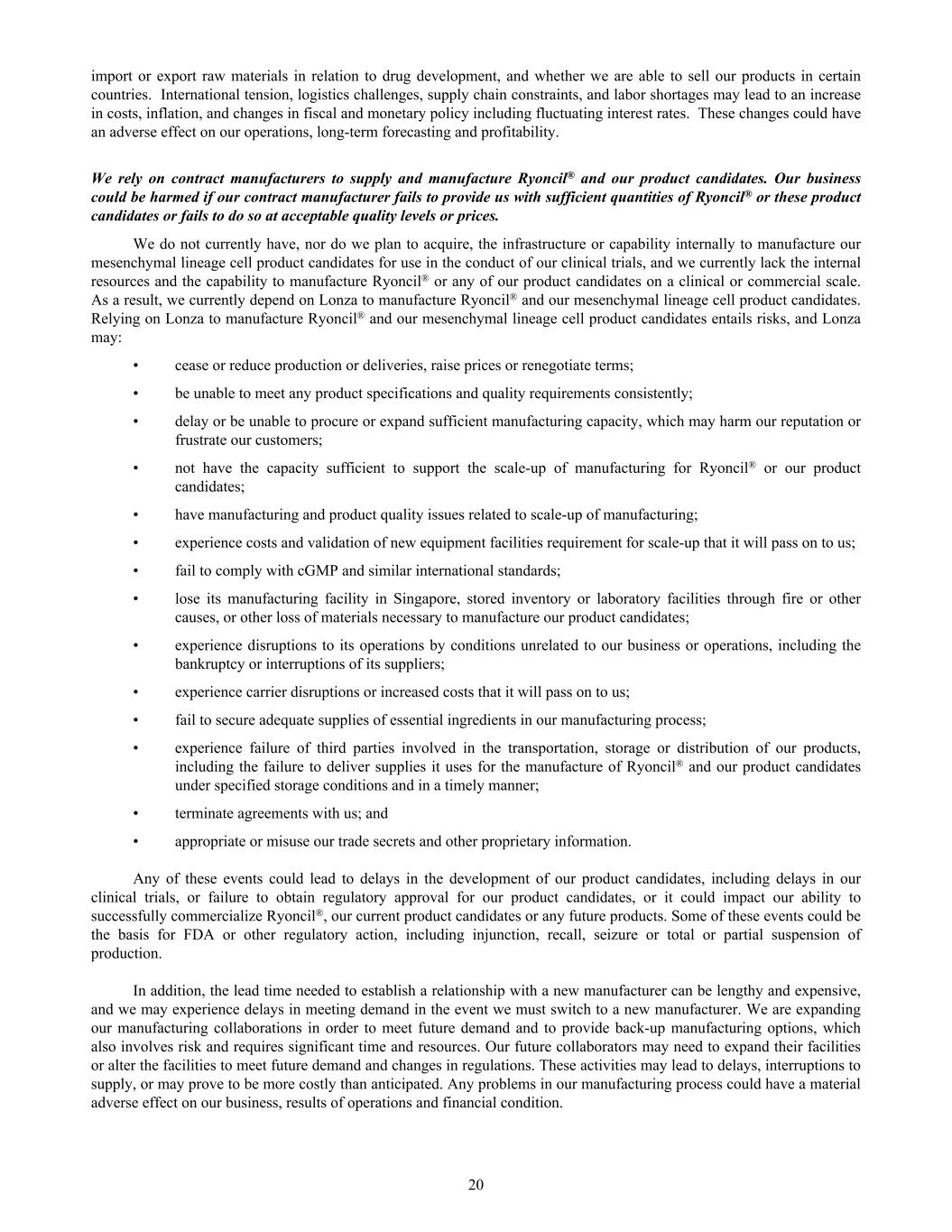 import or export raw materials in relation to drug development, and whether we are able to sell our products in certain countries. International tension, logistics challenges, supply chain constraints, and labor shortages may lead to an increase in costs, inflation, and changes in fiscal and monetary policy including fluctuating interest rates. These changes could have an adverse effect on our operations, long-term forecasting and profitability. We rely on contract manufacturers to supply and manufacture Ryoncil® and our product candidates. Our business could be harmed if our contract manufacturer fails to provide us with sufficient quantities of Ryoncil® or these product candidates or fails to do so at acceptable quality levels or prices. We do not currently have, nor do we plan to acquire, the infrastructure or capability internally to manufacture our mesenchymal lineage cell product candidates for use in the conduct of our clinical trials, and we currently lack the internal resources and the capability to manufacture Ryoncil® or any of our product candidates on a clinical or commercial scale. As a result, we currently depend on Lonza to manufacture Ryoncil® and our mesenchymal lineage cell product candidates. Relying on Lonza to manufacture Ryoncil® and our mesenchymal lineage cell product candidates entails risks, and Lonza may: • cease or reduce production or deliveries, raise prices or renegotiate terms; • be unable to meet any product specifications and quality requirements consistently; • delay or be unable to procure or expand sufficient manufacturing capacity, which may harm our reputation or frustrate our customers; • not have the capacity sufficient to support the scale-up of manufacturing for Ryoncil® or our product candidates; • have manufacturing and product quality issues related to scale-up of manufacturing; • experience costs and validation of new equipment facilities requirement for scale-up that it will pass on to us; • fail to comply with cGMP and similar international standards; • lose its manufacturing facility in Singapore, stored inventory or laboratory facilities through fire or other causes, or other loss of materials necessary to manufacture our product candidates; • experience disruptions to its operations by conditions unrelated to our business or operations, including the bankruptcy or interruptions of its suppliers; • experience carrier disruptions or increased costs that it will pass on to us; • fail to secure adequate supplies of essential ingredients in our manufacturing process; • experience failure of third parties involved in the transportation, storage or distribution of our products, including the failure to deliver supplies it uses for the manufacture of Ryoncil® and our product candidates under specified storage conditions and in a timely manner; • terminate agreements with us; and • appropriate or misuse our trade secrets and other proprietary information. Any of these events could lead to delays in the development of our product candidates, including delays in our clinical trials, or failure to obtain regulatory approval for our product candidates, or it could impact our ability to successfully commercialize Ryoncil®, our current product candidates or any future products. Some of these events could be the basis for FDA or other regulatory action, including injunction, recall, seizure or total or partial suspension of production. In addition, the lead time needed to establish a relationship with a new manufacturer can be lengthy and expensive, and we may experience delays in meeting demand in the event we must switch to a new manufacturer. We are expanding our manufacturing collaborations in order to meet future demand and to provide back-up manufacturing options, which also involves risk and requires significant time and resources. Our future collaborators may need to expand their facilities or alter the facilities to meet future demand and changes in regulations. These activities may lead to delays, interruptions to supply, or may prove to be more costly than anticipated. Any problems in our manufacturing process could have a material adverse effect on our business, results of operations and financial condition. 20