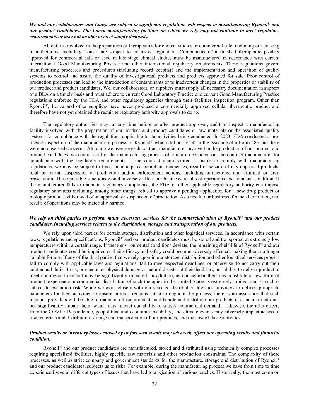 We and our collaborators and Lonza are subject to significant regulation with respect to manufacturing Ryoncil® and our product candidates. The Lonza manufacturing facilities on which we rely may not continue to meet regulatory requirements or may not be able to meet supply demands. All entities involved in the preparation of therapeutics for clinical studies or commercial sale, including our existing manufacturers, including Lonza, are subject to extensive regulation. Components of a finished therapeutic product approved for commercial sale or used in late-stage clinical studies must be manufactured in accordance with current international Good Manufacturing Practice and other international regulatory requirements. These regulations govern manufacturing processes and procedures (including record keeping) and the implementation and operation of quality systems to control and assure the quality of investigational products and products approved for sale. Poor control of production processes can lead to the introduction of contaminants or to inadvertent changes in the properties or stability of our product and product candidates. We, our collaborators, or suppliers must supply all necessary documentation in support of a BLA on a timely basis and must adhere to current Good Laboratory Practice and current Good Manufacturing Practice regulations enforced by the FDA and other regulatory agencies through their facilities inspection program. Other than Ryoncil®, Lonza and other suppliers have never produced a commercially approved cellular therapeutic product and therefore have not yet obtained the requisite regulatory authority approvals to do so. The regulatory authorities may, at any time before or after product approval, audit or inspect a manufacturing facility involved with the preparation of our product and product candidates or raw materials or the associated quality systems for compliance with the regulations applicable to the activities being conducted. In 2023, FDA conducted a pre- license inspection of the manufacturing process of Ryoncil® which did not result in the issuance of a Form 483 and there were no observed concerns. Although we oversee each contract manufacturer involved in the production of our product and product candidates, we cannot control the manufacturing process of, and are dependent on, the contract manufacturer for compliance with the regulatory requirements. If the contract manufacturer is unable to comply with manufacturing regulations, we may be subject to fines, unanticipated compliance expenses, recall or seizure of any approved products, total or partial suspension of production and/or enforcement actions, including injunctions, and criminal or civil prosecution. These possible sanctions would adversely affect our business, results of operations and financial condition. If the manufacturer fails to maintain regulatory compliance, the FDA or other applicable regulatory authority can impose regulatory sanctions including, among other things, refusal to approve a pending application for a new drug product or biologic product, withdrawal of an approval, or suspension of production. As a result, our business, financial condition, and results of operations may be materially harmed. We rely on third parties to perform many necessary services for the commercialization of Ryoncil® and our product candidates, including services related to the distribution, storage and transportation of our products. We rely upon third parties for certain storage, distribution and other logistical services. In accordance with certain laws, regulations and specifications, Ryoncil® and our product candidates must be stored and transported at extremely low temperatures within a certain range. If these environmental conditions deviate, the remaining shelf-life of Ryoncil® and our product candidates could be impaired or their efficacy and safety could become adversely affected, making them no longer suitable for use. If any of the third parties that we rely upon in our storage, distribution and other logistical services process fail to comply with applicable laws and regulations, fail to meet expected deadlines, or otherwise do not carry out their contractual duties to us, or encounter physical damage or natural disaster at their facilities, our ability to deliver product to meet commercial demand may be significantly impaired. In addition, as our cellular therapies constitute a new form of product, experience in commercial distribution of such therapies in the United States is extremely limited, and as such is subject to execution risk. While we work closely with our selected distribution logistics providers to define appropriate parameters for their activities to ensure product remains intact throughout the process, there is no assurance that such logistics providers will be able to maintain all requirements and handle and distribute our products in a manner that does not significantly impair them, which may impact our ability to satisfy commercial demand. Likewise, the after-effects from the COVID-19 pandemic, geopolitical and economic instability, and climate events may adversely impact access to raw materials and distribution, storage and transportation of our products, and the cost of those activities. Product recalls or inventory losses caused by unforeseen events may adversely affect our operating results and financial condition. Ryoncil® and our product candidates are manufactured, stored and distributed using technically complex processes requiring specialized facilities, highly specific raw materials and other production constraints. The complexity of these processes, as well as strict company and government standards for the manufacture, storage and distribution of Ryoncil® and our product candidates, subjects us to risks. For example, during the manufacturing process we have from time to time experienced several different types of issues that have led to a rejection of 
