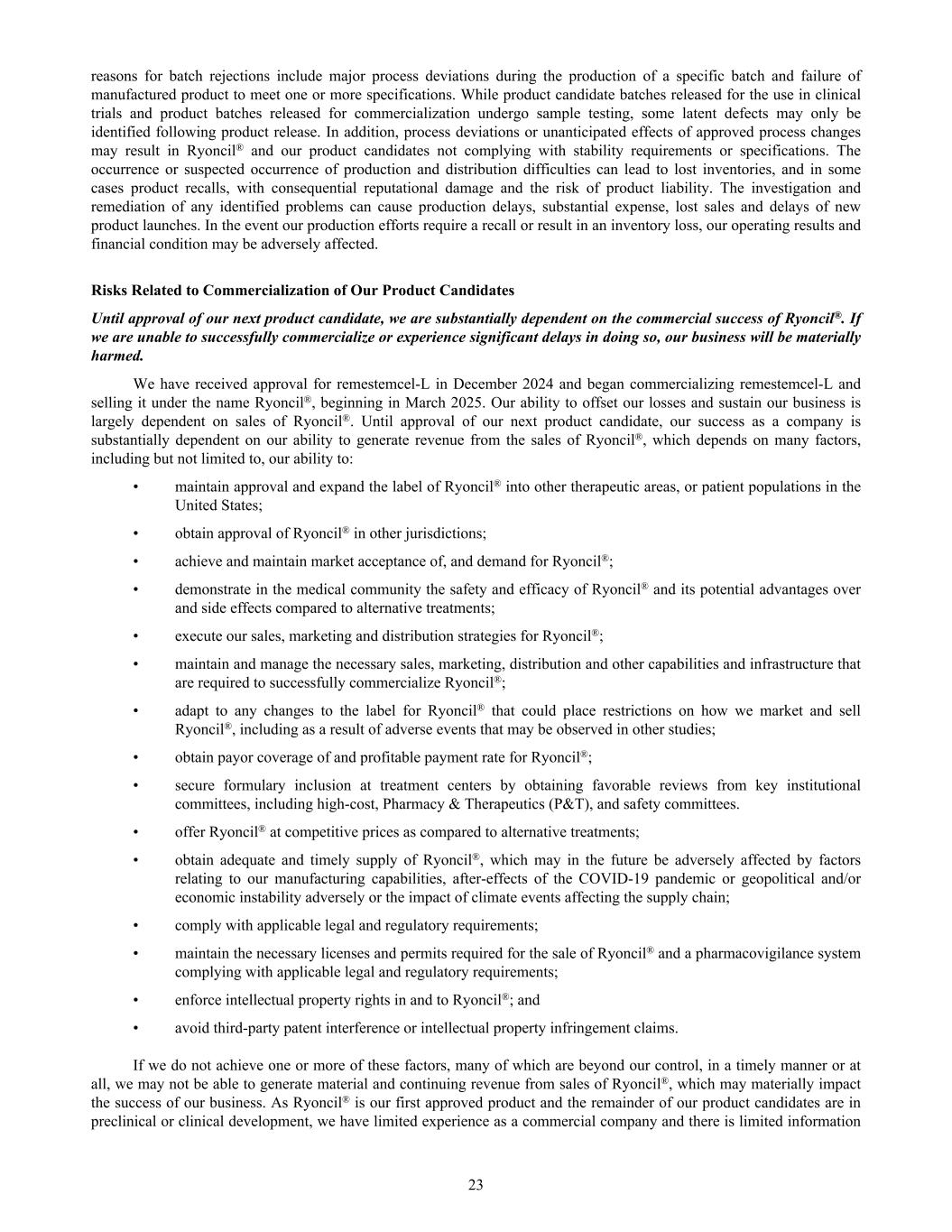reasons for batch rejections include major process deviations during the production of a specific batch and failure of manufactured product to meet one or more specifications. While product candidate batches released for the use in clinical trials and product batches released for commercialization undergo sample testing, some latent defects may only be identified following product release. In addition, process deviations or unanticipated effects of approved process changes may result in Ryoncil® and our product candidates not complying with stability requirements or specifications. The occurrence or suspected occurrence of production and distribution difficulties can lead to lost inventories, and in some cases product recalls, with consequential reputational damage and the risk of product liability. The investigation and remediation of any identified problems can cause production delays, substantial expense, lost sales and delays of new product launches. In the event our production efforts require a recall or result in an inventory loss, our operating results and financial condition may be adversely affected. Risks Related to Commercialization of Our Product Candidates Until approval of our next product candidate, we are substantially dependent on the commercial success of Ryoncil®. If we are unable to successfully commercialize or experience significant delays in doing so, our business will be materially harmed. We have received approval for remestemcel-L in December 2024 and began commercializing remestemcel-L and selling it under the name Ryoncil®, beginning in March 2025. Our ability to offset our losses and sustain our business is largely dependent on sales of Ryoncil®. Until approval of our next product candidate, our success as a company is substantially dependent on our ability to generate revenue from the sales of Ryoncil®, which depends on many factors, including but not limited to, our ability to: • maintain approval and expand the label of Ryoncil® into other therapeutic areas, or patient populations in the United States; • obtain approval of Ryoncil® in other jurisdictions; • achieve and maintain market acceptance of, and demand for Ryoncil®; • demonstrate in the medical community the safety and efficacy of Ryoncil® and its potential advantages over and side effects compared to alternative treatments; • execute our sales, marketing and distribution strategies for Ryoncil®; • maintain and manage the necessary sales, marketing, distribution and other capabilities and infrastructure that are required to successfully commercialize Ryoncil®; • adapt to any changes to the label for Ryoncil® that could place restrictions on how we market and sell Ryoncil®, including as a result of adverse events that may be observed in other studies; • obtain payor coverage of and profitable payment rate for Ryoncil®; • secure formulary inclusion at treatment centers by obtaining favorable reviews from key institutional committees, including high-cost, Pharmacy & Therapeutics (P&T), and safety committees. • offer Ryoncil® at competitive prices as compared to alternative treatments; • obtain adequate and timely supply of Ryoncil®, which may in the future be adversely affected by factors relating to our manufacturing capabilities, after-effects of the COVID-19 pandemic or geopolitical and/or economic instability adversely or the impact of climate events affecting the supply chain; • comply with applicable legal and regulatory requirements; • maintain the necessary licenses and permits required for the sale of Ryoncil® and a pharmacovigilance system complying with applicable legal and regulatory requirements; • enforce intellectual property rights in and to Ryoncil®; and • avoid third-party patent interference or intellectual property infringement claims. If we do not achieve one or more of these factors, many of which are beyond our control, in a timely manner or at all, we may not be able to generate material and continuing revenue from sales of Ryoncil®, which may materially impact the success of our business. As Ryoncil® is our first approved product and the remainder of our product candidates are in preclinical or clinical development, we have limited experience as a commercial company and there is limited information 23