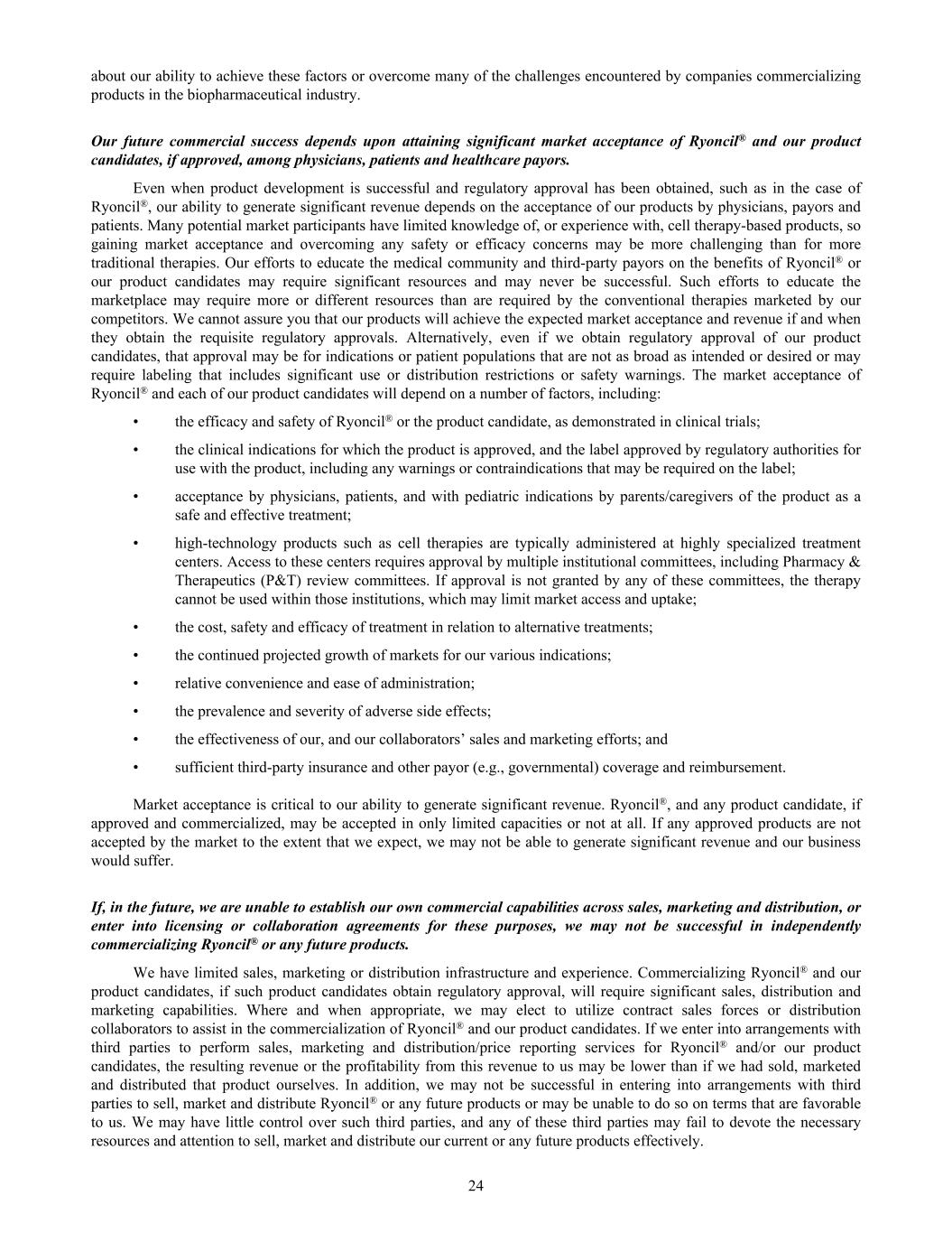about our ability to achieve these factors or overcome many of the challenges encountered by companies commercializing products in the biopharmaceutical industry. Our future commercial success depends upon attaining significant market acceptance of Ryoncil® and our product candidates, if approved, among physicians, patients and healthcare payors. Even when product development is successful and regulatory approval has been obtained, such as in the case of Ryoncil®, our ability to generate significant revenue depends on the acceptance of our products by physicians, payors and patients. Many potential market participants have limited knowledge of, or experience with, cell therapy-based products, so gaining market acceptance and overcoming any safety or efficacy concerns may be more challenging than for more traditional therapies. Our efforts to educate the medical community and third-party payors on the benefits of Ryoncil® or our product candidates may require significant resources and may never be successful. Such efforts to educate the marketplace may require more or different resources than are required by the conventional therapies marketed by our competitors. We cannot assure you that our products will achieve the expected market acceptance and revenue if and when they obtain the requisite regulatory approvals. Alternatively, even if we obtain regulatory approval of our product candidates, that approval may be for indications or patient populations that are not as broad as intended or desired or may require labeling that includes significant use or distribution restrictions or safety warnings. The market acceptance of Ryoncil® and each of our product candidates will depend on a number of factors, including: • the efficacy and safety of Ryoncil® or the product candidate, as demonstrated in clinical trials; • the clinical indications for which the product is approved, and the label approved by regulatory authorities for use with the product, including any warnings or contraindications that may be required on the label; • acceptance by physicians, patients, and with pediatric indications by parents/caregivers of the product as a safe and effective treatment; • high-technology products such as cell therapies are typically administered at highly specialized treatment centers. Access to these centers requires approval by multiple institutional committees, including Pharmacy & Therapeutics (P&T) review committees. If approval is not granted by any of these committees, the therapy cannot be used within those institutions, which may limit market access and uptake; • the cost, safety and efficacy of treatment in relation to alternative treatments; • the continued projected growth of markets for our various indications; • relative convenience and ease of administration; • the prevalence and severity of adverse side effects; • the effectiveness of our, and our collaborators’ sales and marketing efforts; and • sufficient third-party insurance and other payor (e.g., governmental) coverage and reimbursement. Market acceptance is critical to our ability to generate significant revenue. Ryoncil®, and any product candidate, if approved and commercialized, may be accepted in only limited capacities or not at all. If any approved products are not accepted by the market to the extent that we expect, we may not be able to generate significant revenue and our business would suffer. If, in the future, we are unable to establish our own commercial capabilities across sales, marketing and distribution, or enter into licensing or collaboration agreements for these purposes, we may not be successful in independently commercializing Ryoncil® or any future products. We have limited sales, marketing or distribution infrastructure and experience. Commercializing Ryoncil® and our product candidates, if such product candidates obtain regulatory approval, will require significant sales, distribution and marketing capabilities. Where and when appropriate, we may elect to utilize contract sales forces or distribution collaborators to assist in the commercialization of Ryoncil® and our product candidates. If we enter into arrangements with third parties to perform sales, marketing and distribution/price reporting services for Ryoncil® and/or our product candidates, the resulting revenue or the profitability from this revenue to us may be lower than if we had sold, marketed and distributed that product ourselves. In addition, we may not be successful in entering into arrangements with third parties to sell, market and distribute Ryoncil® or any future products or may be unable to do so on terms that are favorable to us. We may have little control over such third parties, and any of these third parties may fail to devote the necessary resources and attention to sell, market and distribute our current or any future products effectively. 24