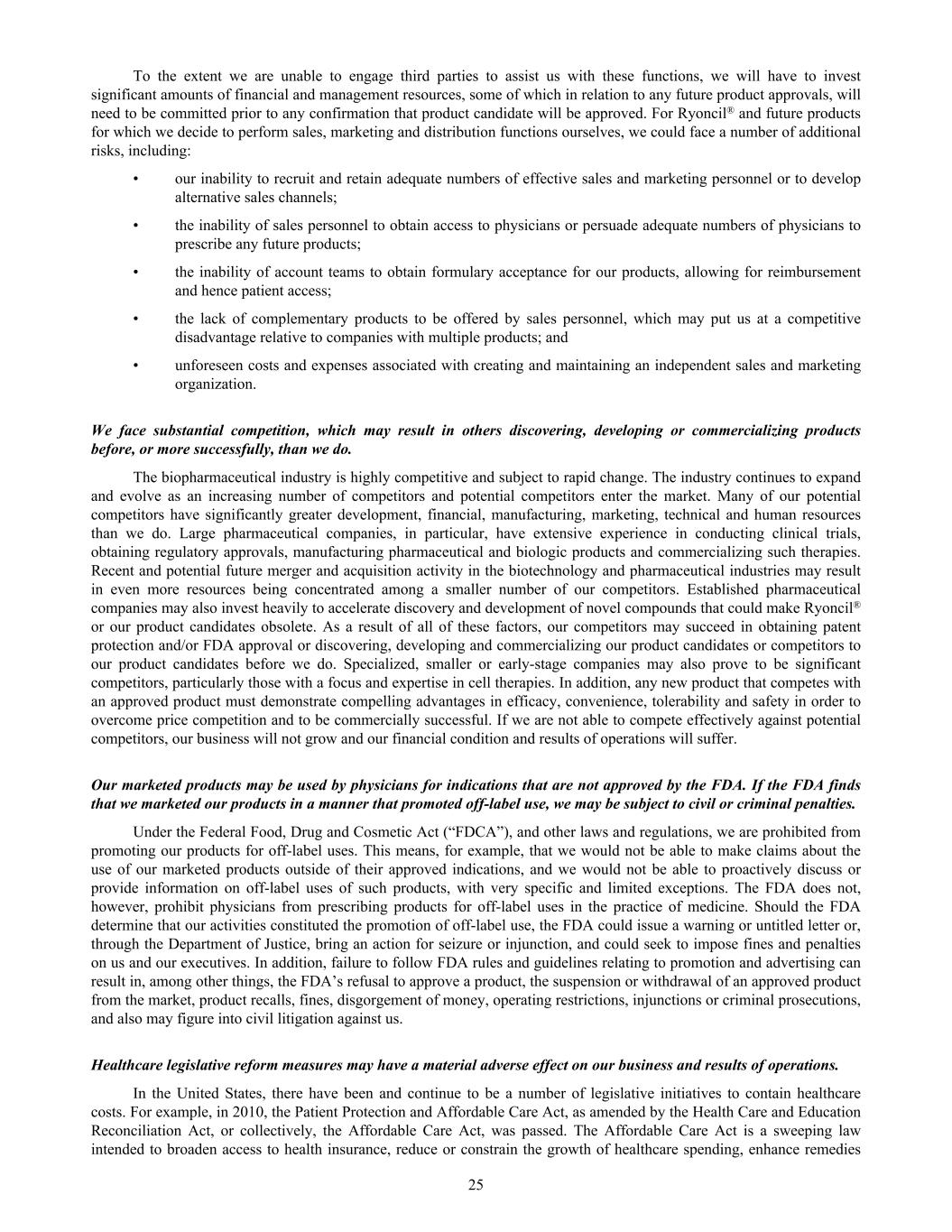To the extent we are unable to engage third parties to assist us with these functions, we will have to invest significant amounts of financial and management resources, some of which in relation to any future product approvals, will need to be committed prior to any confirmation that product candidate will be approved. For Ryoncil® and future products for which we decide to perform sales, marketing and distribution functions ourselves, we could face a number of additional risks, including: • our inability to recruit and retain adequate numbers of effective sales and marketing personnel or to develop alternative sales channels; • the inability of sales personnel to obtain access to physicians or persuade adequate numbers of physicians to prescribe any future products; • the inability of account teams to obtain formulary acceptance for our products, allowing for reimbursement and hence patient access; • the lack of complementary products to be offered by sales personnel, which may put us at a competitive disadvantage relative to companies with multiple products; and • unforeseen costs and expenses associated with creating and maintaining an independent sales and marketing organization. We face substantial competition, which may result in others discovering, developing or commercializing products before, or more successfully, than we do. The biopharmaceutical industry is highly competitive and subject to rapid change. The industry continues to expand and evolve as an increasing number of competitors and potential competitors enter the market. Many of our potential competitors have significantly greater development, financial, manufacturing, marketing, technical and human resources than we do. Large pharmaceutical companies, in particular, have extensive experience in conducting clinical trials, obtaining regulatory approvals, manufacturing pharmaceutical and biologic products and commercializing such therapies. Recent and potential future merger and acquisition activity in the biotechnology and pharmaceutical industries may result in even more resources being concentrated among a smaller number of our competitors. Established pharmaceutical companies may also invest heavily to accelerate discovery and development of novel compounds that could make Ryoncil® or our product candidates obsolete. As a result of all of these factors, our competitors may succeed in obtaining patent protection and/or FDA approval or discovering, developing and commercializing our product candidates or competitors to our product candidates before we do. Specialized, smaller or early-stage companies may also prove to be significant competitors, particularly those with a focus and expertise in cell therapies. In addition, any new product that competes with an approved product must demonstrate compelling advantages in efficacy, convenience, tolerability and safety in order to overcome price competition and to be commercially successful. If we are not able to compete effectively against potential competitors, our business will not grow and our financial condition and results of operations will suffer. Our marketed products may be used by physicians for indications that are not approved by the FDA. If the FDA finds that we marketed our products in a manner that promoted off-label use, we may be subject to civil or criminal penalties. Under the Federal Food, Drug and Cosmetic Act (“FDCA”), and other laws and regulations, we are prohibited from promoting our products for off-label uses. This means, for example, that we would not be able to make claims about the use of our marketed products outside of their approved indications, and we would not be able to proactively discuss or provide information on off-label uses of such products, with very specific and limited exceptions. The FDA does not, however, prohibit physicians from prescribing products for off-label uses in the practice of medicine. Should the FDA determine that our activities constituted the promotion of off-label use, the FDA could issue a warning or untitled letter or, through the Department of Justice, bring an action for seizure or injunction, and could seek to impose fines and penalties on us and our executives. In addition, failure to follow FDA rules and guidelines relating to promotion and advertising can result in, among other things, the FDA’s refusal to approve a product, the suspension or withdrawal of an approved product from the market, product recalls, fines, disgorgement of money, operating restrictions, injunctions or criminal prosecutions, and also may figure into civil litigation against us. Healthcare legislative reform measures may have a material adverse effect on our business and results of operations. In the United States, there have been and continue to be a number of legislative initiatives to contain healthcare costs. For example, in 2010, the Patient Protection and Affordable Care Act, as amended by the Health Care and Education Reconciliation Act, or collectively, the Affordable Care Act, was passed. The Affordable Care Act is a sweeping law intended to broaden access to health insurance, reduce or constrain the growth of healthcare spending, enhance remedies 25