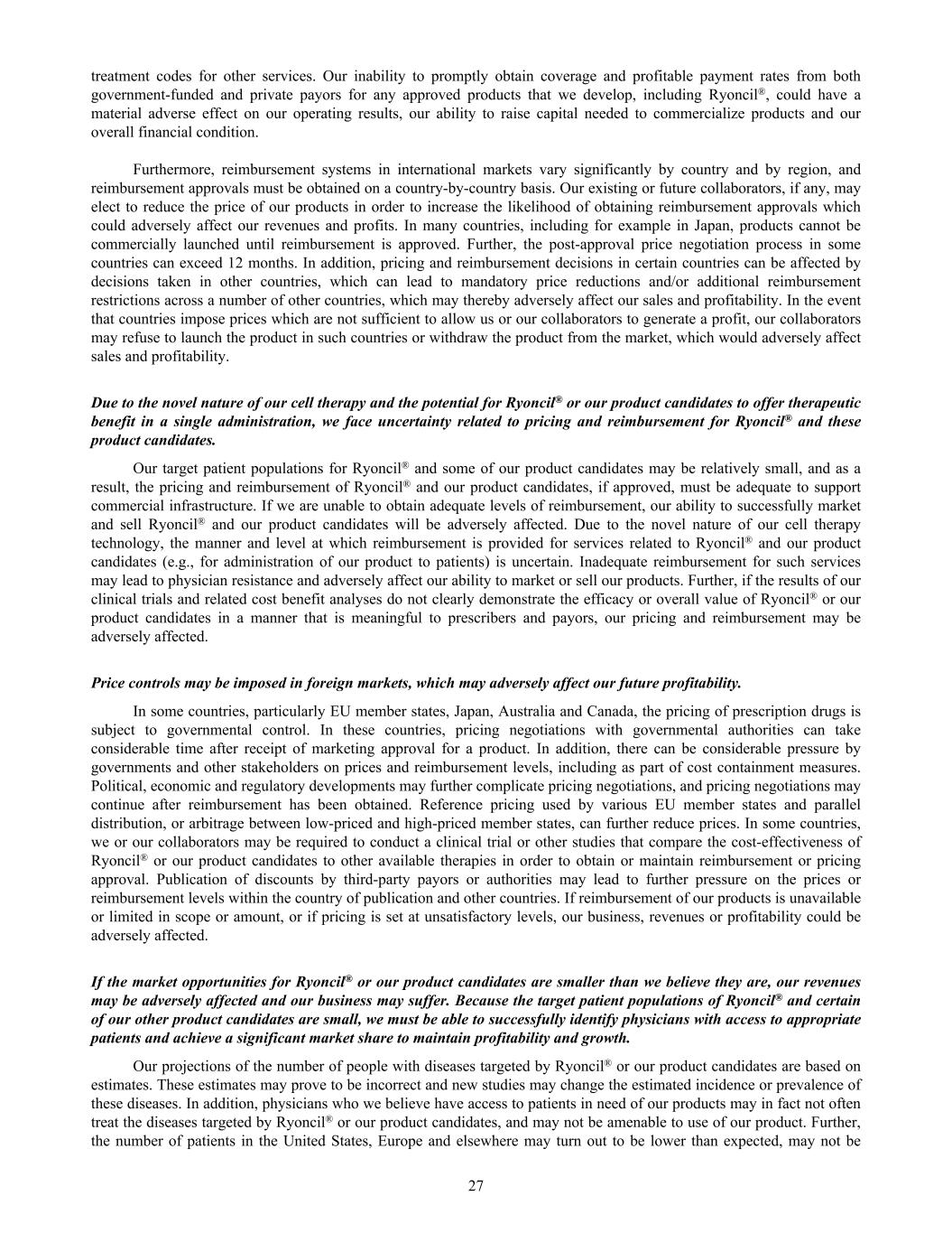 treatment codes for other services. Our inability to promptly obtain coverage and profitable payment rates from both government-funded and private payors for any approved products that we develop, including Ryoncil®, could have a material adverse effect on our operating results, our ability to raise capital needed to commercialize products and our overall financial condition. Furthermore, reimbursement systems in international markets vary significantly by country and by region, and reimbursement approvals must be obtained on a country-by-country basis. Our existing or future collaborators, if any, may elect to reduce the price of our products in order to increase the likelihood of obtaining reimbursement approvals which could adversely affect our revenues and profits. In many countries, including for example in Japan, products cannot be commercially launched until reimbursement is approved. Further, the post-approval price negotiation process in some countries can exceed 12 months. In addition, pricing and reimbursement decisions in certain countries can be affected by decisions taken in other countries, which can lead to mandatory price reductions and/or additional reimbursement restrictions across a number of other countries, which may thereby adversely affect our sales and profitability. In the event that countries impose prices which are not sufficient to allow us or our collaborators to generate a profit, our collaborators may refuse to launch the product in such countries or withdraw the product from the market, which would adversely affect sales and profitability. Due to the novel nature of our cell therapy and the potential for Ryoncil® or our product candidates to offer therapeutic benefit in a single administration, we face uncertainty related to pricing and reimbursement for Ryoncil® and these product candidates. Our target patient populations for Ryoncil® and some of our product candidates may be relatively small, and as a result, the pricing and reimbursement of Ryoncil® and our product candidates, if approved, must be adequate to support commercial infrastructure. If we are unable to obtain adequate levels of reimbursement, our ability to successfully market and sell Ryoncil® and our product candidates will be adversely affected. Due to the novel nature of our cell therapy technology, the manner and level at which reimbursement is provided for services related to Ryoncil® and our product candidates (e.g., for administration of our product to patients) is uncertain. Inadequate reimbursement for such services may lead to physician resistance and adversely affect our ability to market or sell our products. Further, if the results of our clinical trials and related cost benefit analyses do not clearly demonstrate the efficacy or overall value of Ryoncil® or our product candidates in a manner that is meaningful to prescribers and payors, our pricing and reimbursement may be adversely affected. Price controls may be imposed in foreign markets, which may adversely affect our future profitability. In some countries, particularly EU member states, Japan, Australia and Canada, the pricing of prescription drugs is subject to governmental control. In these countries, pricing negotiations with governmental authorities can take considerable time after receipt of marketing approval for a product. In addition, there can be considerable pressure by governments and other stakeholders on prices and reimbursement levels, including as part of cost containment measures. Political, economic and regulatory developments may further complicate pricing negotiations, and pricing negotiations may continue after reimbursement has been obtained. Reference pricing used by various EU member states and parallel distribution, or arbitrage between low-priced and high-priced member states, can further reduce prices. In some countries, we or our collaborators may be required to conduct a clinical trial or other studies that compare the cost-effectiveness of Ryoncil® or our product candidates to other available therapies in order to obtain or maintain reimbursement or pricing approval. Publication of discounts by third-party payors or authorities may lead to further pressure on the prices or reimbursement levels within the country of publication and other countries. If reimbursement of our products is unavailable or limited in scope or amount, or if pricing is set at unsatisfactory levels, our business, revenues or profitability could be adversely affected. If the market opportunities for Ryoncil® or our product candidates are smaller than we believe they are, our revenues may be adversely affected and our business may suffer. Because the target patient populations of Ryoncil® and certain of our other product candidates are small, we must be able to successfully identify physicians with access to appropriate patients and achieve a significant market share to maintain profitability and growth. Our projections of the number of people with diseases targeted by Ryoncil® or our product candidates are based on estimates. These estimates may prove to be incorrect and new studies may change the estimated incidence or prevalence of these diseases. In addition, physicians who we believe have access to patients in need of our products may in fact not often treat the diseases targeted by Ryoncil® or our product candidates, and may not be amenable to use of our product. Further, the number of patients in the United States, Europe and elsewhere may turn out to be lower than expected, may not be 27