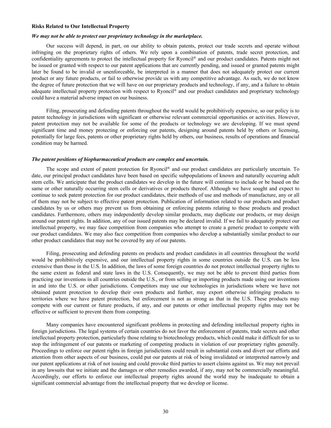 Risks Related to Our Intellectual Property We may not be able to protect our proprietary technology in the marketplace. Our success will depend, in part, on our ability to obtain patents, protect our trade secrets and operate without infringing on the proprietary rights of others. We rely upon a combination of patents, trade secret protection, and confidentiality agreements to protect the intellectual property for Ryoncil® and our product candidates. Patents might not be issued or granted with respect to our patent applications that are currently pending, and issued or granted patents might later be found to be invalid or unenforceable, be interpreted in a manner that does not adequately protect our current product or any future products, or fail to otherwise provide us with any competitive advantage. As such, we do not know the degree of future protection that we will have on our proprietary products and technology, if any, and a failure to obtain adequate intellectual property protection with respect to Ryoncil® and our product candidates and proprietary technology could have a material adverse impact on our business. Filing, prosecuting and defending patents throughout the world would be prohibitively expensive, so our policy is to patent technology in jurisdictions with significant or otherwise relevant commercial opportunities or activities. However, patent protection may not be available for some of the products or technology we are developing. If we must spend significant time and money protecting or enforcing our patents, designing around patents held by others or licensing, potentially for large fees, patents or other proprietary rights held by others, our business, results of operations and financial condition may be harmed. The patent positions of biopharmaceutical products are complex and uncertain. The scope and extent of patent protection for Ryoncil® and our product candidates are particularly uncertain. To date, our principal product candidates have been based on specific subpopulations of known and naturally occurring adult stem cells. We anticipate that the product candidates we develop in the future will continue to include or be based on the same or other naturally occurring stem cells or derivatives or products thereof. Although we have sought and expect to continue to seek patent protection for our product candidates, their methods of use and methods of manufacture, any or all of them may not be subject to effective patent protection. Publication of information related to our products and product candidates by us or others may prevent us from obtaining or enforcing patents relating to these products and product candidates. Furthermore, others may independently develop similar products, may duplicate our products, or may design around our patent rights. In addition, any of our issued patents may be declared invalid. If we fail to adequately protect our intellectual property, we may face competition from companies who attempt to create a generic product to compete with our product candidates. We may also face competition from companies who develop a substantially similar product to our other product candidates that may not be covered by any of our patents. Filing, prosecuting and defending patents on products and product candidates in all countries throughout the world would be prohibitively expensive, and our intellectual property rights in some countries outside the U.S. can be less extensive than those in the U.S. In addition, the laws of some foreign countries do not protect intellectual property rights to the same extent as federal and state laws in the U.S. Consequently, we may not be able to prevent third parties from practicing our inventions in all countries outside the U.S., or from selling or importing products made using our inventions in and into the U.S. or other jurisdictions. Competitors may use our technologies in jurisdictions where we have not obtained patent protection to develop their own products and further, may export otherwise infringing products to territories where we have patent protection, but enforcement is not as strong as that in the U.S. These products may compete with our current or future products, if any, and our patents or other intellectual property rights may not be effective or sufficient to prevent them from competing. Many companies have encountered significant problems in protecting and defending intellectual property rights in foreign jurisdictions. The legal systems of certain countries do not favor the enforcement of patents, trade secrets and other intellectual property protection, particularly those relating to biotechnology products, which could make it difficult for us to stop the infringement of our patents or marketing of competing products in violation of our proprietary rights generally. Proceedings to enforce our patent rights in foreign jurisdictions could result in substantial costs and divert our efforts and attention from other aspects of our business, could put our patents at risk of being invalidated or interpreted narrowly and our patent applications at risk of not issuing and could provoke third parties to assert claims against us. We may not prevail in any lawsuits that we initiate and the damages or other remedies awarded, if any, may not be commercially meaningful. Accordingly, our efforts to enforce our intellectual property rights around the world may be inadequate to obtain a significant commercial advantage from the intellectual property that we develop or license. 30