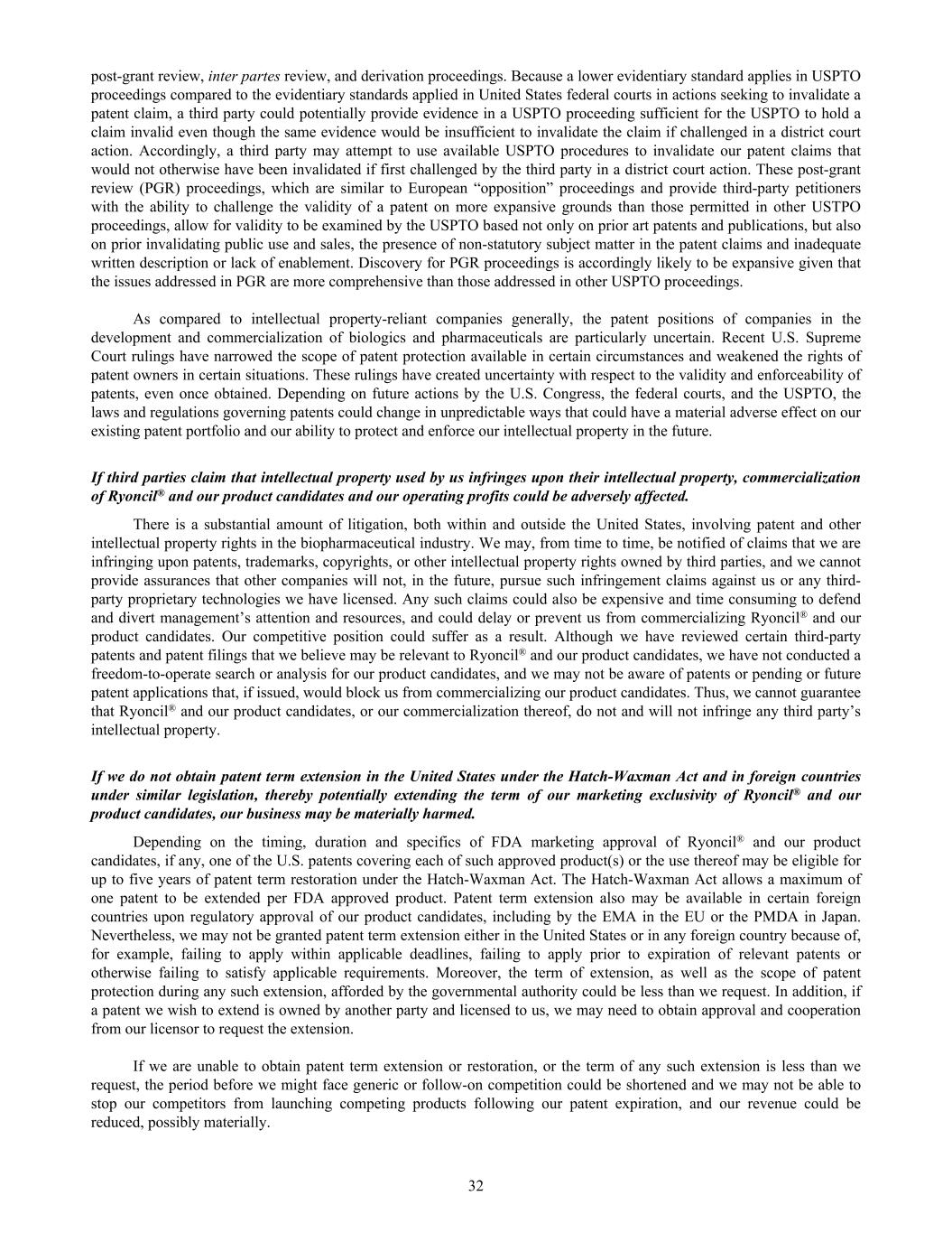 post-grant review, inter partes review, and derivation proceedings. Because a lower evidentiary standard applies in USPTO proceedings compared to the evidentiary standards applied in United States federal courts in actions seeking to invalidate a patent claim, a third party could potentially provide evidence in a USPTO proceeding sufficient for the USPTO to hold a claim invalid even though the same evidence would be insufficient to invalidate the claim if challenged in a district court action. Accordingly, a third party may attempt to use available USPTO procedures to invalidate our patent claims that would not otherwise have been invalidated if first challenged by the third party in a district court action. These post-grant review (PGR) proceedings, which are similar to European “opposition” proceedings and provide third-party petitioners with the ability to challenge the validity of a patent on more expansive grounds than those permitted in other USTPO proceedings, allow for validity to be examined by the USPTO based not only on prior art patents and publications, but also on prior invalidating public use and sales, the presence of non-statutory subject matter in the patent claims and inadequate written description or lack of enablement. Discovery for PGR proceedings is accordingly likely to be expansive given that the issues addressed in PGR are more comprehensive than those addressed in other USPTO proceedings. As compared to intellectual property-reliant companies generally, the patent positions of companies in the development and commercialization of biologics and pharmaceuticals are particularly uncertain. Recent U.S. Supreme Court rulings have narrowed the scope of patent protection available in certain circumstances and weakened the rights of patent owners in certain situations. These rulings have created uncertainty with respect to the validity and enforceability of patents, even once obtained. Depending on future actions by the U.S. Congress, the federal courts, and the USPTO, the laws and regulations governing patents could change in unpredictable ways that could have a material adverse effect on our existing patent portfolio and our ability to protect and enforce our intellectual property in the future. If third parties claim that intellectual property used by us infringes upon their intellectual property, commercialization of Ryoncil® and our product candidates and our operating profits could be adversely affected. There is a substantial amount of litigation, both within and outside the United States, involving patent and other intellectual property rights in the biopharmaceutical industry. We may, from time to time, be notified of claims that we are infringing upon patents, trademarks, copyrights, or other intellectual property rights owned by third parties, and we cannot provide assurances that other companies will not, in the future, pursue such infringement claims against us or any third- party proprietary technologies we have licensed. Any such claims could also be expensive and time consuming to defend and divert management’s attention and resources, and could delay or prevent us from commercializing Ryoncil® and our product candidates. Our competitive position could suffer as a result. Although we have reviewed certain third-party patents and patent filings that we believe may be relevant to Ryoncil® and our product candidates, we have not conducted a freedom-to-operate search or analysis for our product candidates, and we may not be aware of patents or pending or future patent applications that, if issued, would block us from commercializing our product candidates. Thus, we cannot guarantee that Ryoncil® and our product candidates, or our commercialization thereof, do not and will not infringe any third party’s intellectual property. If we do not obtain patent term extension in the United States under the Hatch-Waxman Act and in foreign countries under similar legislation, thereby potentially extending the term of our marketing exclusivity of Ryoncil® and our product candidates, our business may be materially harmed. Depending on the timing, duration and specifics of FDA marketing approval of Ryoncil® and our product candidates, if any, one of the U.S. patents covering each of such approved product(s) or the use thereof may be eligible for up to five years of patent term restoration under the Hatch-Waxman Act. The Hatch-Waxman Act allows a maximum of one patent to be extended per FDA approved product. Patent term extension also may be available in certain foreign countries upon regulatory approval of our product candidates, including by the EMA in the EU or the PMDA in Japan. Nevertheless, we may not be granted patent term extension either in the United States or in any foreign country because of, for example, failing to apply within applicable deadlines, failing to apply prior to expiration of relevant patents or otherwise failing to satisfy applicable requirements. Moreover, the term of extension, as well as the scope of patent protection during any such extension, afforded by the governmental authority could be less than we request. In addition, if a patent we wish to extend is owned by another party and licensed to us, we may need to obtain approval and cooperation from our licensor to request the extension. If we are unable to obtain patent term extension or restoration, or the term of any such extension is less than we request, the period before we might face generic or follow-on competition could be shortened and we may not be able to stop our competitors from launching competing products following our patent expiration, and our revenue could be reduced, possibly materially. 32