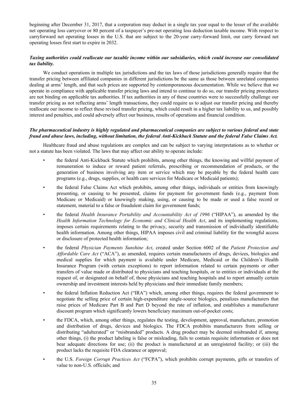 beginning after December 31, 2017, that a corporation may deduct in a single tax year equal to the lesser of the available net operating loss carryover or 80 percent of a taxpayer’s pre-net operating loss deduction taxable income. With respect to carryforward net operating losses in the U.S. that are subject to the 20-year carry-forward limit, our carry forward net operating losses first start to expire in 2032. Taxing authorities could reallocate our taxable income within our subsidiaries, which could increase our consolidated tax liability. We conduct operations in multiple tax jurisdictions and the tax laws of those jurisdictions generally require that the transfer pricing between affiliated companies in different jurisdictions be the same as those between unrelated companies dealing at arms’ length, and that such prices are supported by contemporaneous documentation. While we believe that we operate in compliance with applicable transfer pricing laws and intend to continue to do so, our transfer pricing procedures are not binding on applicable tax authorities. If tax authorities in any of these countries were to successfully challenge our transfer pricing as not reflecting arms’ length transactions, they could require us to adjust our transfer pricing and thereby reallocate our income to reflect these revised transfer pricing, which could result in a higher tax liability to us, and possibly interest and penalties, and could adversely affect our business, results of operations and financial condition. The pharmaceutical industry is highly regulated and pharmaceutical companies are subject to various federal and state fraud and abuse laws, including, without limitation, the federal Anti-Kickback Statute and the federal False Claims Act. Healthcare fraud and abuse regulations are complex and can be subject to varying interpretations as to whether or not a statute has been violated. The laws that may affect our ability to operate include: • the federal Anti-Kickback Statute which prohibits, among other things, the knowing and willful payment of remuneration to induce or reward patient referrals, prescribing or recommendation of products, or the generation of business involving any item or service which may be payable by the federal health care programs (e.g., drugs, supplies, or health care services for Medicare or Medicaid patients); • the federal False Claims Act which prohibits, among other things, individuals or entities from knowingly presenting, or causing to be presented, claims for payment for government funds (e.g., payment from Medicare or Medicaid) or knowingly making, using, or causing to be made or used a false record or statement, material to a false or fraudulent claim for government funds; • the federal Health Insurance Portability and Accountability Act of 1996 (“HIPAA”), as amended by the Health Information Technology for Economic and Clinical Health Act, and its implementing regulations, imposes certain requirements relating to the privacy, security and transmission of individually identifiable health information. Among other things, HIPAA imposes civil and criminal liability for the wrongful access or disclosure of protected health information; • the federal Physician Payments Sunshine Act, created under Section 6002 of the Patient Protection and Affordable Care Act (“ACA”), as amended, requires certain manufacturers of drugs, devices, biologics and medical supplies for which payment is available under Medicare, Medicaid or the Children’s Health Insurance Program (with certain exceptions) to report information related to certain payments or other transfers of value made or distributed to physicians and teaching hospitals, or to entities or individuals at the request of, or designated on behalf of, those physicians and teaching hospitals and to report annually certain ownership and investment interests held by physicians and their immediate family members; • the federal Inflation Reduction Act (“IRA”) which, among other things, requires the federal government to negotiate the selling price of certain high-expenditure single-source biologics, penalizes manufacturers that raise prices of Medicare Part B and Part D beyond the rate of inflation, and establishes a manufacturer discount program which significantly lowers beneficiary maximum out-of-pocket costs; • the FDCA, which, among other things, regulates the testing, development, approval, manufacture, promotion and distribution of drugs, devices and biologics. The FDCA prohibits manufacturers from selling or distributing “adulterated” or “misbranded” products. A drug product may be deemed misbranded if, among other things, (i) the product labeling is false or misleading, fails to contain requisite information or does not bear adequate directions for use; (ii) the product is manufactured at an unregistered facility; or (iii) the product lacks the requisite FDA clearance or approval; • the U.S. Foreign Corrupt Practices Act (“FCPA”), which prohibits corrupt payments, gifts or transfers of value to non-U.S. officials; and 35