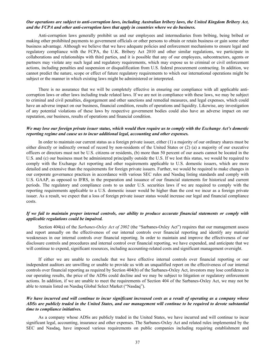 Our operations are subject to anti-corruption laws, including Australian bribery laws, the United Kingdom Bribery Act, and the FCPA and other anti-corruption laws that apply in countries where we do business. Anti-corruption laws generally prohibit us and our employees and intermediaries from bribing, being bribed or making other prohibited payments to government officials or other persons to obtain or retain business or gain some other business advantage. Although we believe that we have adequate policies and enforcement mechanisms to ensure legal and regulatory compliance with the FCPA, the U.K. Bribery Act 2010 and other similar regulations, we participate in collaborations and relationships with third parties, and it is possible that any of our employees, subcontractors, agents or partners may violate any such legal and regulatory requirements, which may expose us to criminal or civil enforcement actions, including penalties and suspension or disqualification from U.S. federal procurement contracting. In addition, we cannot predict the nature, scope or effect of future regulatory requirements to which our international operations might be subject or the manner in which existing laws might be administered or interpreted. There is no assurance that we will be completely effective in ensuring our compliance with all applicable anti- corruption laws or other laws including trade related laws. If we are not in compliance with these laws, we may be subject to criminal and civil penalties, disgorgement and other sanctions and remedial measures, and legal expenses, which could have an adverse impact on our business, financial condition, results of operations and liquidity. Likewise, any investigation of any potential violations of these laws by respective government bodies could also have an adverse impact on our reputation, our business, results of operations and financial condition. We may lose our foreign private issuer status, which would then require us to comply with the Exchange Act’s domestic reporting regime and cause us to incur additional legal, accounting and other expenses. In order to maintain our current status as a foreign private issuer, either (1) a majority of our ordinary shares must be either directly or indirectly owned of record by non-residents of the United States or (2) (a) a majority of our executive officers or directors must not be U.S. citizens or residents, (b) more than 50 percent of our assets cannot be located in the U.S. and (c) our business must be administered principally outside the U.S. If we lost this status, we would be required to comply with the Exchange Act reporting and other requirements applicable to U.S. domestic issuers, which are more detailed and extensive than the requirements for foreign private issuers. Further, we would be required to make changes in our corporate governance practices in accordance with various SEC rules and Nasdaq listing standards and comply with U.S. GAAP, as opposed to IFRS, in the preparation and issuance of our financial statements for historical and current periods. The regulatory and compliance costs to us under U.S. securities laws if we are required to comply with the reporting requirements applicable to a U.S. domestic issuer would be higher than the cost we incur as a foreign private issuer. As a result, we expect that a loss of foreign private issuer status would increase our legal and financial compliance costs. If we fail to maintain proper internal controls, our ability to produce accurate financial statements or comply with applicable regulations could be impaired. Section 404(a) of the Sarbanes-Oxley Act of 2002 (the “Sarbanes-Oxley Act”) requires that our management assess and report annually on the effectiveness of our internal controls over financial reporting and identify any material weaknesses in our internal controls over financial reporting. In order to maintain and improve the effectiveness of our disclosure controls and procedures and internal control over financial reporting, we have expended, and anticipate that we will continue to expend, significant resources, including accounting-related costs and significant management oversight. If either we are unable to conclude that we have effective internal controls over financial reporting or our independent auditors are unwilling or unable to provide us with an unqualified report on the effectiveness of our internal controls over financial reporting as required by Section 404(b) of the Sarbanes-Oxley Act, investors may lose confidence in our operating results, the price of the ADSs could decline and we may be subject to litigation or regulatory enforcement actions. In addition, if we are unable to meet the requirements of Section 404 of the Sarbanes-Oxley Act, we may not be able to remain listed on Nasdaq Global Select Market (“Nasdaq”). We have incurred and will continue to incur significant increased costs as a result of operating as a company whose ADSs are publicly traded in the United States, and our management will continue to be required to devote substantial time to compliance initiatives. As a company whose ADSs are publicly traded in the United States, we have incurred and will continue to incur significant legal, accounting, insurance and other expenses. The Sarbanes-Oxley Act and related rules implemented by the SEC and Nasdaq, have imposed various requirements on public companies including requiring establishment and 37