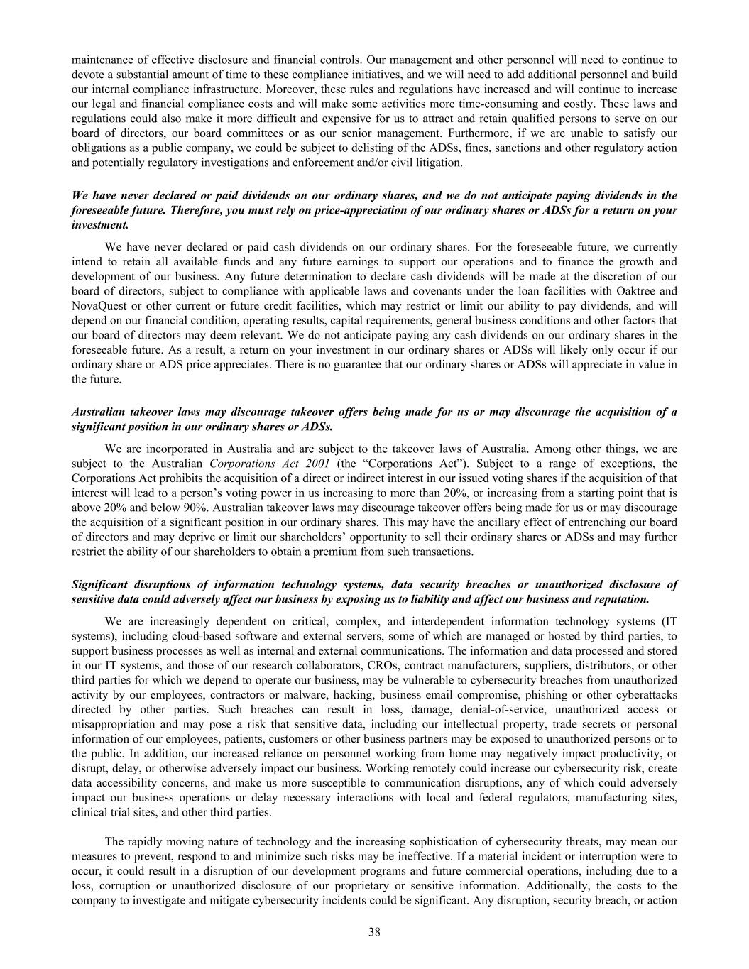 maintenance of effective disclosure and financial controls. Our management and other personnel will need to continue to devote a substantial amount of time to these compliance initiatives, and we will need to add additional personnel and build our internal compliance infrastructure. Moreover, these rules and regulations have increased and will continue to increase our legal and financial compliance costs and will make some activities more time-consuming and costly. These laws and regulations could also make it more difficult and expensive for us to attract and retain qualified persons to serve on our board of directors, our board committees or as our senior management. Furthermore, if we are unable to satisfy our obligations as a public company, we could be subject to delisting of the ADSs, fines, sanctions and other regulatory action and potentially regulatory investigations and enforcement and/or civil litigation. We have never declared or paid dividends on our ordinary shares, and we do not anticipate paying dividends in the foreseeable future. Therefore, you must rely on price-appreciation of our ordinary shares or ADSs for a return on your investment. We have never declared or paid cash dividends on our ordinary shares. For the foreseeable future, we currently intend to retain all available funds and any future earnings to support our operations and to finance the growth and development of our business. Any future determination to declare cash dividends will be made at the discretion of our board of directors, subject to compliance with applicable laws and covenants under the loan facilities with Oaktree and NovaQuest or other current or future credit facilities, which may restrict or limit our ability to pay dividends, and will depend on our financial condition, operating results, capital requirements, general business conditions and other factors that our board of directors may deem relevant. We do not anticipate paying any cash dividends on our ordinary shares in the foreseeable future. As a result, a return on your investment in our ordinary shares or ADSs will likely only occur if our ordinary share or ADS price appreciates. There is no guarantee that our ordinary shares or ADSs will appreciate in value in the future. Australian takeover laws may discourage takeover offers being made for us or may discourage the acquisition of a significant position in our ordinary shares or ADSs. We are incorporated in Australia and are subject to the takeover laws of Australia. Among other things, we are subject to the Australian Corporations Act 2001 (the “Corporations Act”). Subject to a range of exceptions, the Corporations Act prohibits the acquisition of a direct or indirect interest in our issued voting shares if the acquisition of that interest will lead to a person’s voting power in us increasing to more than 20%, or increasing from a starting point that is above 20% and below 90%. Australian takeover laws may discourage takeover offers being made for us or may discourage the acquisition of a significant position in our ordinary shares. This may have the ancillary effect of entrenching our board of directors and may deprive or limit our shareholders’ opportunity to sell their ordinary shares or ADSs and may further restrict the ability of our shareholders to obtain a premium from such transactions. Significant disruptions of information technology systems, data security breaches or unauthorized disclosure of sensitive data could adversely affect our business by exposing us to liability and affect our business and reputation. We are increasingly dependent on critical, complex, and interdependent information technology systems (IT systems), including cloud-based software and external servers, some of which are managed or hosted by third parties, to support business processes as well as internal and external communications. The information and data processed and stored in our IT systems, and those of our research collaborators, CROs, contract manufacturers, suppliers, distributors, or other third parties for which we depend to operate our business, may be vulnerable to cybersecurity breaches from unauthorized activity by our employees, contractors or malware, hacking, business email compromise, phishing or other cyberattacks directed by other parties. Such breaches can result in loss, damage, denial-of-service, unauthorized access or misappropriation and may pose a risk that sensitive data, including our intellectual property, trade secrets or personal information of our employees, patients, customers or other business partners may be exposed to unauthorized persons or to the public. In addition, our increased reliance on personnel working from home may negatively impact productivity, or disrupt, delay, or otherwise adversely impact our business. Working remotely could increase our cybersecurity risk, create data accessibility concerns, and make us more susceptible to communication disruptions, any of which could adversely impact our business operations or delay necessary interactions with local and federal regulators, manufacturing sites, clinical trial sites, and other third parties. The rapidly moving nature of technology and the increasing sophistication of cybersecurity threats, may mean our measures to prevent, respond to and minimize such risks may be ineffective. If a material incident or interruption were to occur, it could result in a disruption of our development programs and future commercial operations, including due to a loss, corruption or unauthorized disclosure of our proprietary or sensitive information. Additionally, the costs to the company to investigate and mitigate cybersecurity incidents could be significant. Any disruption, security breach, or action 38