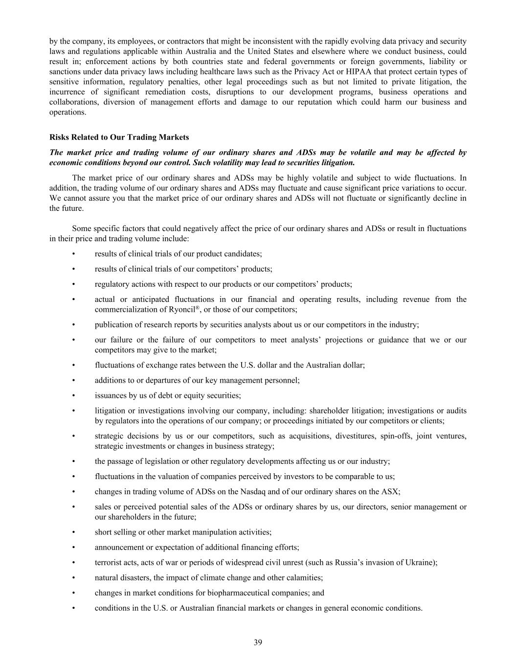 by the company, its employees, or contractors that might be inconsistent with the rapidly evolving data privacy and security laws and regulations applicable within Australia and the United States and elsewhere where we conduct business, could result in; enforcement actions by both countries state and federal governments or foreign governments, liability or sanctions under data privacy laws including healthcare laws such as the Privacy Act or HIPAA that protect certain types of sensitive information, regulatory penalties, other legal proceedings such as but not limited to private litigation, the incurrence of significant remediation costs, disruptions to our development programs, business operations and collaborations, diversion of management efforts and damage to our reputation which could harm our business and operations. Risks Related to Our Trading Markets The market price and trading volume of our ordinary shares and ADSs may be volatile and may be affected by economic conditions beyond our control. Such volatility may lead to securities litigation. The market price of our ordinary shares and ADSs may be highly volatile and subject to wide fluctuations. In addition, the trading volume of our ordinary shares and ADSs may fluctuate and cause significant price variations to occur. We cannot assure you that the market price of our ordinary shares and ADSs will not fluctuate or significantly decline in the future. Some specific factors that could negatively affect the price of our ordinary shares and ADSs or result in fluctuations in their price and trading volume include: • results of clinical trials of our product candidates; • results of clinical trials of our competitors’ products; • regulatory actions with respect to our products or our competitors’ products; • actual or anticipated fluctuations in our financial and operating results, including revenue from the commercialization of Ryoncil®, or those of our competitors; • publication of research reports by securities analysts about us or our competitors in the industry; • our failure or the failure of our competitors to meet analysts’ projections or guidance that we or our competitors may give to the market; • fluctuations of exchange rates between the U.S. dollar and the Australian dollar; • additions to or departures of our key management personnel; • issuances by us of debt or equity securities; • litigation or investigations involving our company, including: shareholder litigation; investigations or audits by regulators into the operations of our company; or proceedings initiated by our competitors or clients; • strategic decisions by us or our competitors, such as acquisitions, divestitures, spin-offs, joint ventures, strategic investments or changes in business strategy; • the passage of legislation or other regulatory developments affecting us or our industry; • fluctuations in the valuation of companies perceived by investors to be comparable to us; • changes in trading volume of ADSs on the Nasdaq and of our ordinary shares on the ASX; • sales or perceived potential sales of the ADSs or ordinary shares by us, our directors, senior management or our shareholders in the future; • short selling or other market manipulation activities; • announcement or expectation of additional financing efforts; • terrorist acts, acts of war or periods of widespread civil unrest (such as Russia’s invasion of Ukraine); • natural disasters, the impact of climate change and other calamities; • changes in market conditions for biopharmaceutical companies; and • conditions in the U.S. or Australian financial markets or changes in general economic conditions. 39