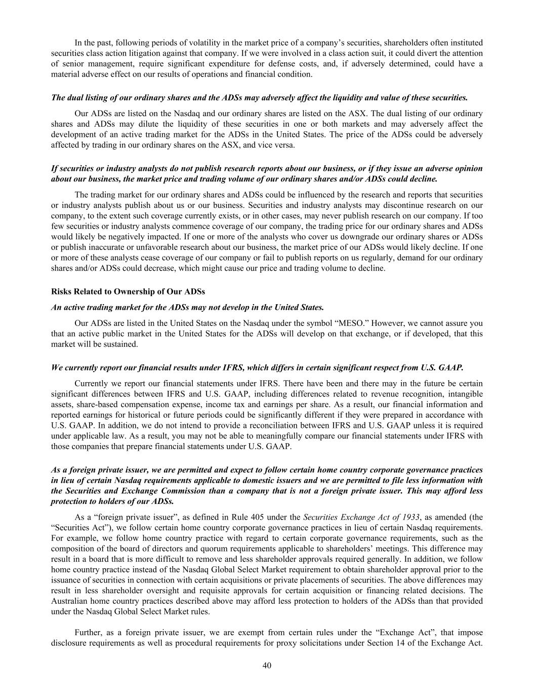 In the past, following periods of volatility in the market price of a company’s securities, shareholders often instituted securities class action litigation against that company. If we were involved in a class action suit, it could divert the attention of senior management, require significant expenditure for defense costs, and, if adversely determined, could have a material adverse effect on our results of operations and financial condition. The dual listing of our ordinary shares and the ADSs may adversely affect the liquidity and value of these securities. Our ADSs are listed on the Nasdaq and our ordinary shares are listed on the ASX. The dual listing of our ordinary shares and ADSs may dilute the liquidity of these securities in one or both markets and may adversely affect the development of an active trading market for the ADSs in the United States. The price of the ADSs could be adversely affected by trading in our ordinary shares on the ASX, and vice versa. If securities or industry analysts do not publish research reports about our business, or if they issue an adverse opinion about our business, the market price and trading volume of our ordinary shares and/or ADSs could decline. The trading market for our ordinary shares and ADSs could be influenced by the research and reports that securities or industry analysts publish about us or our business. Securities and industry analysts may discontinue research on our company, to the extent such coverage currently exists, or in other cases, may never publish research on our company. If too few securities or industry analysts commence coverage of our company, the trading price for our ordinary shares and ADSs would likely be negatively impacted. If one or more of the analysts who cover us downgrade our ordinary shares or ADSs or publish inaccurate or unfavorable research about our business, the market price of our ADSs would likely decline. If one or more of these analysts cease coverage of our company or fail to publish reports on us regularly, demand for our ordinary shares and/or ADSs could decrease, which might cause our price and trading volume to decline. Risks Related to Ownership of Our ADSs An active trading market for the ADSs may not develop in the United States. Our ADSs are listed in the United States on the Nasdaq under the symbol “MESO.” However, we cannot assure you that an active public market in the United States for the ADSs will develop on that exchange, or if developed, that this market will be sustained. We currently report our financial results under IFRS, which differs in certain significant respect from U.S. GAAP. Currently we report our financial statements under IFRS. There have been and there may in the future be certain significant differences between IFRS and U.S. GAAP, including differences related to revenue recognition, intangible assets, share-based compensation expense, income tax and earnings per share. As a result, our financial information and reported earnings for historical or future periods could be significantly different if they were prepared in accordance with U.S. GAAP. In addition, we do not intend to provide a reconciliation between IFRS and U.S. GAAP unless it is required under applicable law. As a result, you may not be able to meaningfully compare our financial statements under IFRS with those companies that prepare financial statements under U.S. GAAP. As a foreign private issuer, we are permitted and expect to follow certain home country corporate governance practices in lieu of certain Nasdaq requirements applicable to domestic issuers and we are permitted to file less information with the Securities and Exchange Commission than a company that is not a foreign private issuer. This may afford less protection to holders of our ADSs. As a “foreign private issuer”, as defined in Rule 405 under the Securities Exchange Act of 1933, as amended (the “Securities Act”), we follow certain home country corporate governance practices in lieu of certain Nasdaq requirements. For example, we follow home country practice with regard to certain corporate governance requirements, such as the composition of the board of directors and quorum requirements applicable to shareholders’ meetings. This difference may result in a board that is more difficult to remove and less shareholder approvals required generally. In addition, we follow home country practice instead of the Nasdaq Global Select Market requirement to obtain shareholder approval prior to the issuance of securities in connection with certain acquisitions or private placements of securities. The above differences may result in less shareholder oversight and requisite approvals for certain acquisition or financing related decisions. The Australian home country practices described above may afford less protection to holders of the ADSs than that provided under the Nasdaq Global Select Market rules. Further, as a foreign private issuer, we are exempt from certain rules under the “Exchange Act”, that impose disclosure requirements as well as procedural requirements for proxy solicitations under Section 14 of the Exchange Act. 40