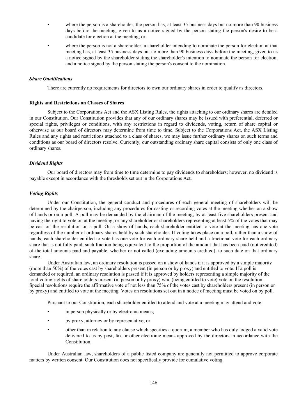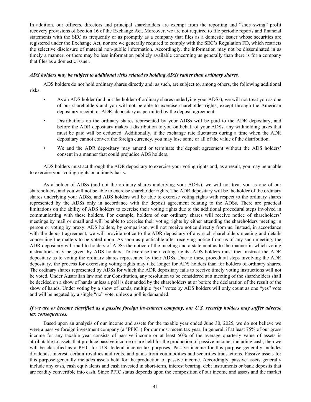 In addition, our officers, directors and principal shareholders are exempt from the reporting and “short-swing” profit recovery provisions of Section 16 of the Exchange Act. Moreover, we are not required to file periodic reports and financial statements with the SEC as frequently or as promptly as a company that files as a domestic issuer whose securities are registered under the Exchange Act, nor are we generally required to comply with the SEC’s Regulation FD, which restricts the selective disclosure of material non-public information. Accordingly, the information may not be disseminated in as timely a manner, or there may be less information publicly available concerning us generally than there is for a company that files as a domestic issuer. ADS holders may be subject to additional risks related to holding ADSs rather than ordinary shares. ADS holders do not hold ordinary shares directly and, as such, are subject to, among others, the following additional risks. • As an ADS holder (and not the holder of ordinary shares underlying your ADSs), we will not treat you as one of our shareholders and you will not be able to exercise shareholder rights, except through the American depositary receipt, or ADR, depositary as permitted by the deposit agreement. • Distributions on the ordinary shares represented by your ADSs will be paid to the ADR depositary, and before the ADR depositary makes a distribution to you on behalf of your ADSs, any withholding taxes that must be paid will be deducted. Additionally, if the exchange rate fluctuates during a time when the ADR depositary cannot convert the foreign currency, you may lose some or all of the value of the distribution. • We and the ADR depositary may amend or terminate the deposit agreement without the ADS holders’ consent in a manner that could prejudice ADS holders. ADS holders must act through the ADR depositary to exercise your voting rights and, as a result, you may be unable to exercise your voting rights on a timely basis. As a holder of ADSs (and not the ordinary shares underlying your ADSs), we will not treat you as one of our shareholders, and you will not be able to exercise shareholder rights. The ADR depositary will be the holder of the ordinary shares underlying your ADSs, and ADS holders will be able to exercise voting rights with respect to the ordinary shares represented by the ADSs only in accordance with the deposit agreement relating to the ADSs. There are practical limitations on the ability of ADS holders to exercise their voting rights due to the additional procedural steps involved in communicating with these holders. For example, holders of our ordinary shares will receive notice of shareholders’ meetings by mail or email and will be able to exercise their voting rights by either attending the shareholders meeting in person or voting by proxy. ADS holders, by comparison, will not receive notice directly from us. Instead, in accordance with the deposit agreement, we will provide notice to the ADR depositary of any such shareholders meeting and details concerning the matters to be voted upon. As soon as practicable after receiving notice from us of any such meeting, the ADR depositary will mail to holders of ADSs the notice of the meeting and a statement as to the manner in which voting instructions may be given by ADS holders. To exercise their voting rights, ADS holders must then instruct the ADR depositary as to voting the ordinary shares represented by their ADSs. Due to these procedural steps involving the ADR depositary, the process for exercising voting rights may take longer for ADS holders than for holders of ordinary shares. The ordinary shares represented by ADSs for which the ADR depositary fails to receive timely voting instructions will not be voted. Under Australian law and our Constitution, any resolution to be considered at a meeting of the shareholders shall be decided on a show of hands unless a poll is demanded by the shareholders at or before the declaration of the result of the show of hands. Under voting by a show of hands, multiple “yes” votes by ADS holders will only count as one “yes” vote and will be negated by a single “no” vote, unless a poll is demanded. If we are or become classified as a passive foreign investment company, our U.S. security holders may suffer adverse tax consequences. Based upon an analysis of our income and assets for the taxable year ended June 30, 2025, we do not believe we were a passive foreign investment company (a "PFIC") for our most recent tax year. In general, if at least 75% of our gross income for any taxable year consists of passive income or at least 50% of the average quarterly value of assets is attributable to assets that produce passive income or are held for the production of passive income, including cash, then we will be classified as a PFIC for U.S. federal income tax purposes. Passive income for this purpose generally includes dividends, interest, certain royalties and rents, and gains from commodities and securities transactions. Passive assets for this purpose generally includes assets held for the production of passive income. Accordingly, passive assets generally include any cash, cash equivalents and cash invested in short-term, interest bearing, debt instruments or bank deposits that are readily convertible into cash. Since PFIC status depends upon the composition of our income and assets and the market 41