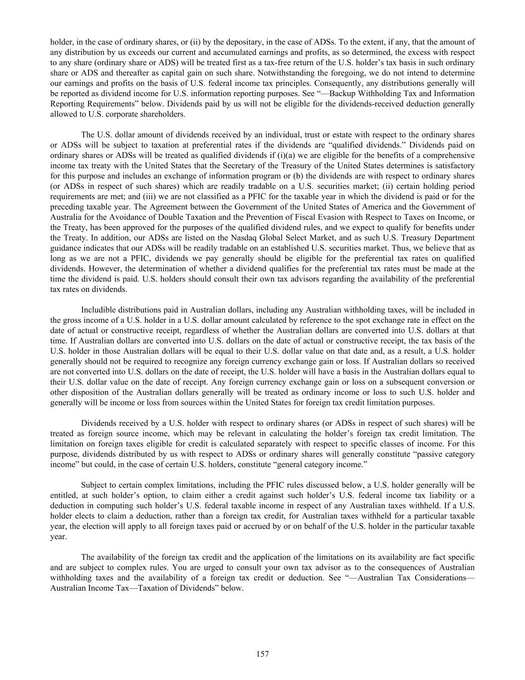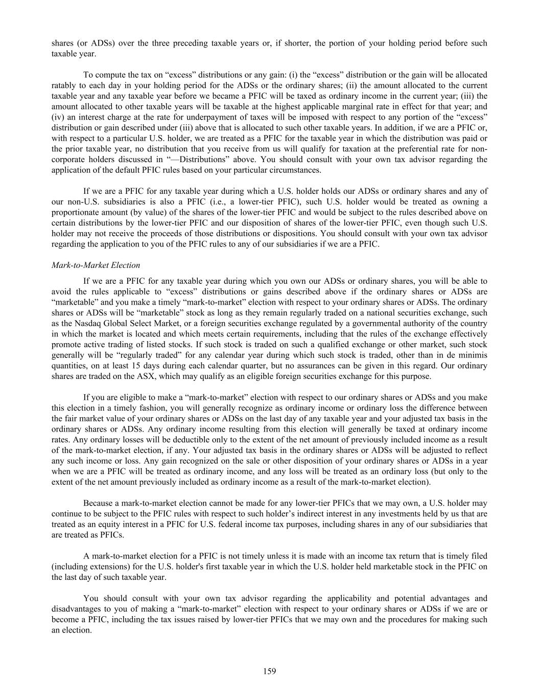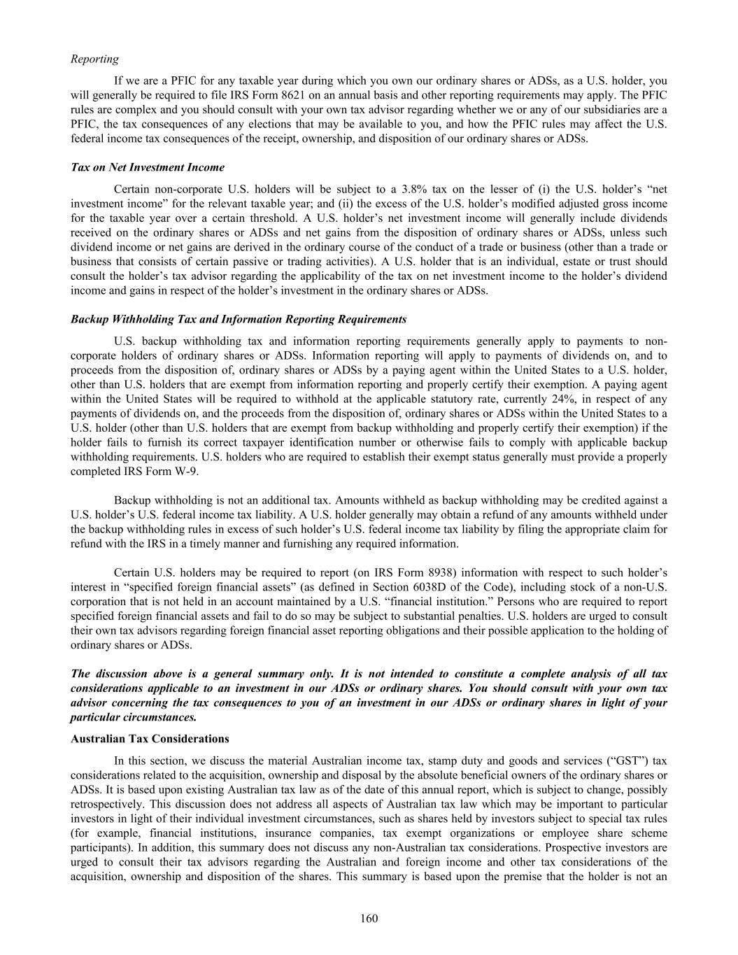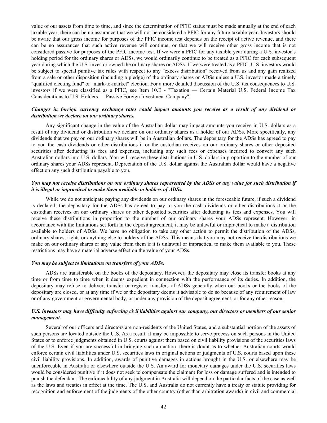 value of our assets from time to time, and since the determination of PFIC status must be made annually at the end of each taxable year, there can be no assurance that we will not be considered a PFIC for any future taxable year. Investors should be aware that our gross income for purposes of the PFIC income test depends on the receipt of active revenue, and there can be no assurances that such active revenue will continue, or that we will receive other gross income that is not considered passive for purposes of the PFIC income test. If we were a PFIC for any taxable year during a U.S. investor’s holding period for the ordinary shares or ADSs, we would ordinarily continue to be treated as a PFIC for each subsequent year during which the U.S. investor owned the ordinary shares or ADSs. If we were treated as a PFIC, U.S. investors would be subject to special punitive tax rules with respect to any "excess distribution" received from us and any gain realized from a sale or other disposition (including a pledge) of the ordinary shares or ADSs unless a U.S. investor made a timely "qualified electing fund" or "mark-to-market" election. For a more detailed discussion of the U.S. tax consequences to U.S. investors if we were classified as a PFIC, see Item 10.E - "Taxation — Certain Material U.S. Federal Income Tax Considerations to U.S. Holders — Passive Foreign Investment Company". Changes in foreign currency exchange rates could impact amounts you receive as a result of any dividend or distribution we declare on our ordinary shares. Any significant change in the value of the Australian dollar may impact amounts you receive in U.S. dollars as a result of any dividend or distribution we declare on our ordinary shares as a holder of our ADSs. More specifically, any dividends that we pay on our ordinary shares will be in Australian dollars. The depositary for the ADSs has agreed to pay to you the cash dividends or other distributions it or the custodian receives on our ordinary shares or other deposited securities after deducting its fees and expenses, including any such fees or expenses incurred to convert any such Australian dollars into U.S. dollars. You will receive these distributions in U.S. dollars in proportion to the number of our ordinary shares your ADSs represent. Depreciation of the U.S. dollar against the Australian dollar would have a negative effect on any such distribution payable to you. You may not receive distributions on our ordinary shares represented by the ADSs or any value for such distribution if it is illegal or impractical to make them available to holders of ADSs. While we do not anticipate paying any dividends on our ordinary shares in the foreseeable future, if such a dividend is declared, the depositary for the ADSs has agreed to pay to you the cash dividends or other distributions it or the custodian receives on our ordinary shares or other deposited securities after deducting its fees and expenses. You will receive these distributions in proportion to the number of our ordinary shares your ADSs represent. However, in accordance with the limitations set forth in the deposit agreement, it may be unlawful or impractical to make a distribution available to holders of ADSs. We have no obligation to take any other action to permit the distribution of the ADSs, ordinary shares, rights or anything else to holders of the ADSs. This means that you may not receive the distributions we make on our ordinary shares or any value from them if it is unlawful or impractical to make them available to you. These restrictions may have a material adverse effect on the value of your ADSs. You may be subject to limitations on transfers of your ADSs. ADSs are transferable on the books of the depositary. However, the depositary may close its transfer books at any time or from time to time when it deems expedient in connection with the performance of its duties. In addition, the depositary may refuse to deliver, transfer or register transfers of ADSs generally when our books or the books of the depositary are closed, or at any time if we or the depositary deems it advisable to do so because of any requirement of law or of any government or governmental body, or under any provision of the deposit agreement, or for any other reason. U.S. investors may have difficulty enforcing civil liabilities against our company, our directors or members of our senior management. Several of our officers and directors are non-residents of the United States, and a substantial portion of the assets of such persons are located outside the U.S. As a result, it may be impossible to serve process on such persons in the United States or to enforce judgments obtained in U.S. courts against them based on civil liability provisions of the securities laws of the U.S. Even if you are successful in bringing such an action, there is doubt as to whether Australian courts would enforce certain civil liabilities under U.S. securities laws in original actions or judgments of U.S. courts based upon these civil liability provisions. In addition, awards of punitive damages in actions brought in the U.S. or elsewhere may be unenforceable in Australia or elsewhere outside the U.S. An award for monetary damages under the U.S. securities laws would be considered punitive if it does not seek to compensate the claimant for loss or damage suffered and is intended to punish the defendant. The enforceability of any judgment in Australia will depend on the particular facts of the case as well as the laws and treaties in effect at the time. The U.S. and Australia do not currently have a treaty or statute providing for recognition and enforcement of the judgments of the other country (other than arbitration awards) in civil and commercial 42