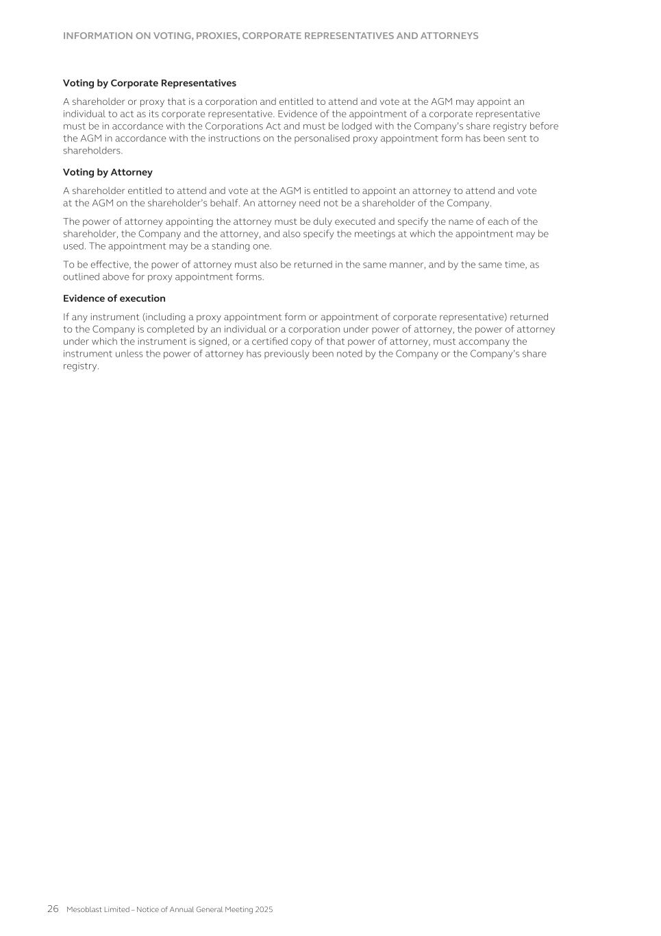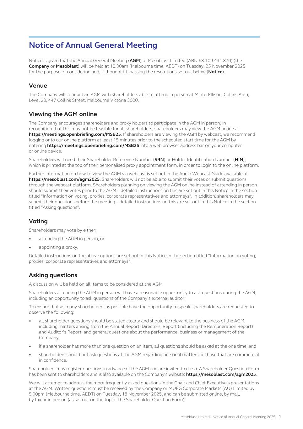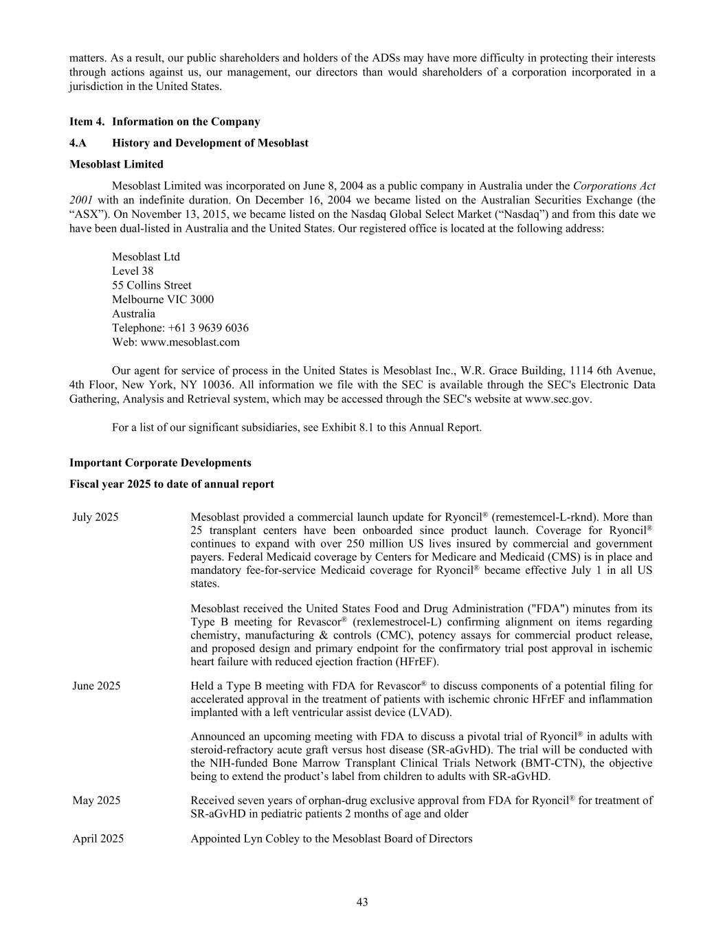 matters. As a result, our public shareholders and holders of the ADSs may have more difficulty in protecting their interests through actions against us, our management, our directors than would shareholders of a corporation incorporated in a jurisdiction in the United States. Item 4. Information on the Company 4.A History and Development of Mesoblast Mesoblast Limited Mesoblast Limited was incorporated on June 8, 2004 as a public company in Australia under the Corporations Act 2001 with an indefinite duration. On December 16, 2004 we became listed on the Australian Securities Exchange (the “ASX”). On November 13, 2015, we became listed on the Nasdaq Global Select Market (“Nasdaq”) and from this date we have been dual-listed in Australia and the United States. Our registered office is located at the following address: Mesoblast Ltd Level 38 55 Collins Street Melbourne VIC 3000 Australia Telephone: +61 3 9639 6036 Web: www.mesoblast.com Our agent for service of process in the United States is Mesoblast Inc., W.R. Grace Building, 1114 6th Avenue, 4th Floor, New York, NY 10036. All information we file with the SEC is available through the SEC's Electronic Data Gathering, Analysis and Retrieval system, which may be accessed through the SEC's website at www.sec.gov. For a list of our significant subsidiaries, see Exhibit 8.1 to this Annual Report. Important Corporate Developments Fiscal year 2025 to date of annual report July 2025 Mesoblast provided a commercial launch update for Ryoncil® (remestemcel-L-rknd). More than 25 transplant centers have been onboarded since product launch. Coverage for Ryoncil® continues to expand with over 250 million US lives insured by commercial and government payers. Federal Medicaid coverage by Centers for Medicare and Medicaid (CMS) is in place and mandatory fee-for-service Medicaid coverage for Ryoncil® became effective July 1 in all US states. Mesoblast received the United States Food and Drug Administration ("FDA") minutes from its Type B meeting for Revascor® (rexlemestrocel-L) confirming alignment on items regarding chemistry, manufacturing & controls (CMC), potency assays for commercial product release, and proposed design and primary endpoint for the confirmatory trial post approval in ischemic heart failure with reduced ejection fraction (HFrEF). June 2025 Held a Type B meeting with FDA for Revascor® to discuss components of a potential filing for accelerated approval in the treatment of patients with ischemic chronic HFrEF and inflammation implanted with a left ventricular assist device (LVAD). Announced an upcoming meeting with FDA to discuss a pivotal trial of Ryoncil® in adults with steroid-refractory acute graft versus host disease (SR-aGvHD). The trial will be conducted with the NIH-funded Bone Marrow Transplant Clinical Trials Network (BMT-CTN), the objective being to extend the product’s label from children to adults with SR-aGvHD. May 2025 Received seven years of orphan-drug exclusive approval from FDA for Ryoncil® for treatment of SR-aGvHD in pediatric patients 2 months of age and older April 2025 Appointed Lyn Cobley to the Mesoblast Board of Directors 43