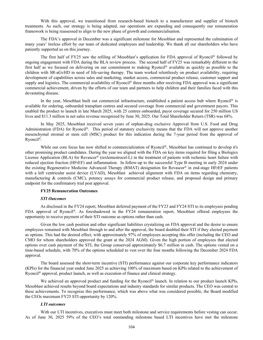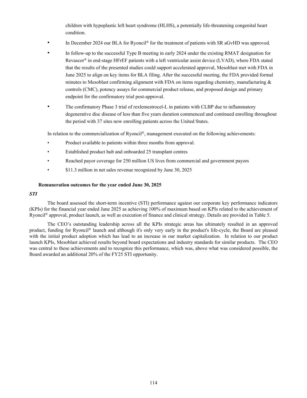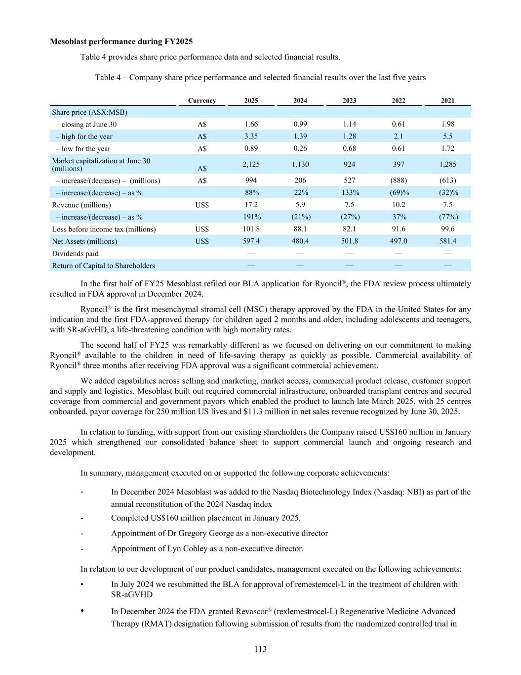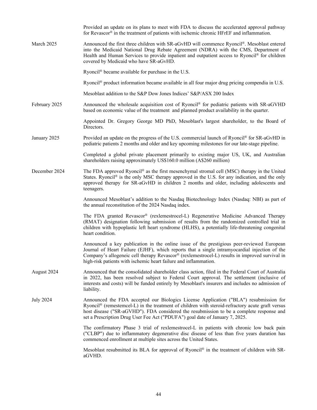 Provided an update on its plans to meet with FDA to discuss the accelerated approval pathway for Revascor® in the treatment of patients with ischemic chronic HFrEF and inflammation. March 2025 Announced the first three children with SR-aGvHD will commence Ryoncil®. Mesoblast entered into the Medicaid National Drug Rebate Agreement (NDRA) with the CMS, Department of Health and Human Services to provide inpatient and outpatient access to Ryoncil® for children covered by Medicaid who have SR-aGvHD. Ryoncil® became available for purchase in the U.S. Ryoncil® product information became available in all four major drug pricing compendia in U.S. Mesoblast addition to the S&P Dow Jones Indices’ S&P/ASX 200 Index February 2025 Announced the wholesale acquisition cost of Ryoncil® for pediatric patients with SR-aGVHD based on economic value of the treatment and planned product availability in the quarter. Appointed Dr. Gregory George MD PhD, Mesoblast's largest shareholder, to the Board of Directors. January 2025 Provided an update on the progress of the U.S. commercial launch of Ryoncil® for SR-aGvHD in pediatric patients 2 months and older and key upcoming milestones for our late-stage pipeline. Completed a global private placement primarily to existing major US, UK, and Australian shareholders raising approximately US$160.0 million (A$260 million) December 2024 The FDA approved Ryoncil® as the first mesenchymal stromal cell (MSC) therapy in the United States. Ryoncil® is the only MSC therapy approved in the U.S. for any indication, and the only approved therapy for SR-aGvHD in children 2 months and older, including adolescents and teenagers. Announced Mesoblast’s addition to the Nasdaq Biotechnology Index (Nasdaq: NBI) as part of the annual reconstitution of the 2024 Nasdaq index. The FDA granted Revascor® (rexlemestrocel-L) Regenerative Medicine Advanced Therapy (RMAT) designation following submission of results from the randomized controlled trial in children with hypoplastic left heart syndrome (HLHS), a potentially life-threatening congenital heart condition. Announced a key publication in the online issue of the prestigious peer-reviewed European Journal of Heart Failure (EJHF), which reports that a single intramyocardial injection of the Company’s allogeneic cell therapy Revascor® (rexlemestrocel-L) results in improved survival in high-risk patients with ischemic heart failure and inflammation. August 2024 Announced that the consolidated shareholder class action, filed in the Federal Court of Australia in 2022, has been resolved subject to Federal Court approval. The settlement (inclusive of interests and costs) will be funded entirely by Mesoblast's insurers and includes no admission of liability. July 2024 Announced the FDA accepted our Biologics License Application ("BLA") resubmission for Ryoncil® (remestemcel-L) in the treatment of children with steroid-refractory acute graft versus host disease ("SR-aGVHD"). FDA considered the resubmission to be a complete response and set a Prescription Drug User Fee Act ("PDUFA") goal date of January 7, 2025. The confirmatory Phase 3 trial of rexlemestrocel-L in patients with chronic low back pain ("CLBP") due to inflammatory degenerative disc disease of less than five years duration has commenced enrollment at multiple sites across the United States. Mesoblast resubmitted its BLA for approval of Ryoncil® in the treatment of children with SR- aGVHD. 44