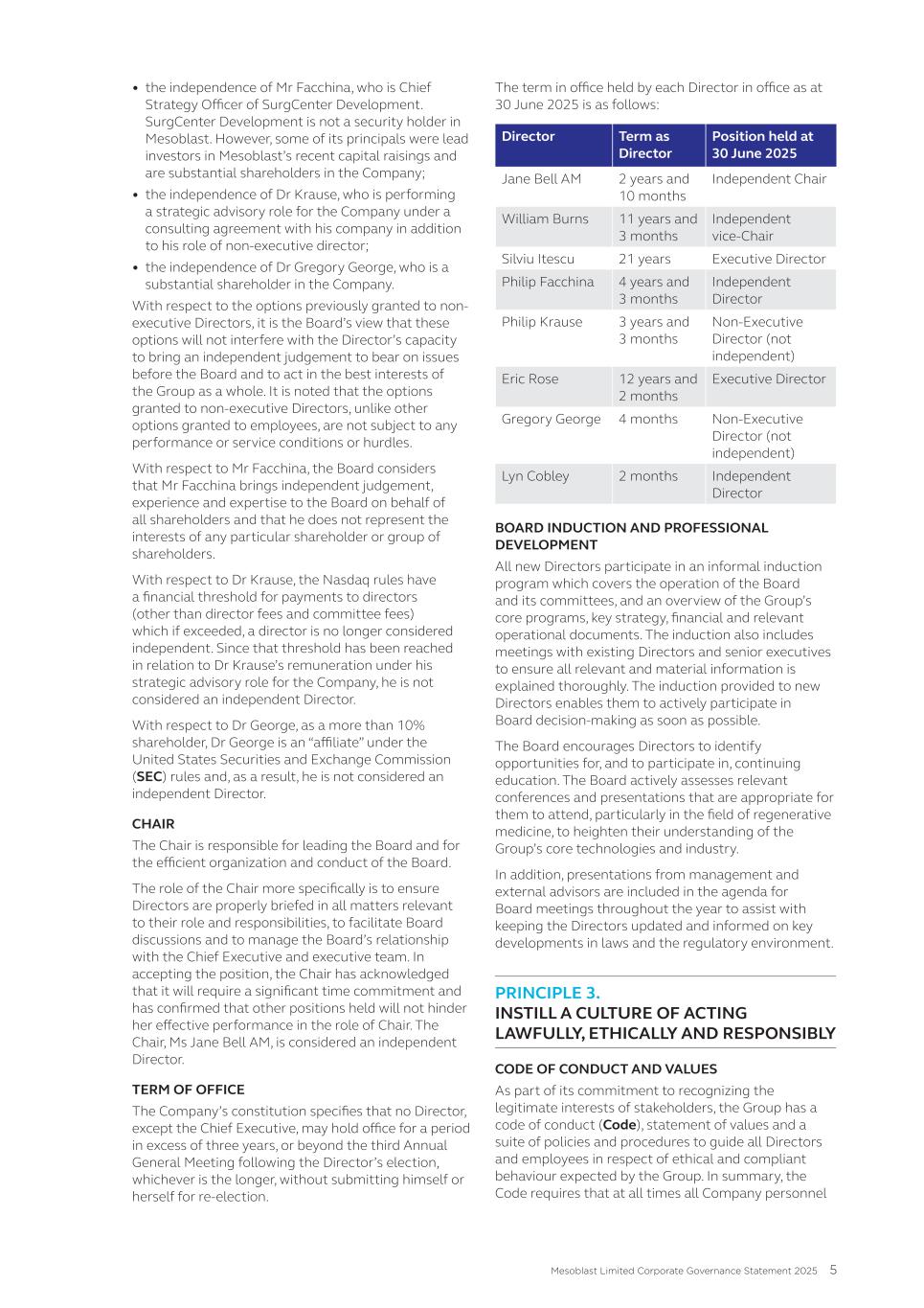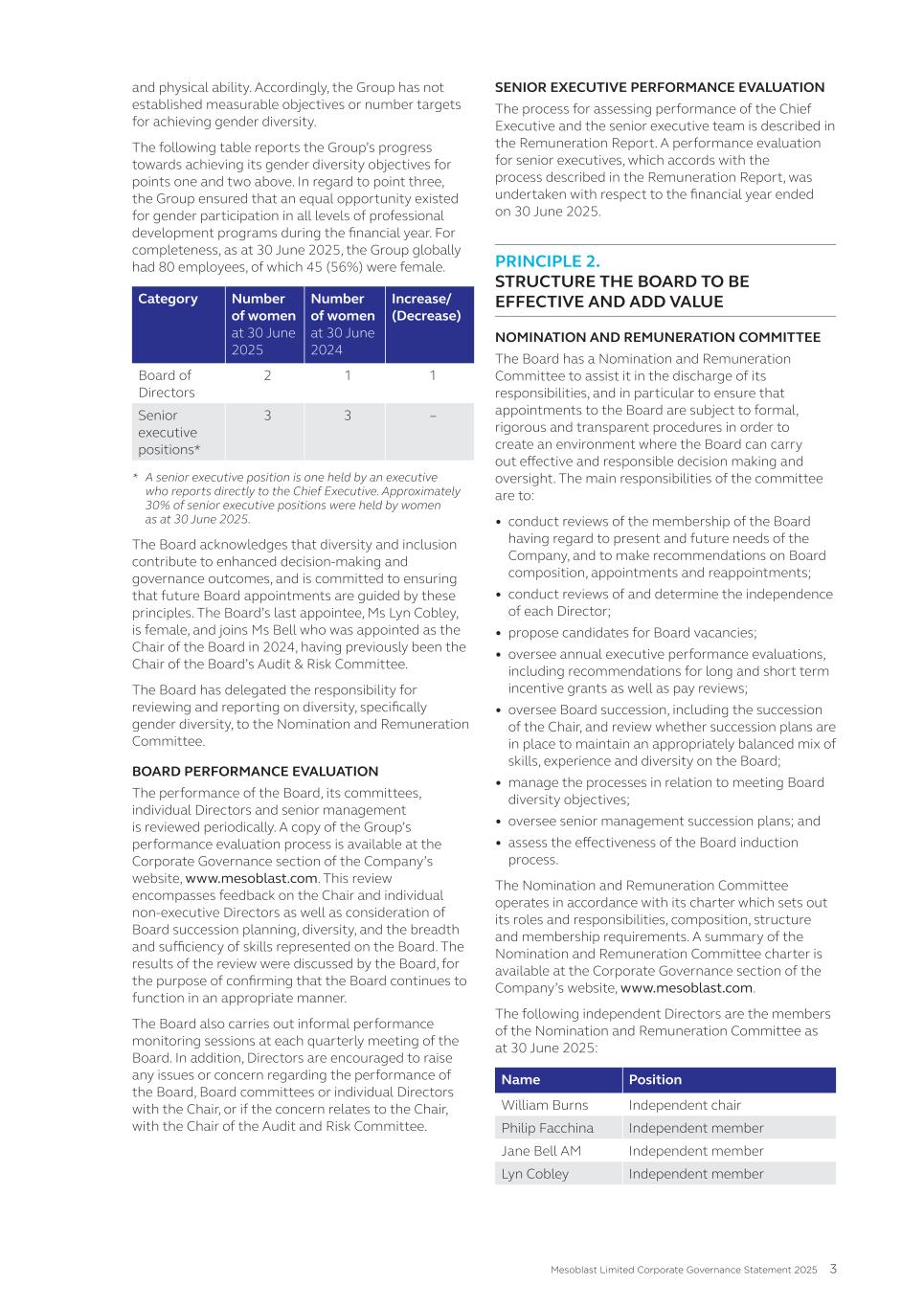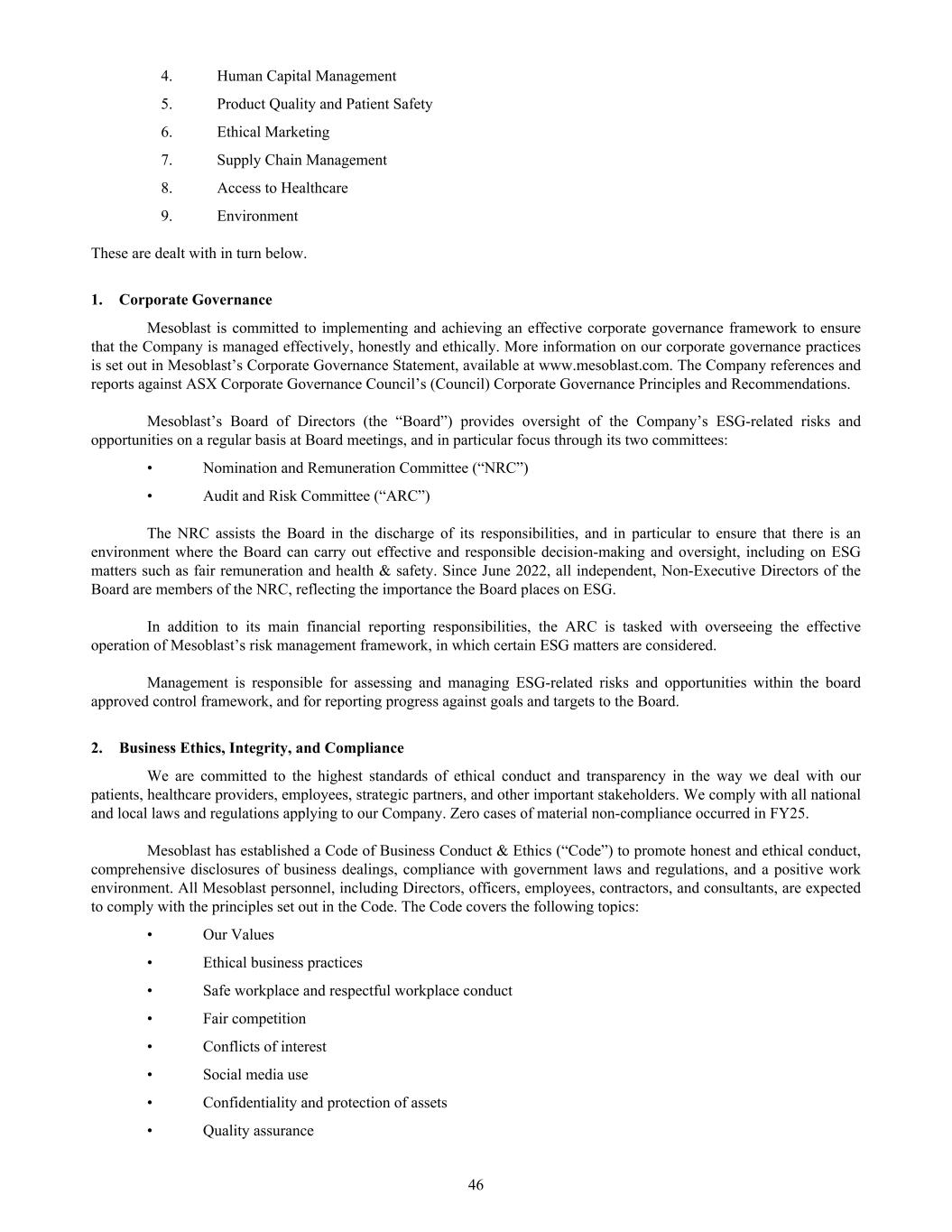 4. Human Capital Management 5. Product Quality and Patient Safety 6. Ethical Marketing 7. Supply Chain Management 8. Access to Healthcare 9. Environment These are dealt with in turn below. 1. Corporate Governance Mesoblast is committed to implementing and achieving an effective corporate governance framework to ensure that the Company is managed effectively, honestly and ethically. More information on our corporate governance practices is set out in Mesoblast’s Corporate Governance Statement, available at www.mesoblast.com. The Company references and reports against ASX Corporate Governance Council’s (Council) Corporate Governance Principles and Recommendations. Mesoblast’s Board of Directors (the “Board”) provides oversight of the Company’s ESG-related risks and opportunities on a regular basis at Board meetings, and in particular focus through its two committees: • Nomination and Remuneration Committee (“NRC”) • Audit and Risk Committee (“ARC”) The NRC assists the Board in the discharge of its responsibilities, and in particular to ensure that there is an environment where the Board can carry out effective and responsible decision-making and oversight, including on ESG matters such as fair remuneration and health & safety. Since June 2022, all independent, Non-Executive Directors of the Board are members of the NRC, reflecting the importance the Board places on ESG. In addition to its main financial reporting responsibilities, the ARC is tasked with overseeing the effective operation of Mesoblast’s risk management framework, in which certain ESG matters are considered. Management is responsible for assessing and managing ESG-related risks and opportunities within the board approved control framework, and for reporting progress against goals and targets to the Board. 2. Business Ethics, Integrity, and Compliance We are committed to the highest standards of ethical conduct and transparency in the way we deal with our patients, healthcare providers, employees, strategic partners, and other important stakeholders. We comply with all national and local laws and regulations applying to our Company. Zero cases of material non-compliance occurred in FY25. Mesoblast has established a Code of Business Conduct & Ethics (“Code”) to promote honest and ethical conduct, comprehensive disclosures of business dealings, compliance with government laws and regulations, and a positive work environment. All Mesoblast personnel, including Directors, officers, employees, contractors, and consultants, are expected to comply with the principles set out in the Code. The Code covers the following topics: • Our Values • Ethical business practices • Safe workplace and respectful workplace conduct • Fair competition • Conflicts of interest • Social media use • Confidentiality and protection of assets • Quality assurance 46