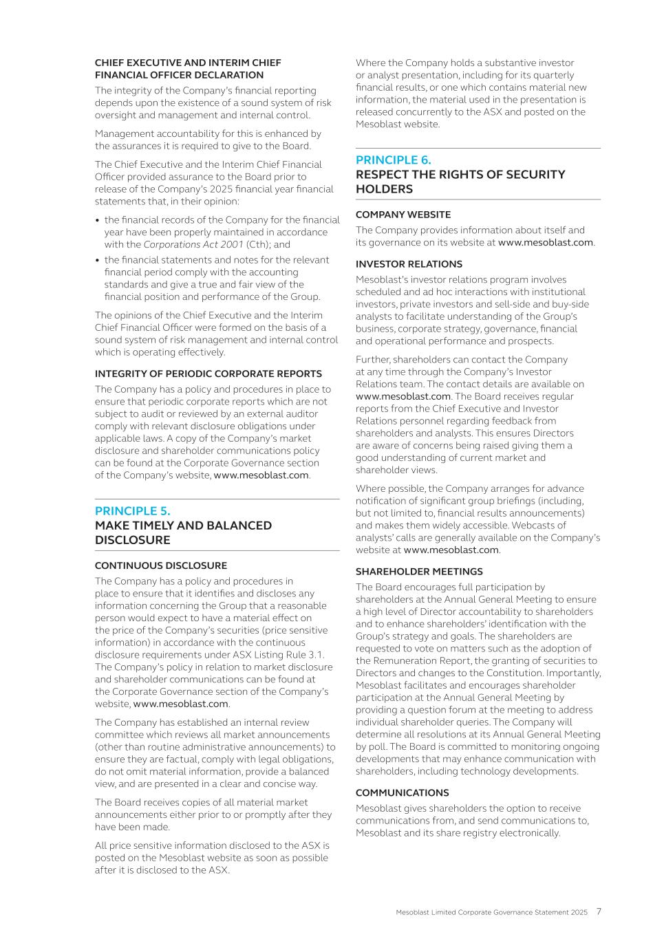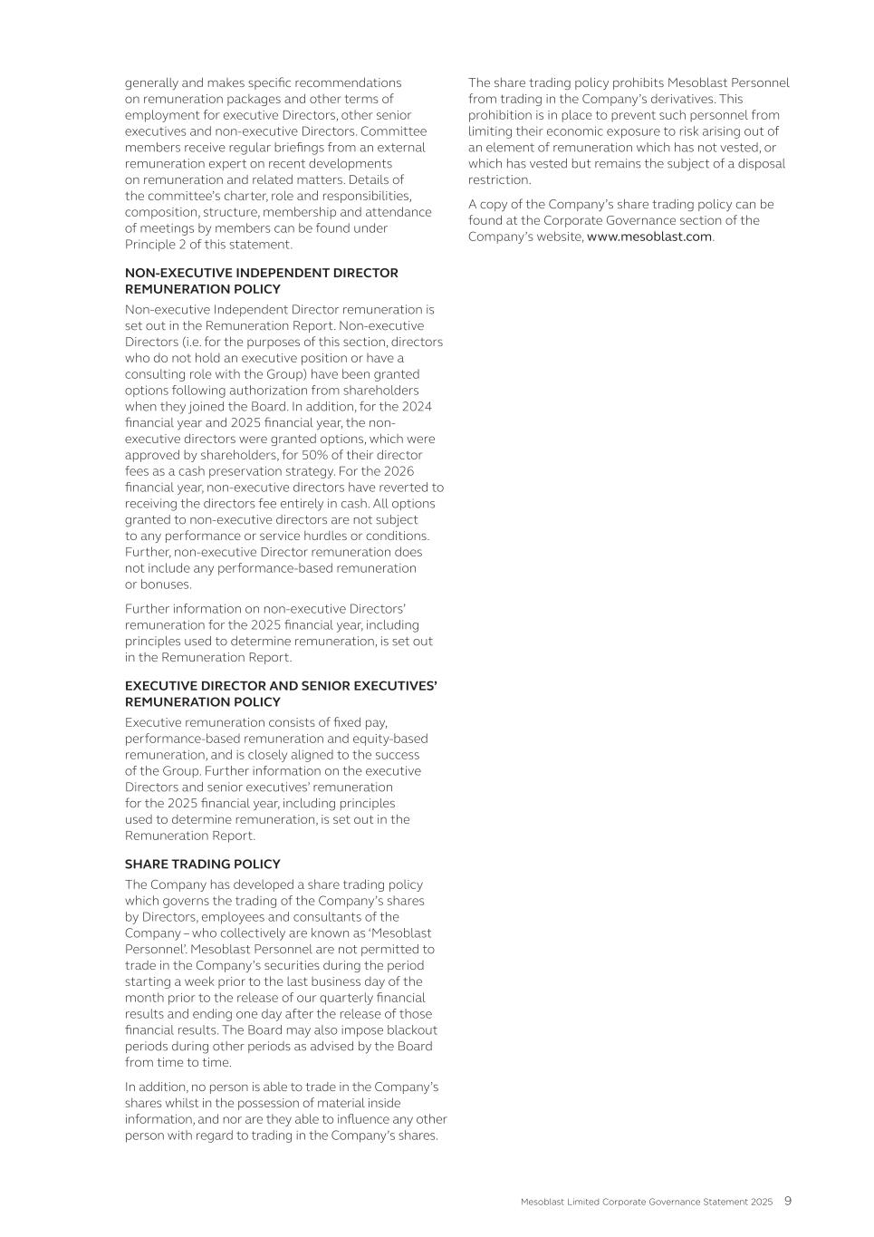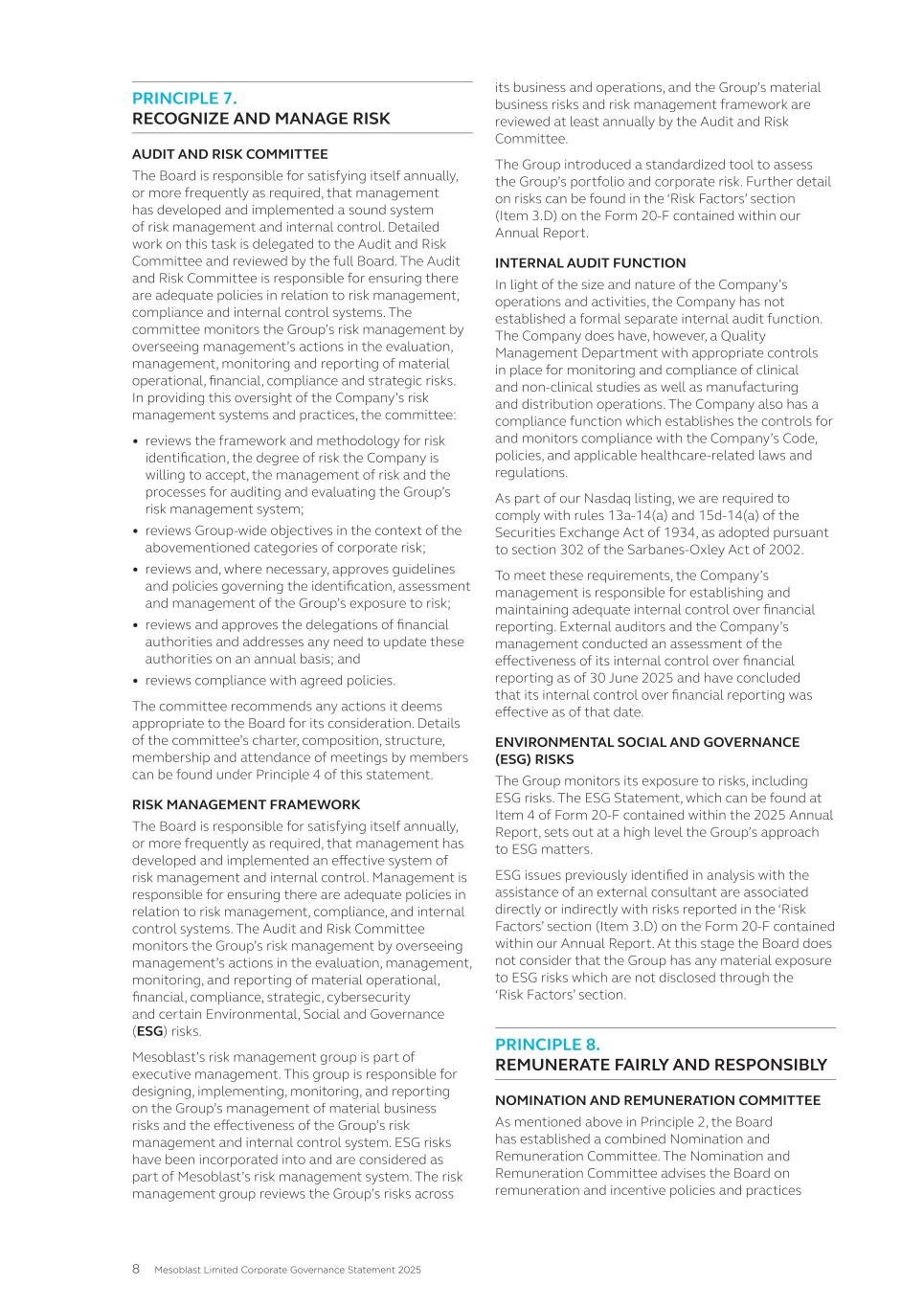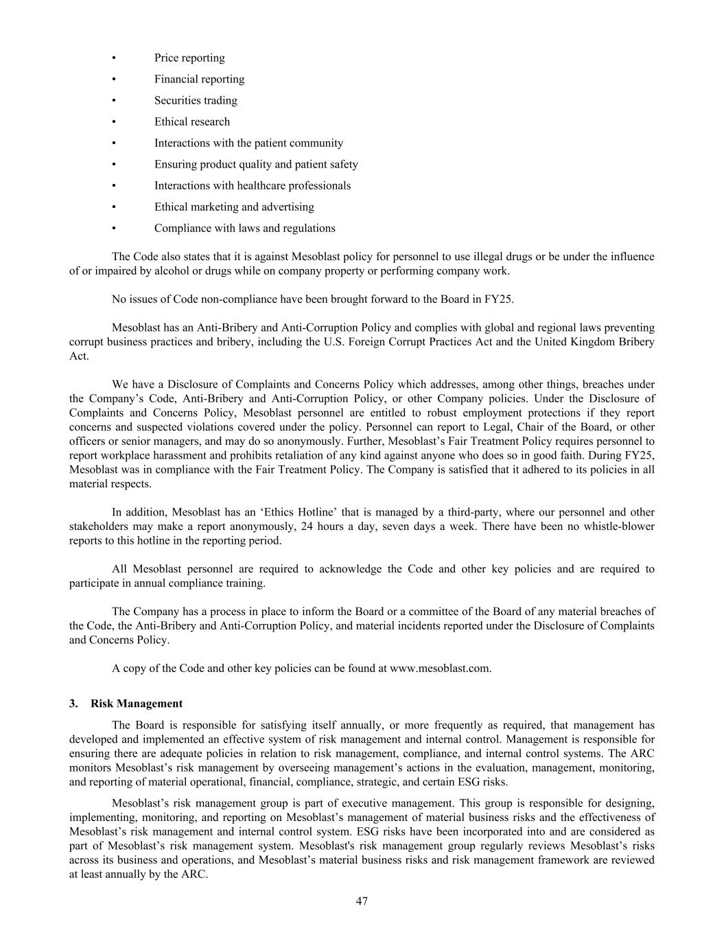 • Price reporting • Financial reporting • Securities trading • Ethical research • Interactions with the patient community • Ensuring product quality and patient safety • Interactions with healthcare professionals • Ethical marketing and advertising • Compliance with laws and regulations The Code also states that it is against Mesoblast policy for personnel to use illegal drugs or be under the influence of or impaired by alcohol or drugs while on company property or performing company work. No issues of Code non-compliance have been brought forward to the Board in FY25. Mesoblast has an Anti-Bribery and Anti-Corruption Policy and complies with global and regional laws preventing corrupt business practices and bribery, including the U.S. Foreign Corrupt Practices Act and the United Kingdom Bribery Act. We have a Disclosure of Complaints and Concerns Policy which addresses, among other things, breaches under the Company’s Code, Anti-Bribery and Anti-Corruption Policy, or other Company policies. Under the Disclosure of Complaints and Concerns Policy, Mesoblast personnel are entitled to robust employment protections if they report concerns and suspected violations covered under the policy. Personnel can report to Legal, Chair of the Board, or other officers or senior managers, and may do so anonymously. Further, Mesoblast’s Fair Treatment Policy requires personnel to report workplace harassment and prohibits retaliation of any kind against anyone who does so in good faith. During FY25, Mesoblast was in compliance with the Fair Treatment Policy. The Company is satisfied that it adhered to its policies in all material respects. In addition, Mesoblast has an ‘Ethics Hotline’ that is managed by a third-party, where our personnel and other stakeholders may make a report anonymously, 24 hours a day, seven days a week. There have been no whistle-blower reports to this hotline in the reporting period. All Mesoblast personnel are required to acknowledge the Code and other key policies and are required to participate in annual compliance training. The Company has a process in place to inform the Board or a committee of the Board of any material breaches of the Code, the Anti-Bribery and Anti-Corruption Policy, and material incidents reported under the Disclosure of Complaints and Concerns Policy. A copy of the Code and other key policies can be found at www.mesoblast.com. 3. Risk Management The Board is responsible for satisfying itself annually, or more frequently as required, that management has developed and implemented an effective system of risk management and internal control. Management is responsible for ensuring there are adequate policies in relation to risk management, compliance, and internal control systems. The ARC monitors Mesoblast’s risk management by overseeing management’s actions in the evaluation, management, monitoring, and reporting of material operational, financial, compliance, strategic, and certain ESG risks. Mesoblast’s risk management group is part of executive management. This group is responsible for designing, implementing, monitoring, and reporting on Mesoblast’s management of material business risks and the effectiveness of Mesoblast’s risk management and internal control system. ESG risks have been incorporated into and are considered as part of Mesoblast’s risk management system. Mesoblast's risk management group regularly reviews Mesoblast’s risks across its business and operations, and Mesoblast’s material business risks and risk management framework are reviewed at least annually by the ARC. 47