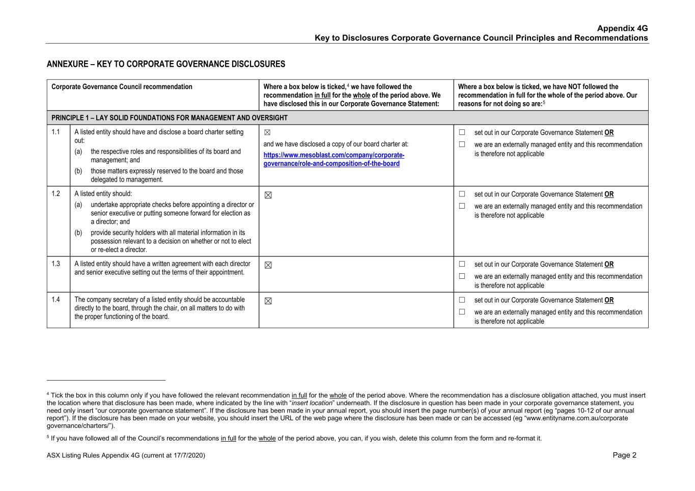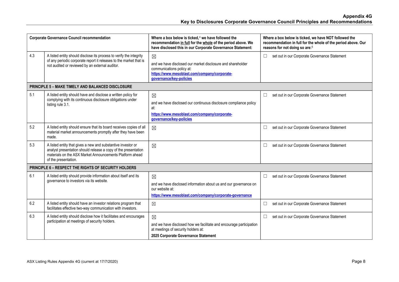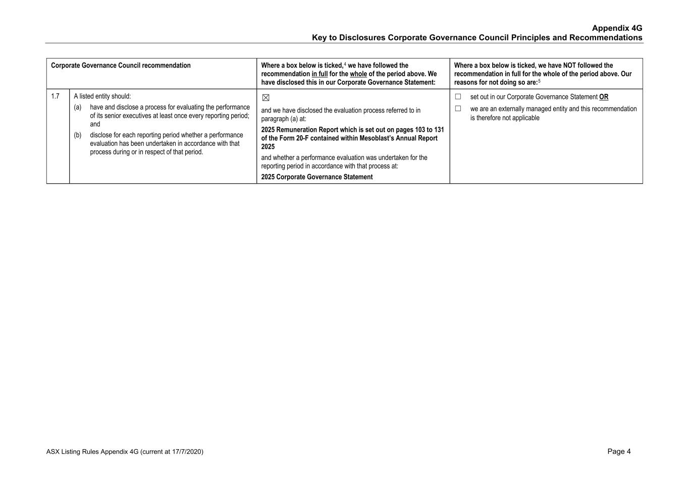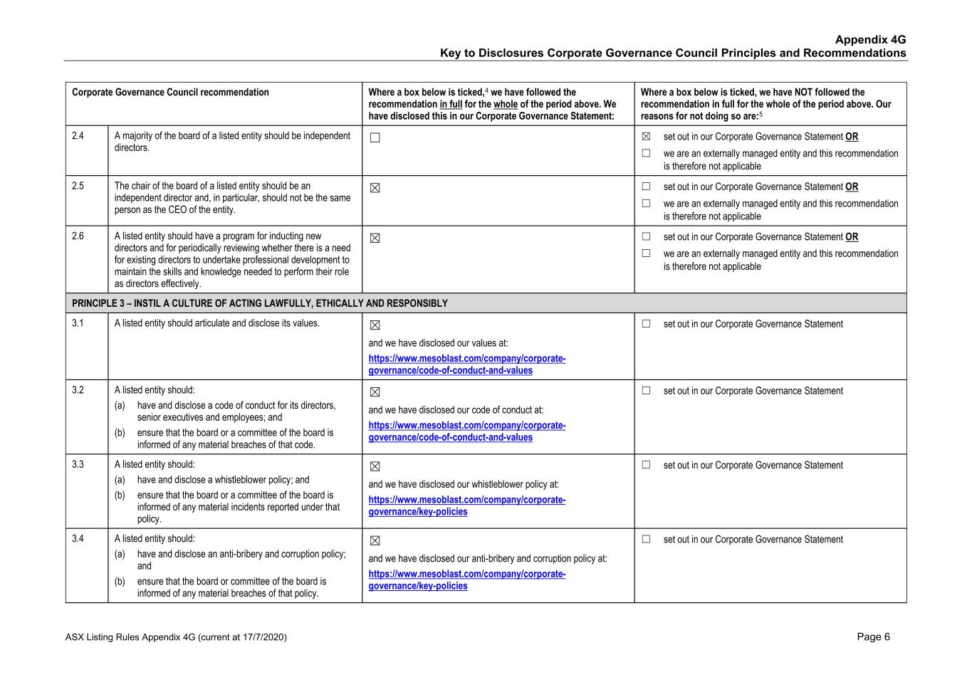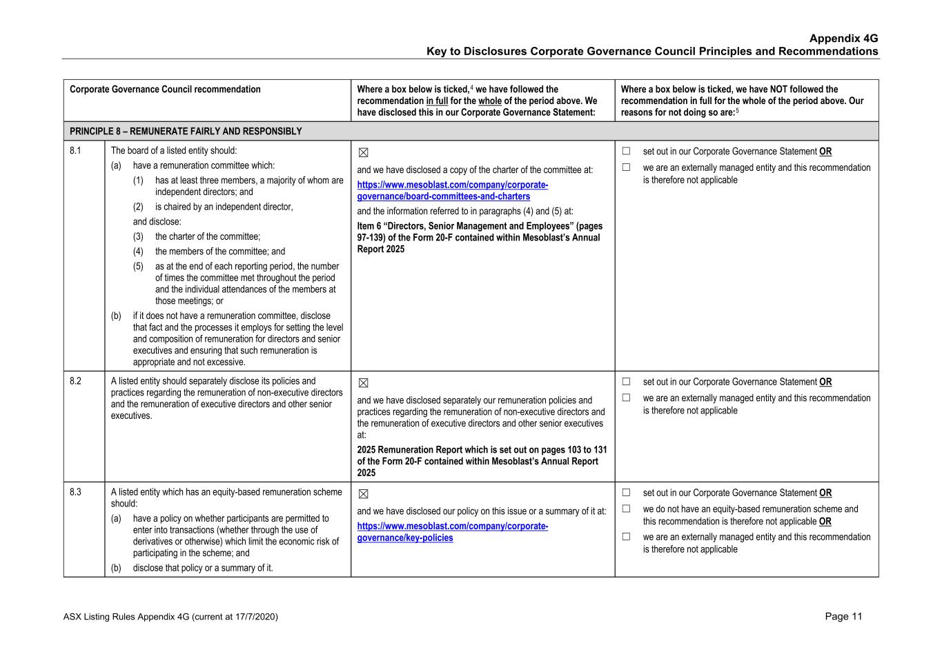• Price reporting • Financial reporting • Securities trading • Ethical research • Interactions with the patient community • Ensuring product quality and patient safety • Interactions with healthcare professionals • Ethical marketing and advertising • Compliance with laws and regulations The Code also states that it is against Mesoblast policy for personnel to use illegal drugs or be under the influence of or impaired by alcohol or drugs while on company property or performing company work. No issues of Code non-compliance have been brought forward to the Board in FY25. Mesoblast has an Anti-Bribery and Anti-Corruption Policy and complies with global and regional laws preventing corrupt business practices and bribery, including the U.S. Foreign Corrupt Practices Act and the United Kingdom Bribery Act. We have a Disclosure of Complaints and Concerns Policy which addresses, among other things, breaches under the Company’s Code, Anti-Bribery and Anti-Corruption Policy, or other Company policies. Under the Disclosure of Complaints and Concerns Policy, Mesoblast personnel are entitled to robust employment protections if they report concerns and suspected violations covered under the policy. Personnel can report to Legal, Chair of the Board, or other officers or senior managers, and may do so anonymously. Further, Mesoblast’s Fair Treatment Policy requires personnel to report workplace harassment and prohibits retaliation of any kind against anyone who does so in good faith. During FY25, Mesoblast was in compliance with the Fair Treatment Policy. The Company is satisfied that it adhered to its policies in all material respects. In addition, Mesoblast has an ‘Ethics Hotline’ that is managed by a third-party, where our personnel and other stakeholders may make a report anonymously, 24 hours a day, seven days a week. There have been no whistle-blower reports to this hotline in the reporting period. All Mesoblast personnel are required to acknowledge the Code and other key policies and are required to participate in annual compliance training. The Company has a process in place to inform the Board or a committee of the Board of any material breaches of the Code, the Anti-Bribery and Anti-Corruption Policy, and material incidents reported under the Disclosure of Complaints and Concerns Policy. A copy of the Code and other key policies can be found at www.mesoblast.com. 3. Risk Management The Board is responsible for satisfying itself annually, or more frequently as required, that management has developed and implemented an effective system of risk management and internal control. Management is responsible for ensuring there are adequate policies in relation to risk management, compliance, and internal control systems. The ARC monitors Mesoblast’s risk management by overseeing management’s actions in the evaluation, management, monitoring, and reporting of material operational, financial, compliance, strategic, and certain ESG risks. Mesoblast’s risk management group is part of executive management. This group is responsible for designing, implementing, monitoring, and reporting on Mesoblast’s management of material business risks and the effectiveness of Mesoblast’s risk management and internal control system. ESG risks have been incorporated into and are considered as part of Mesoblast’s risk management system. Mesoblast's risk management group regularly reviews Mesoblast’s risks across its business and operations, and Mesoblast’s material business risks and risk management framework are reviewed at least annually by the ARC. 47