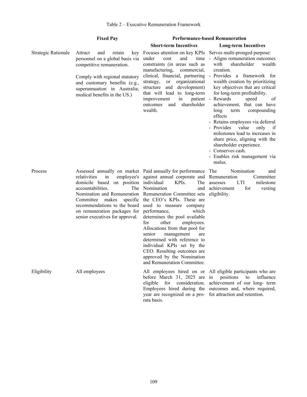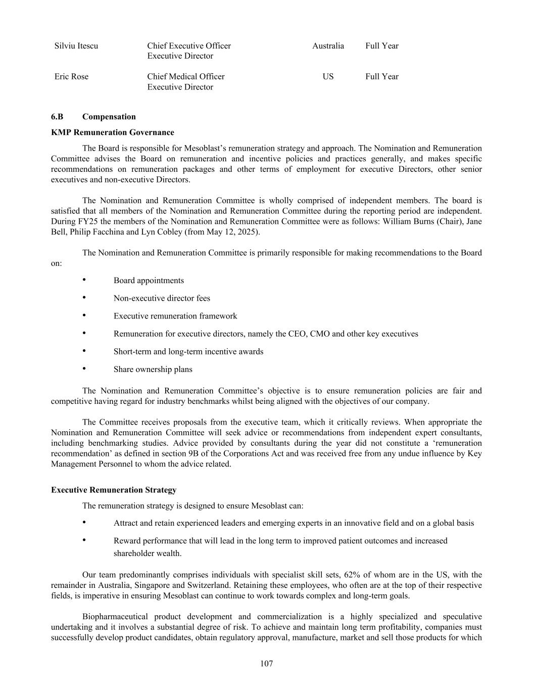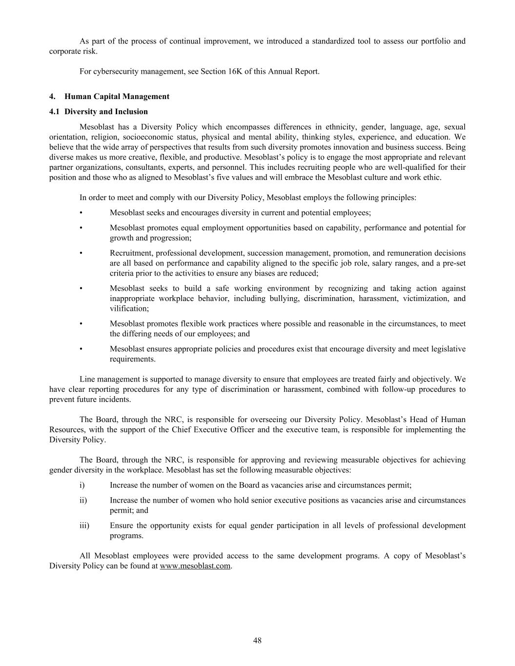 As part of the process of continual improvement, we introduced a standardized tool to assess our portfolio and corporate risk. For cybersecurity management, see Section 16K of this Annual Report. 4. Human Capital Management 4.1 Diversity and Inclusion Mesoblast has a Diversity Policy which encompasses differences in ethnicity, gender, language, age, sexual orientation, religion, socioeconomic status, physical and mental ability, thinking styles, experience, and education. We believe that the wide array of perspectives that results from such diversity promotes innovation and business success. Being diverse makes us more creative, flexible, and productive. Mesoblast’s policy is to engage the most appropriate and relevant partner organizations, consultants, experts, and personnel. This includes recruiting people who are well-qualified for their position and those who as aligned to Mesoblast’s five values and will embrace the Mesoblast culture and work ethic. In order to meet and comply with our Diversity Policy, Mesoblast employs the following principles: • Mesoblast seeks and encourages diversity in current and potential employees; • Mesoblast promotes equal employment opportunities based on capability, performance and potential for growth and progression; • Recruitment, professional development, succession management, promotion, and remuneration decisions are all based on performance and capability aligned to the specific job role, salary ranges, and a pre-set criteria prior to the activities to ensure any biases are reduced; • Mesoblast seeks to build a safe working environment by recognizing and taking action against inappropriate workplace behavior, including bullying, discrimination, harassment, victimization, and vilification; • Mesoblast promotes flexible work practices where possible and reasonable in the circumstances, to meet the differing needs of our employees; and • Mesoblast ensures appropriate policies and procedures exist that encourage diversity and meet legislative requirements. Line management is supported to manage diversity to ensure that employees are treated fairly and objectively. We have clear reporting procedures for any type of discrimination or harassment, combined with follow-up procedures to prevent future incidents. The Board, through the NRC, is responsible for overseeing our Diversity Policy. Mesoblast’s Head of Human Resources, with the support of the Chief Executive Officer and the executive team, is responsible for implementing the Diversity Policy. The Board, through the NRC, is responsible for approving and reviewing measurable objectives for achieving gender diversity in the workplace. Mesoblast has set the following measurable objectives: i) Increase the number of women on the Board as vacancies arise and circumstances permit; ii) Increase the number of women who hold senior executive positions as vacancies arise and circumstances permit; and iii) Ensure the opportunity exists for equal gender participation in all levels of professional development programs. All Mesoblast employees were provided access to the same development programs. A copy of Mesoblast’s Diversity Policy can be found at www.mesoblast.com. 48