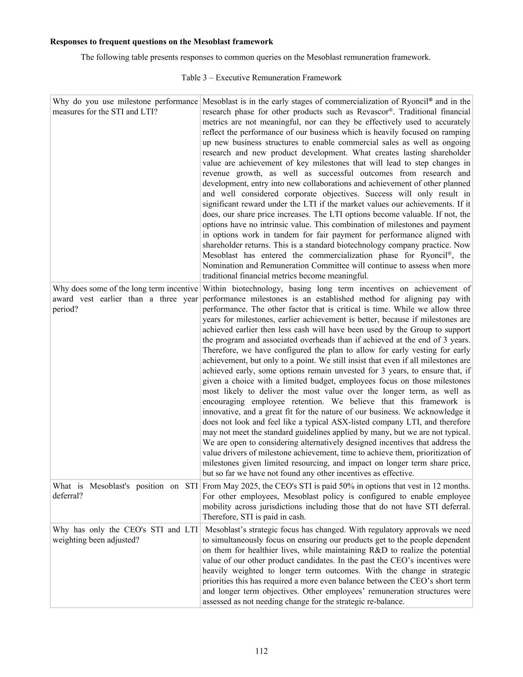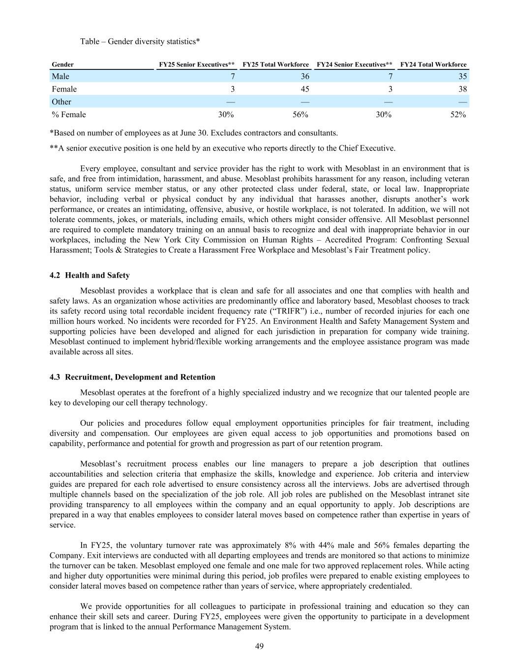 Table – Gender diversity statistics* Gender FY25 Senior Executives** FY25 Total Workforce FY24 Senior Executives** FY24 Total Workforce Male 7 36 7 35 Female 3 45 3 38 Other — — — — % Female 30% 56% 30% 52% *Based on number of employees as at June 30. Excludes contractors and consultants. **A senior executive position is one held by an executive who reports directly to the Chief Executive. Every employee, consultant and service provider has the right to work with Mesoblast in an environment that is safe, and free from intimidation, harassment, and abuse. Mesoblast prohibits harassment for any reason, including veteran status, uniform service member status, or any other protected class under federal, state, or local law. Inappropriate behavior, including verbal or physical conduct by any individual that harasses another, disrupts another’s work performance, or creates an intimidating, offensive, abusive, or hostile workplace, is not tolerated. In addition, we will not tolerate comments, jokes, or materials, including emails, which others might consider offensive. All Mesoblast personnel are required to complete mandatory training on an annual basis to recognize and deal with inappropriate behavior in our workplaces, including the New York City Commission on Human Rights – Accredited Program: Confronting Sexual Harassment; Tools & Strategies to Create a Harassment Free Workplace and Mesoblast’s Fair Treatment policy. 4.2 Health and Safety Mesoblast provides a workplace that is clean and safe for all associates and one that complies with health and safety laws. As an organization whose activities are predominantly office and laboratory based, Mesoblast chooses to track its safety record using total recordable incident frequency rate (“TRIFR”) i.e., number of recorded injuries for each one million hours worked. No incidents were recorded for FY25. An Environment Health and Safety Management System and supporting policies have been developed and aligned for each jurisdiction in preparation for company wide training. Mesoblast continued to implement hybrid/flexible working arrangements and the employee assistance program was made available across all sites. 4.3 Recruitment, Development and Retention Mesoblast operates at the forefront of a highly specialized industry and we recognize that our talented people are key to developing our cell therapy technology. Our policies and procedures follow equal employment opportunities principles for fair treatment, including diversity and compensation. Our employees are given equal access to job opportunities and promotions based on capability, performance and potential for growth and progression as part of our retention program. Mesoblast’s recruitment process enables our line managers to prepare a job description that outlines accountabilities and selection criteria that emphasize the skills, knowledge and experience. Job criteria and interview guides are prepared for each role advertised to ensure consistency across all the interviews. Jobs are advertised through multiple channels based on the specialization of the job role. All job roles are published on the Mesoblast intranet site providing transparency to all employees within the company and an equal opportunity to apply. Job descriptions are prepared in a way that enables employees to consider lateral moves based on competence rather than expertise in years of service. In FY25, the voluntary turnover rate was approximately 8% with 44% male and 56% females departing the Company. Exit interviews are conducted with all departing employees and trends are monitored so that actions to minimize the turnover can be taken. Mesoblast employed one female and one male for two approved replacement roles. While acting and higher duty opportunities were minimal during this period, job profiles were prepared to enable existing employees to consider lateral moves based on competence rather than years of service, where appropriately credentialed. We provide opportunities for all colleagues to participate in professional training and education so they can enhance their skill sets and career. During FY25, employees were given the opportunity to participate in a development program that is linked to the annual Performance Management System. 49